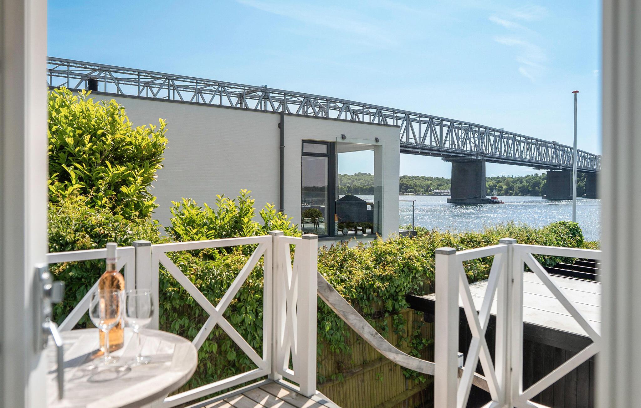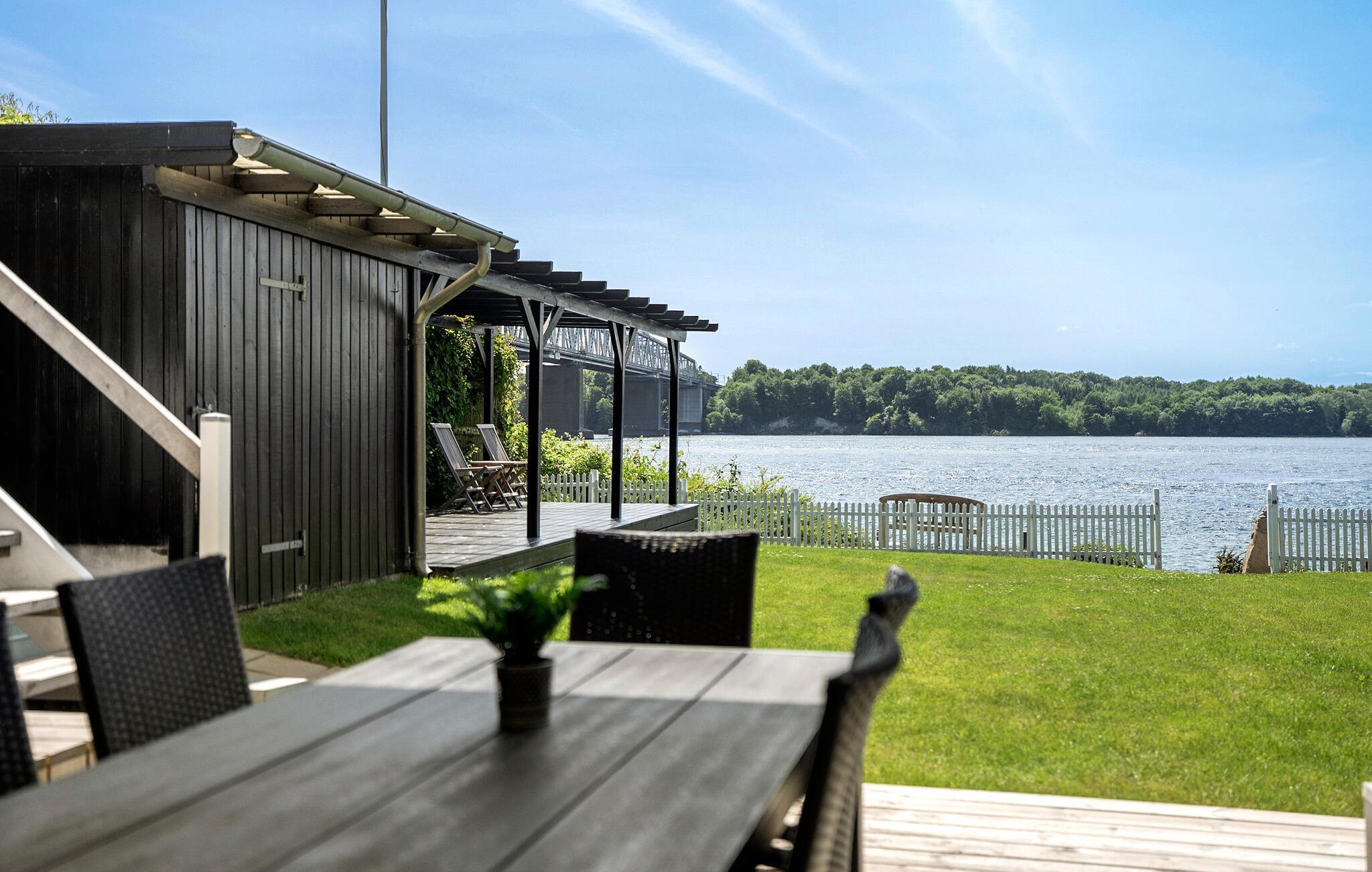 Velkommen til en helt unik beliggenhed lige ud til Lillebælt og den ikoniske bro. Dette velindrettede feriehus kombinerer moderne komfort med nostalgisk sommerhuscharme og et panorama, der gør hver dag til noget særligt. Nyd det åbne stueplan med komfortable siddepladser, stilfulde møbler og en brændeovn. Det ser næsten ud som om, at vandet ligger for jeres fødder, når I kigger ud gennem de store vinduer. Sæt jer i lyset fra vinduerne med en god bog eller hyg jer med madlavningen sammen i det moderne køkken. Spiseområdet ud til terrassen giver jer en skøn udsigt over vandet i al slags vejr.