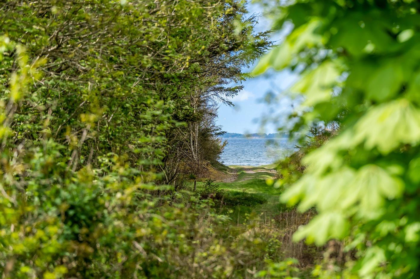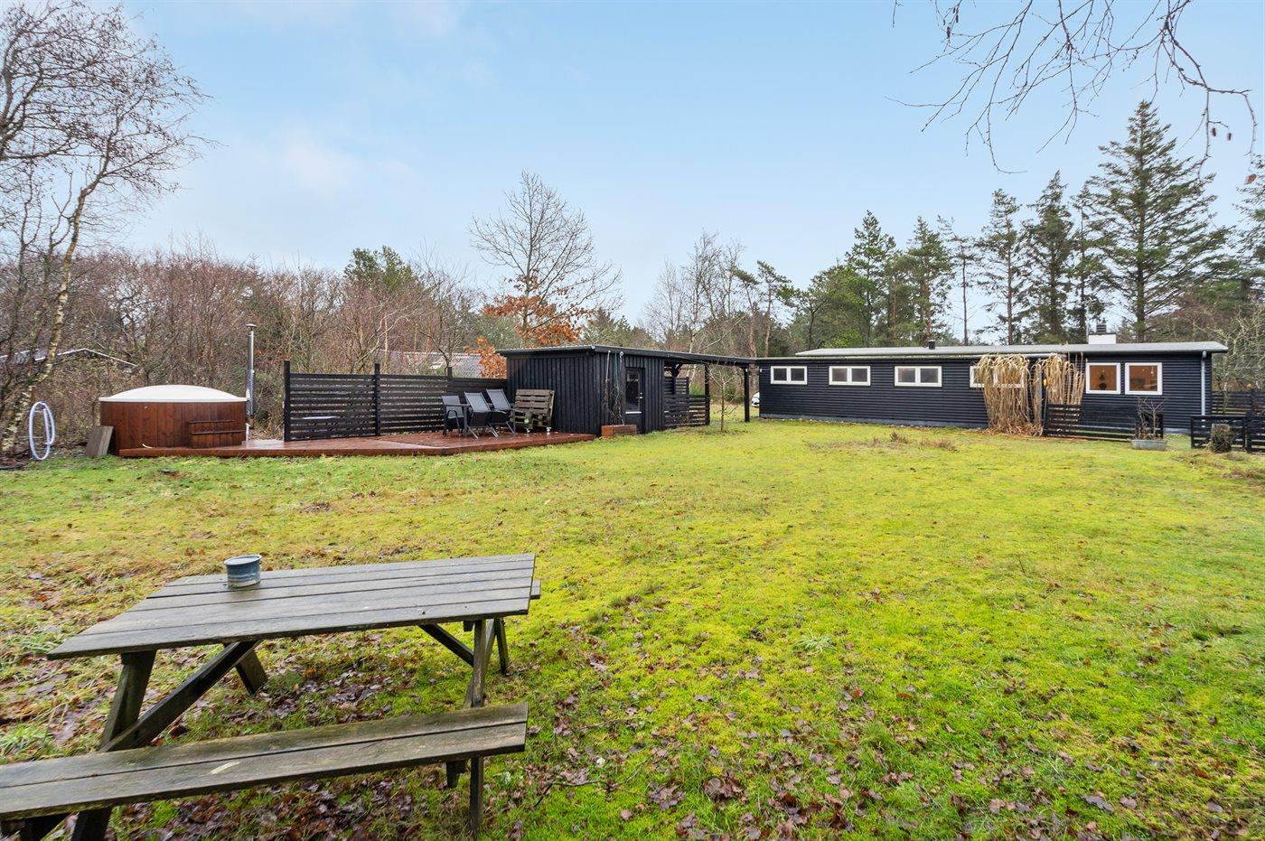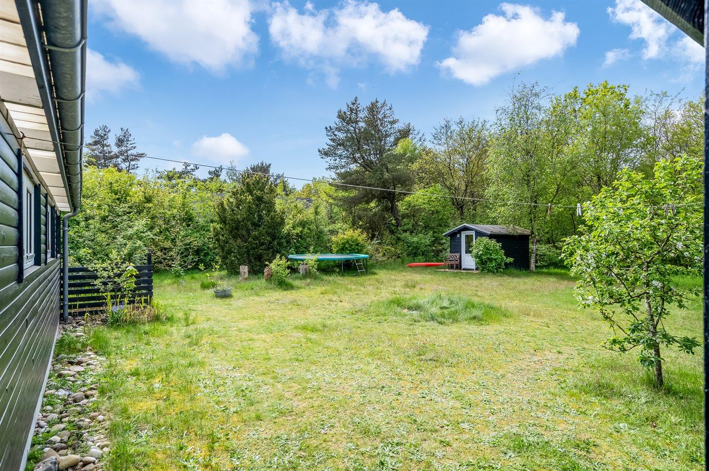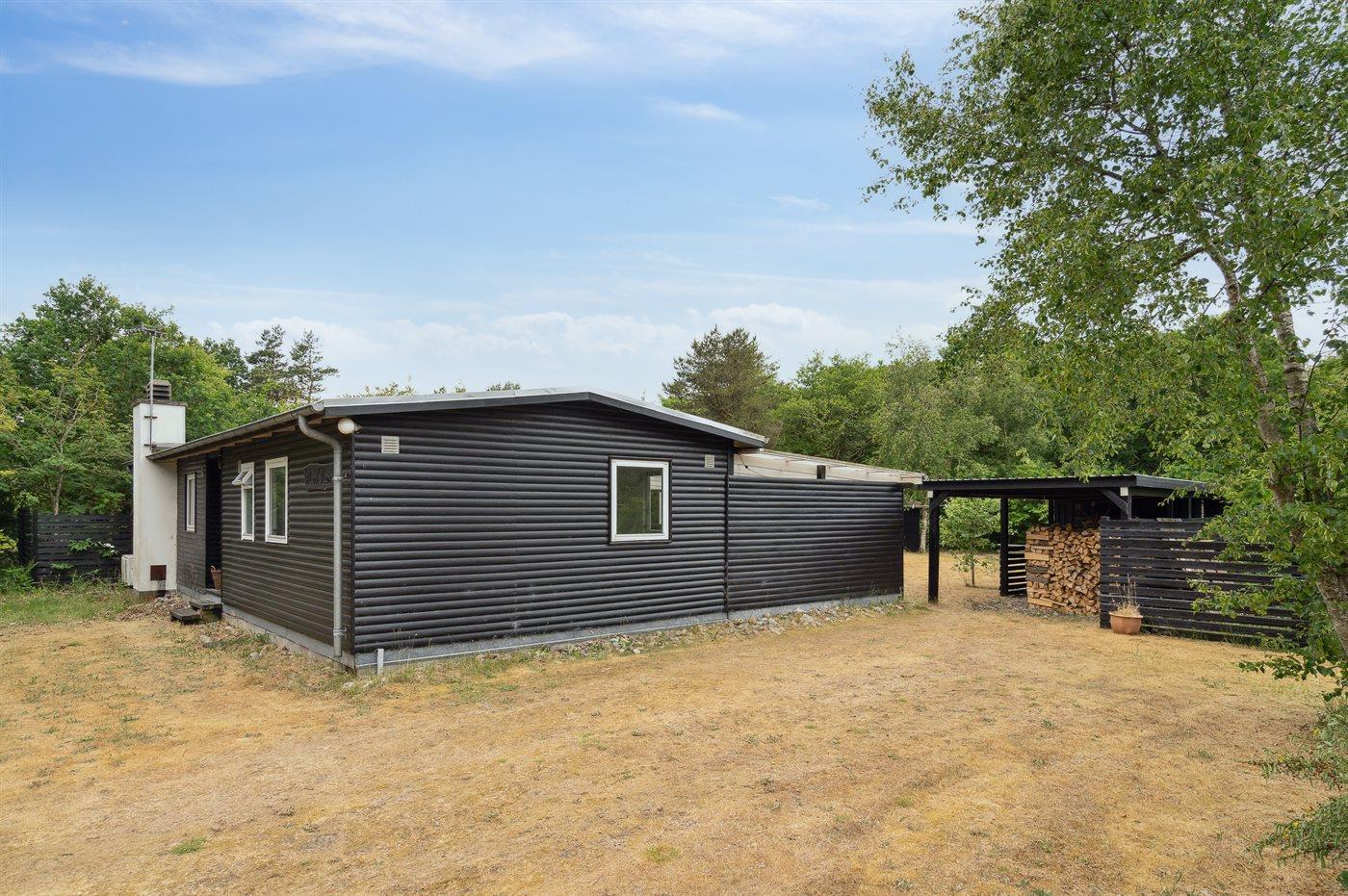 Ferieboligen er beliggende på en 1200 m² stor grund i skov/plantage. Der er 150 m til fjorden. Nærmeste forretning er beliggende i en afstand af 3200 m. Til ferieboligen hører åbent terrasseareal. Desuden er der overdækket terrasse. Der er installeret stik til opladning af elbil. Type 2 stik. Parkering ved ferieboligen.
