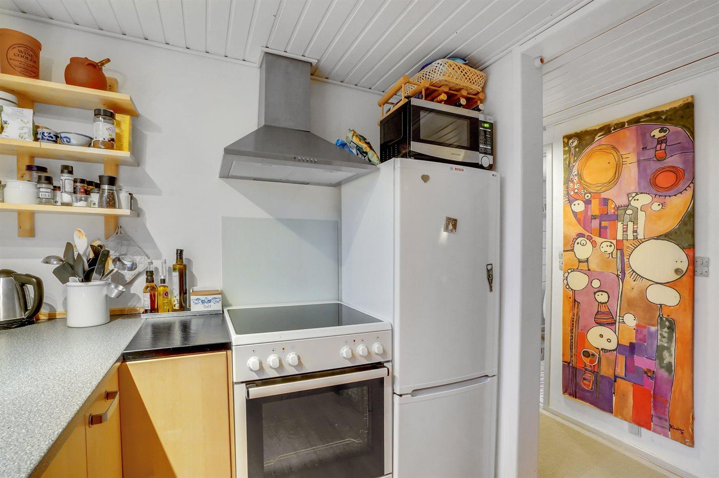 Køkkenet er udstyret med 1 køleskab. Der er 4 keramiske kogeplader, varmluftovn, mikrobølgeovn samt opvaskemaskine.