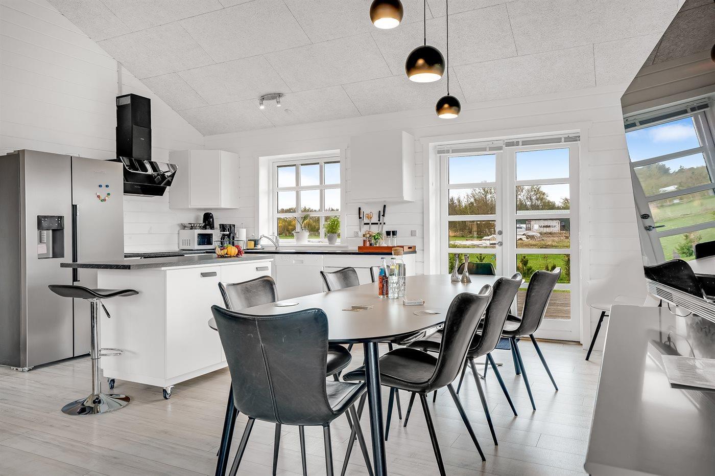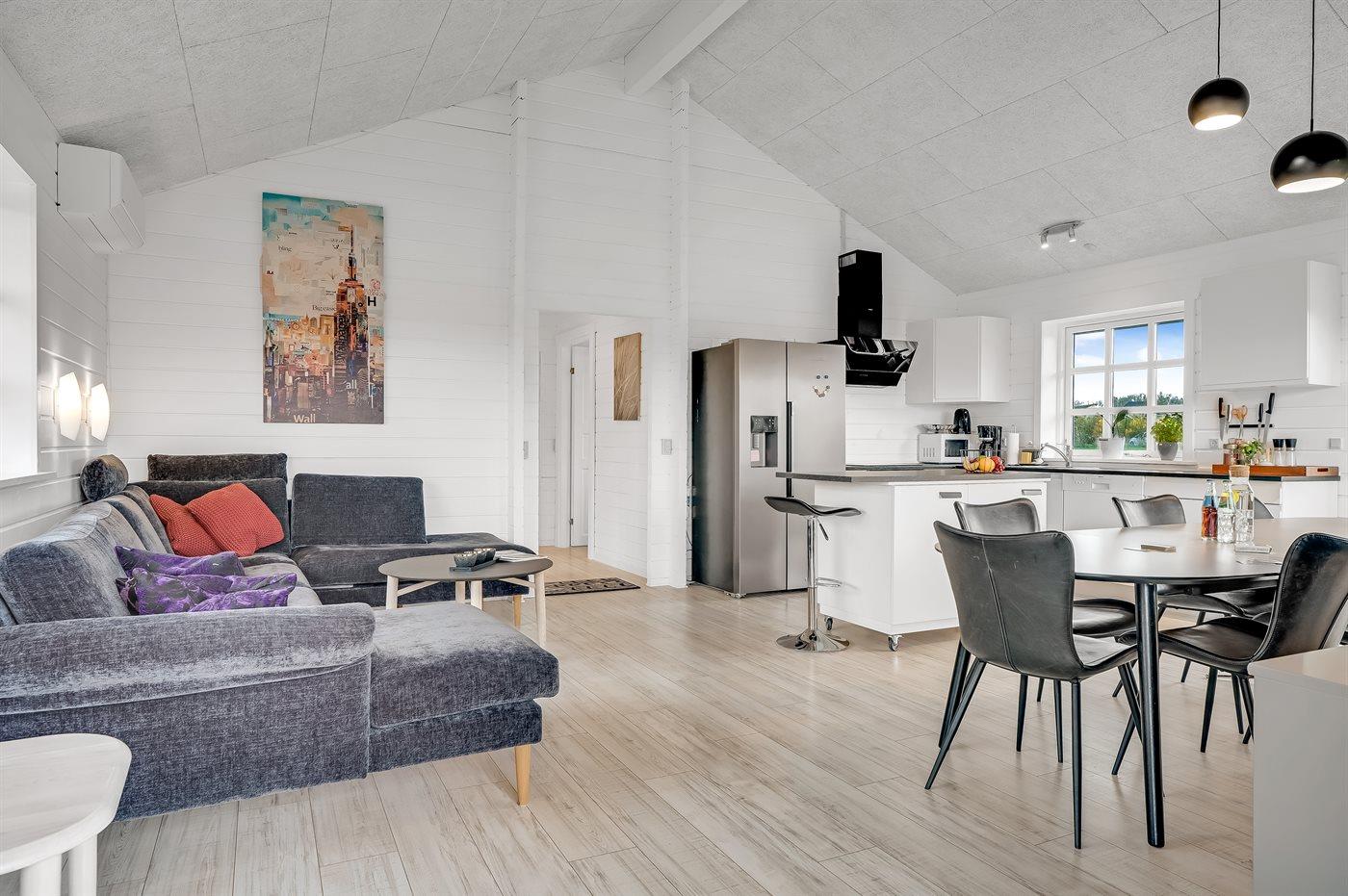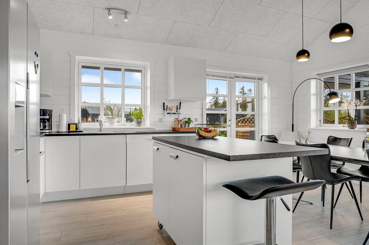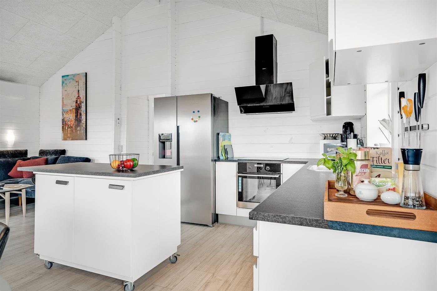 Køkkenet er udstyret med 1 amerikansk køleskab. Der er 4 induktionskogeplader, varmluftovn, mikrobølgeovn samt opvaskemaskine.