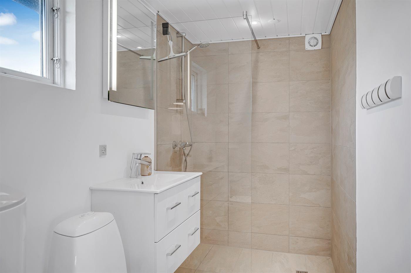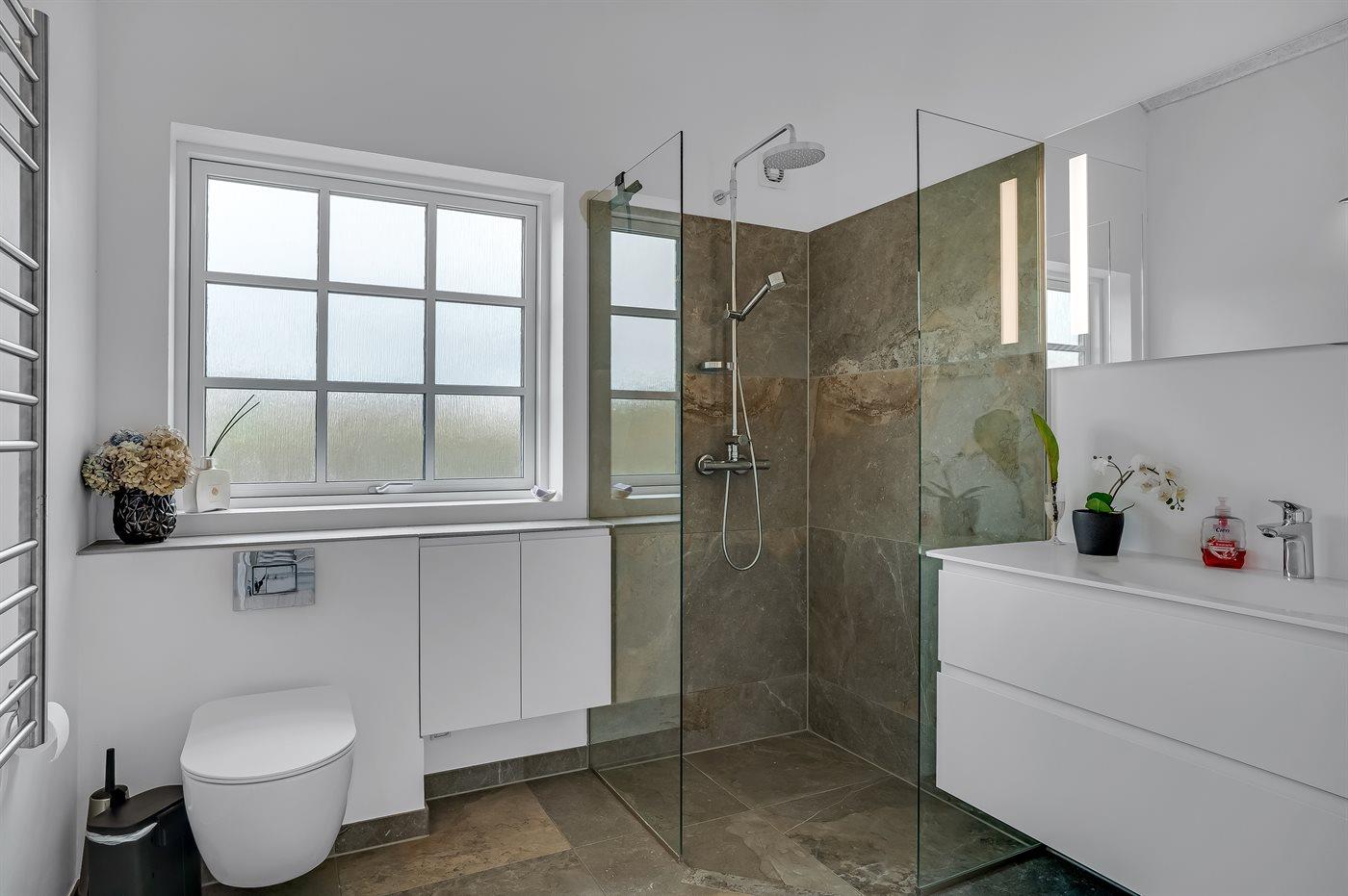 Der er 2 badeværelser med bruseniche og 2 toiletter. Der er gulvvarme på 2 badeværelser.