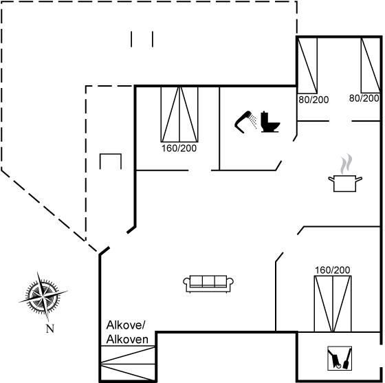 Bemærk, at der er 8 sovepladser i huset, men at det kun må bebos af max. 6 personer og et lille barn 0-3 år, da alkoven i stuen er mest egnet som en hyggekrog.
