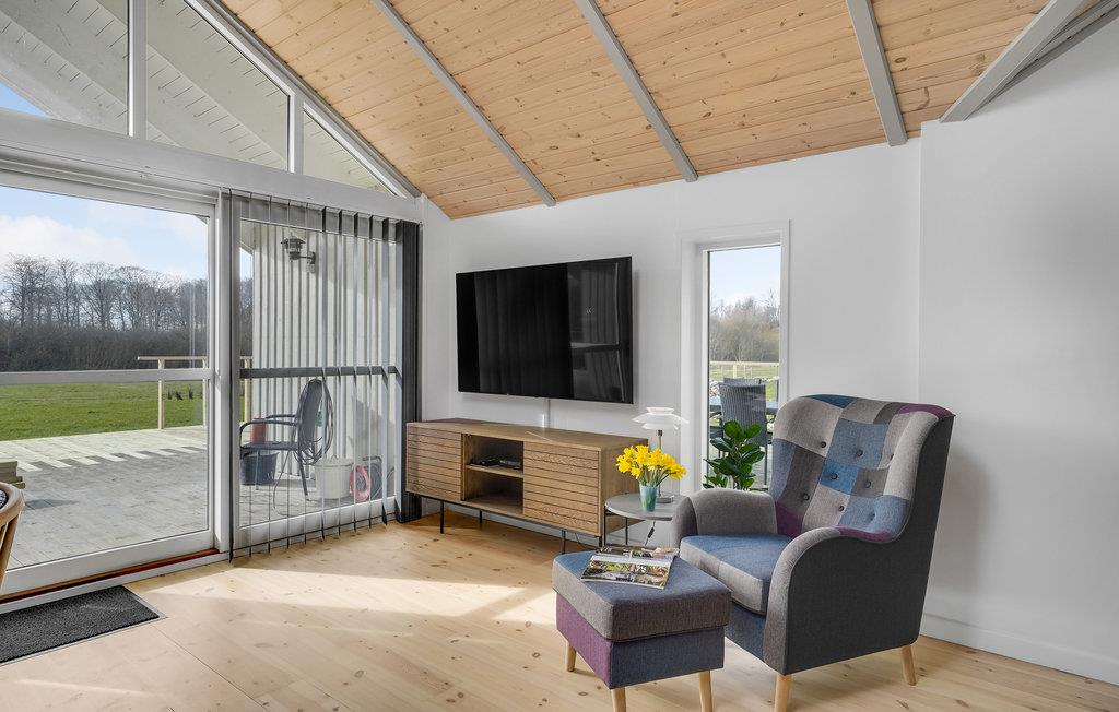 Lyst og moderne træhus i Spodsbjerg med stort aktivitetsrum, sauna og spabad tæt på hav og fiskemuligheder.