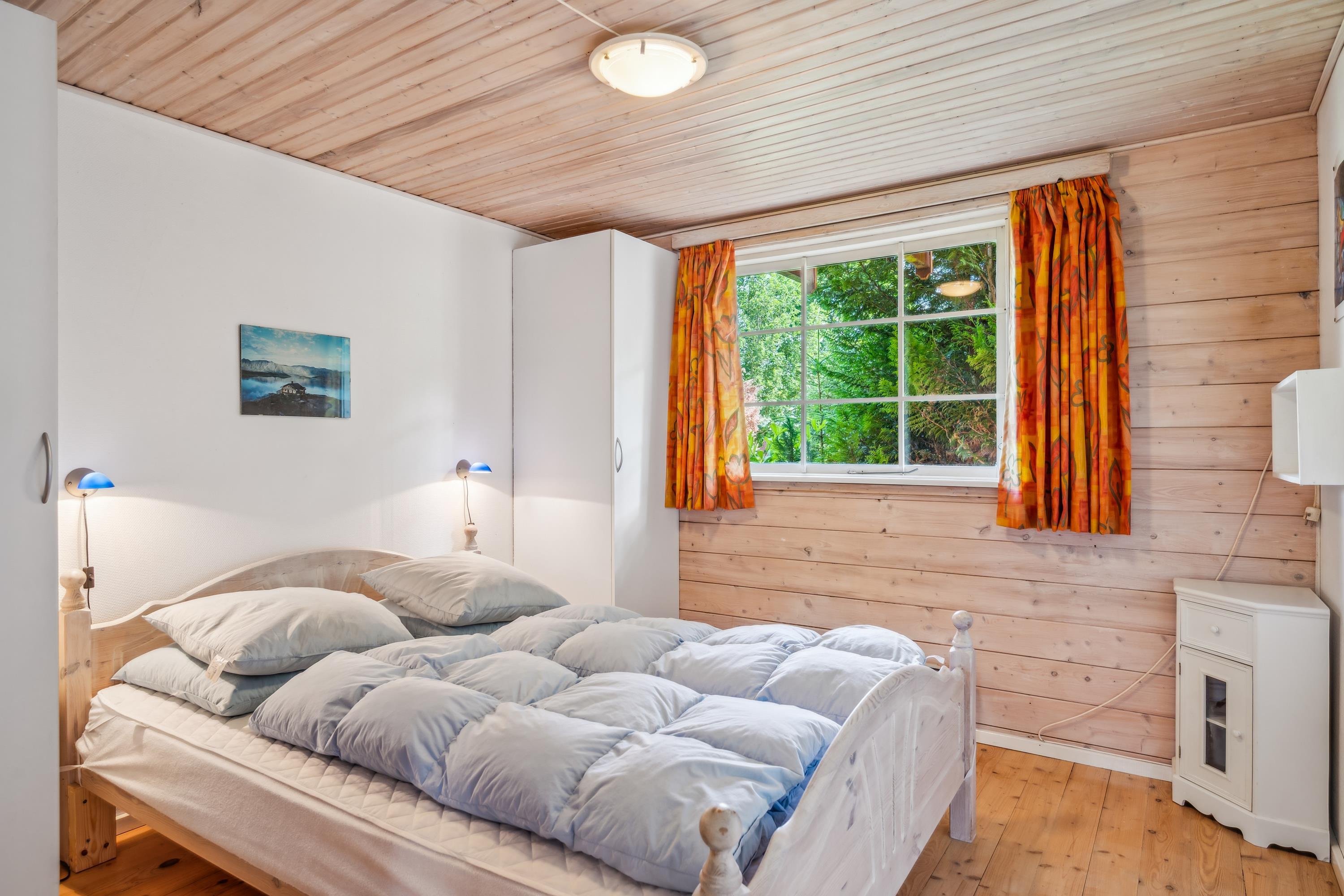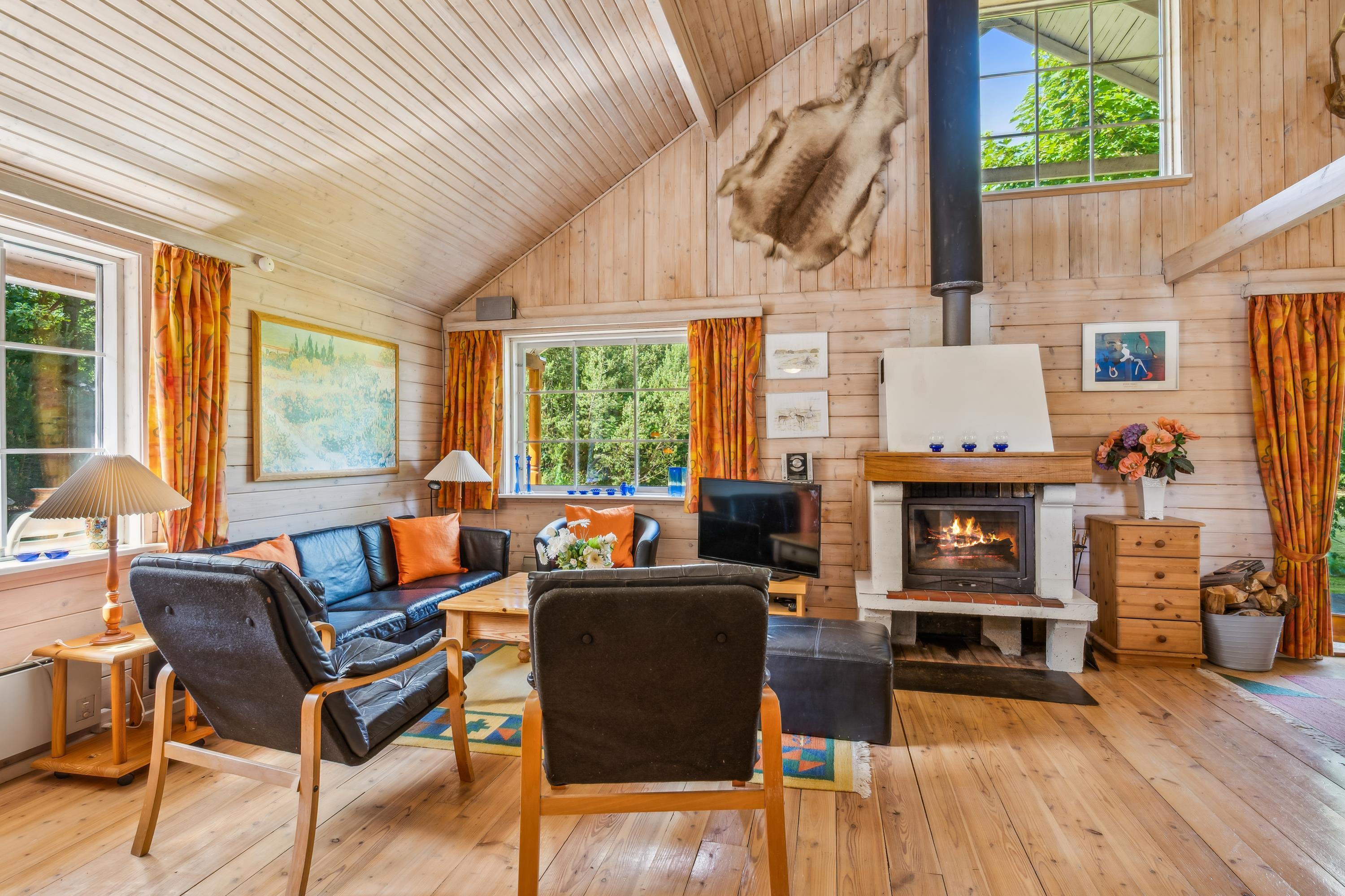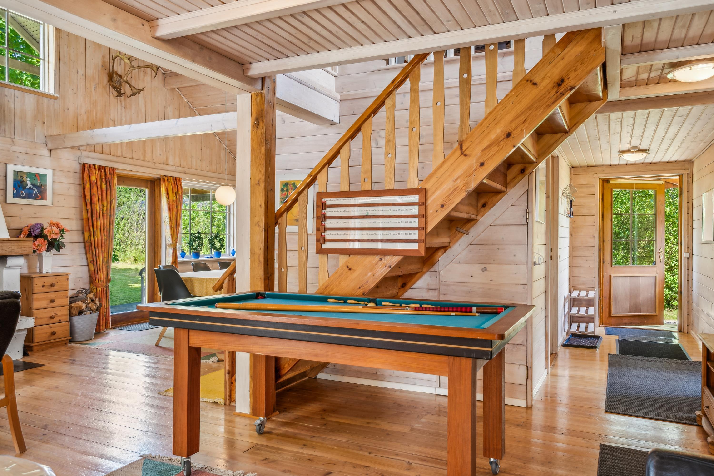 Den rustikke atmosfære i den store, lyse stue med åbent til kip understreges af de synlige loftsbjælker og den flotte pejs med pejseindsats. Dejligt lounge-hjørne med TV med danske (inkl. TV2) og tyske kanaler, CD-afspiller og radio samt spiseplads til 8 personer. Godt køkken i åben forbindelse med stuen og udstyret med keramiske kogeplader, ovn, køle-/fryseskab, opvaskemaskine og mikrobølgeovn. Ved siden af stuen ligger den store, velmøblerede havestue med flisegulv med gulvvarme og udgang til fliseterrasse. Husets 8 sovepladser fordeler sig på 2 værelser i stueplan og 1 værelse på 1. sal, alle med dobbeltseng, samt en hems med 2 enkeltsenge. Værelset på 1. sal har desuden udgang til solaltan, og på hemsen er der aktivitetshjørne med bordfodbold. Under trappen er der desuden et lille billardbord, som kan rulles ud. I stueplan finder man to lækre flisebadeværelser, begge med bruseniche og gulvvarme, det mindste desuden med vaskemaskine og tørretumbler, mens det største er udstyret med spabad og sauna. Der er barneseng og højstol til de mindste. Internetadgang. Et hus, hvor der er kælet for detaljerne.