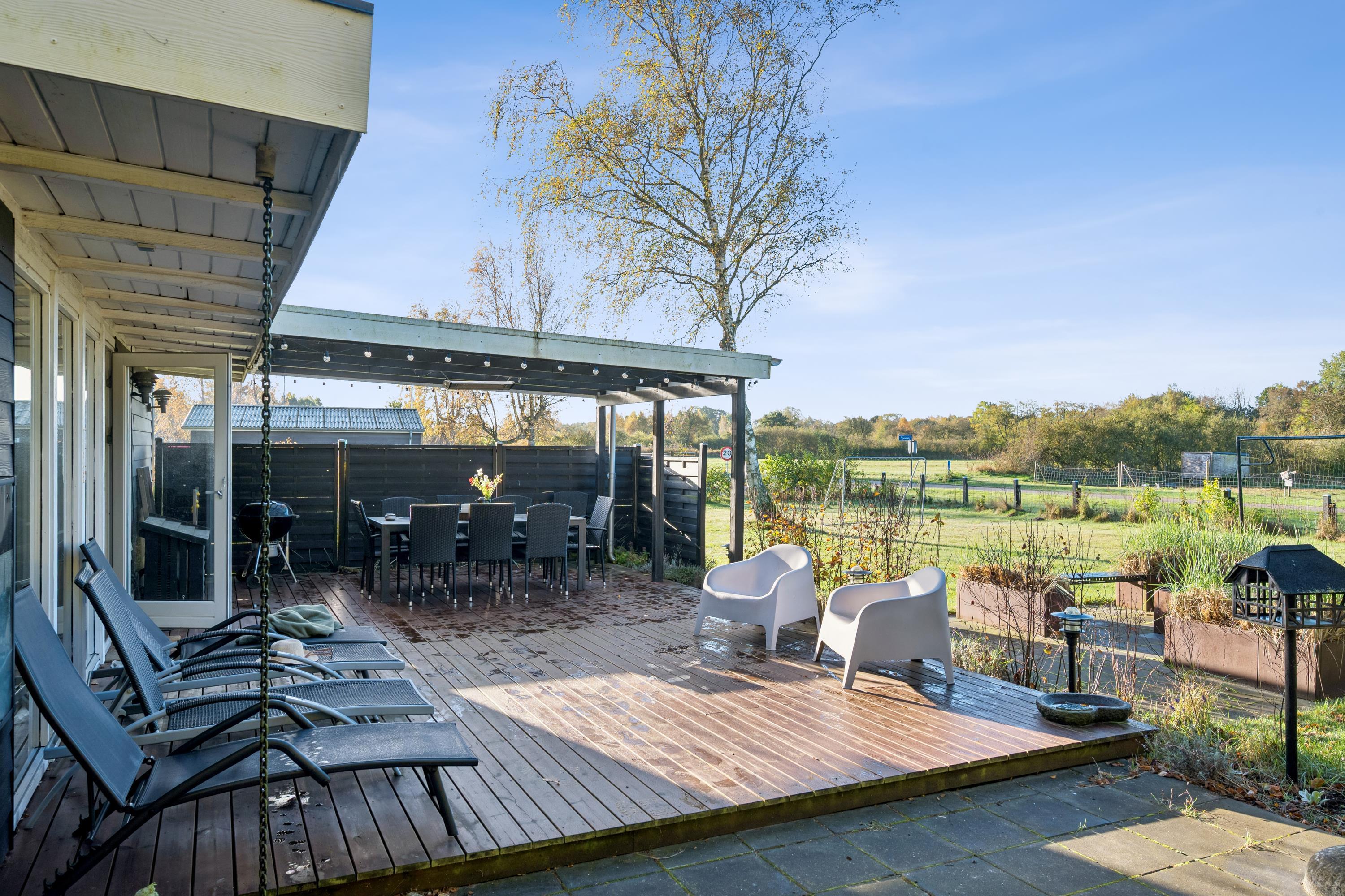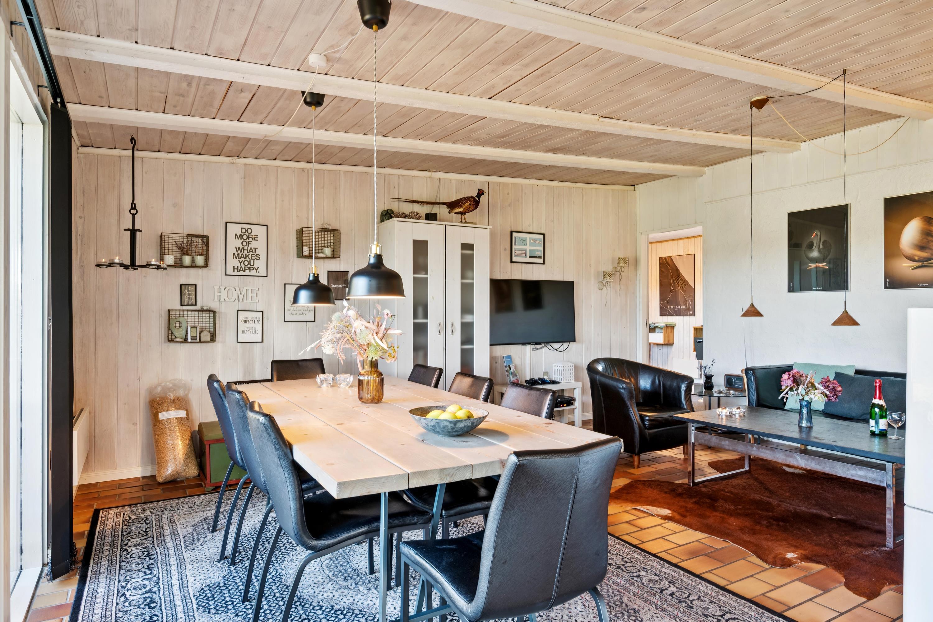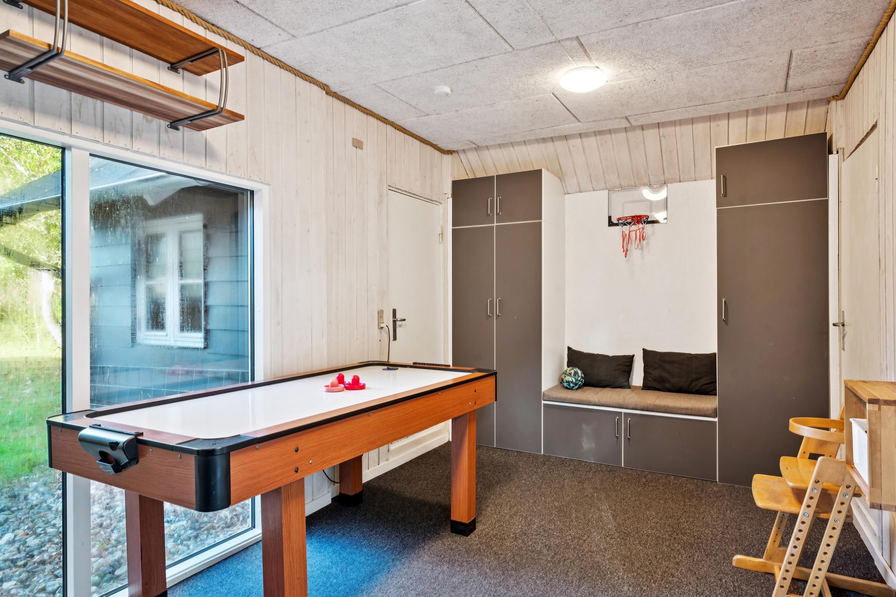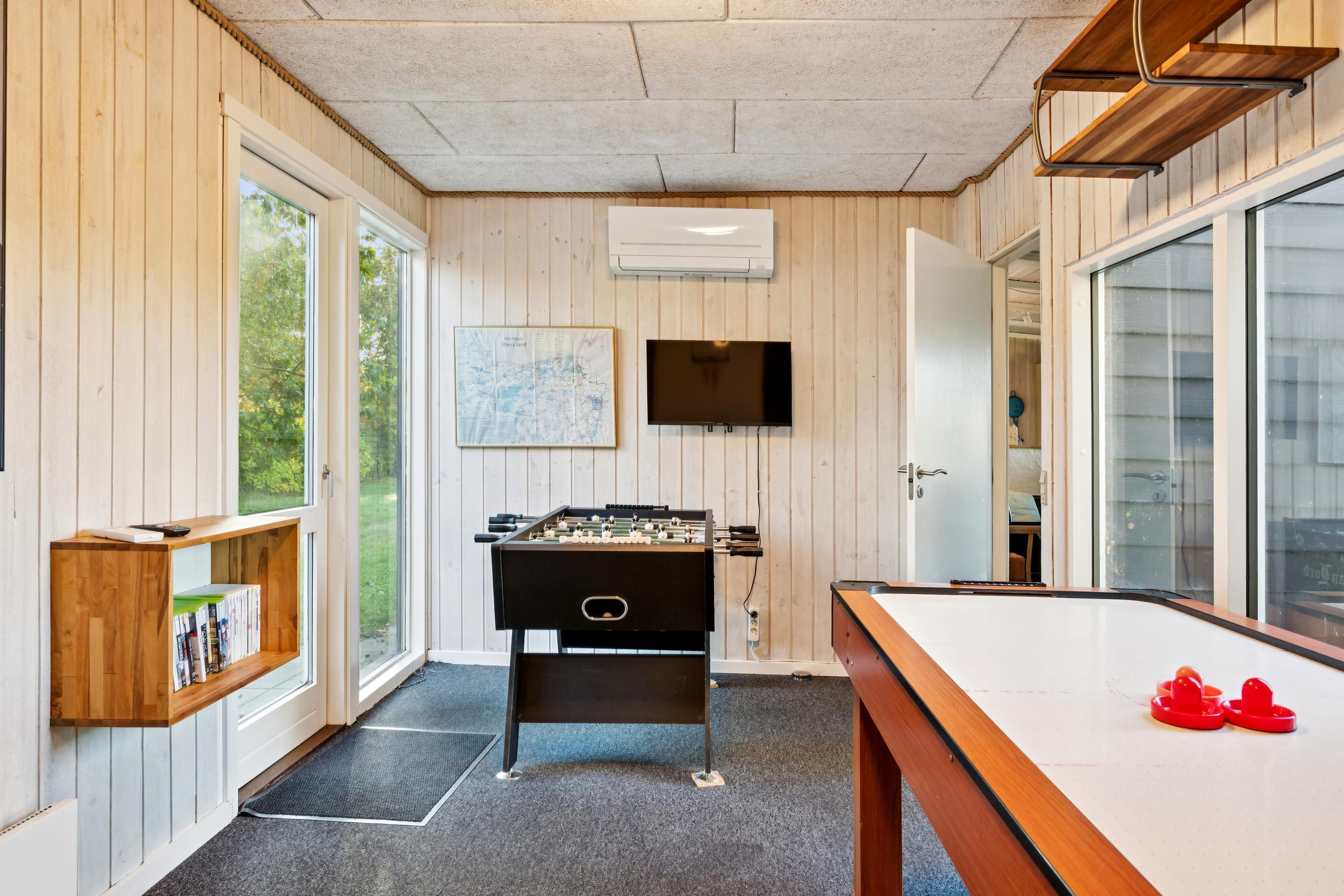 I den smukke natur ved St. Sjørup finder man dette hyggelige sommerhus. Her finder man en lys og hyggelig indrettet stue med b.la. brændeovn og varmepumpe. I forbindelse med stuen finder man det gode og funktionelle køkken med b.la. opvaskemaskine. Fra køkkenafdelingen er der direkte udgang til en skøn overdækket terrasse med havemøbler og grill. Rummeligt badeværelse med bruseniche og hvor der er adgang til både vaskemaskine og tørretumbler. Husets otte sovepladser finder man i fire værelser, alle med dobbeltsenge. Til de aktive feriegæster er der et separat rum med airhockey, bordfodbold, Wii og Xbox. Perfekt til en regnvejrsdag indendørs. Til de små feriegæster er der en høj barnestol og en barneseng. Huset er beliggende på en stor indhegnet grund og med stor græsplæne- velegnet til leg og boldspil hvor man også finder et fodboldmål. Der findes også en hyggelig bålplads, hvor man en dejlig sommeraften kan sidde og lave snobrød og skumfiduser. Til lystfiskeren findes en udendørs renseplads