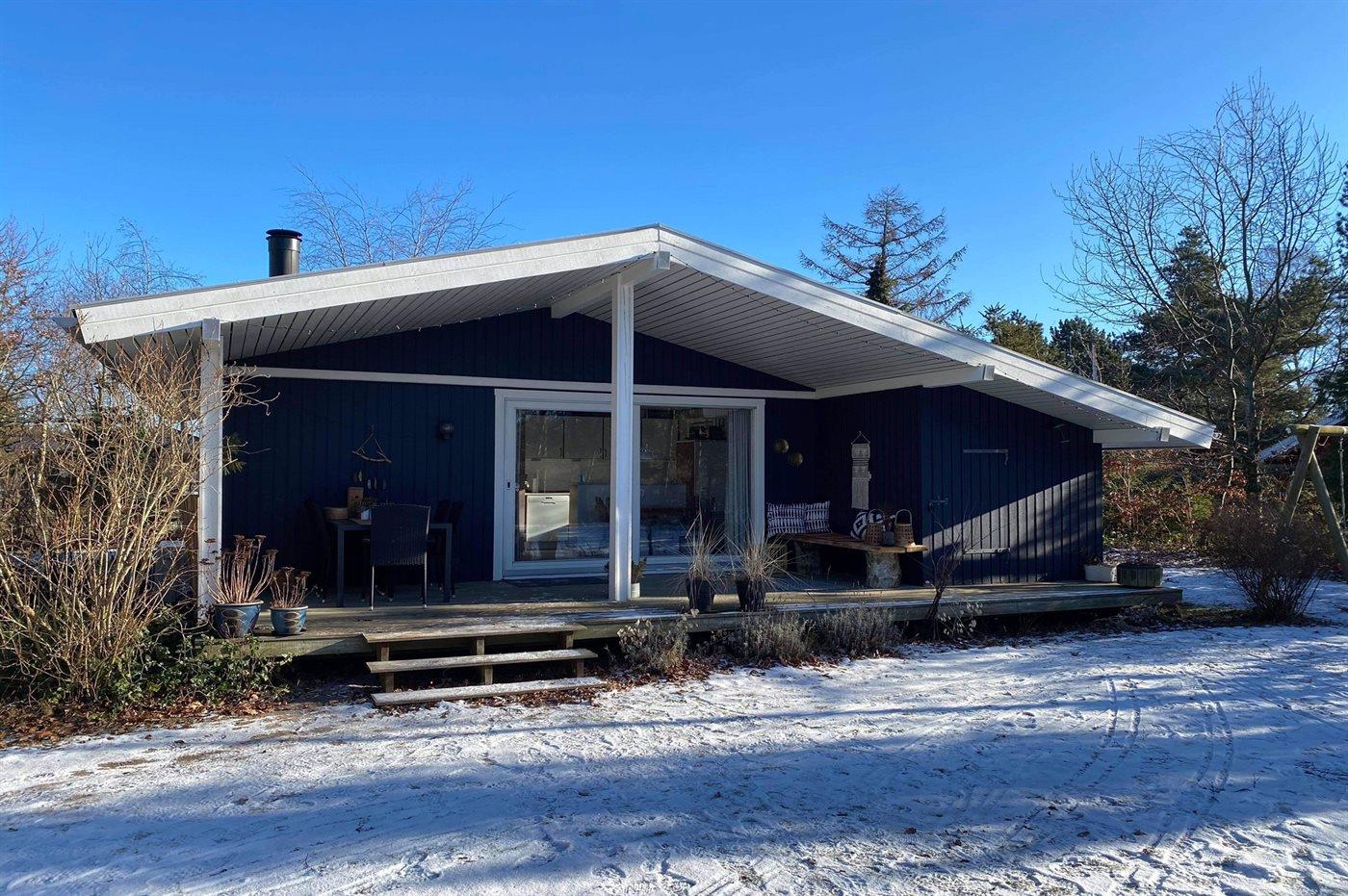 Hyggeligt sommerhus med rolig beliggenhed nær vandet, komplet med terrasse, bålsted og elbilopladning.