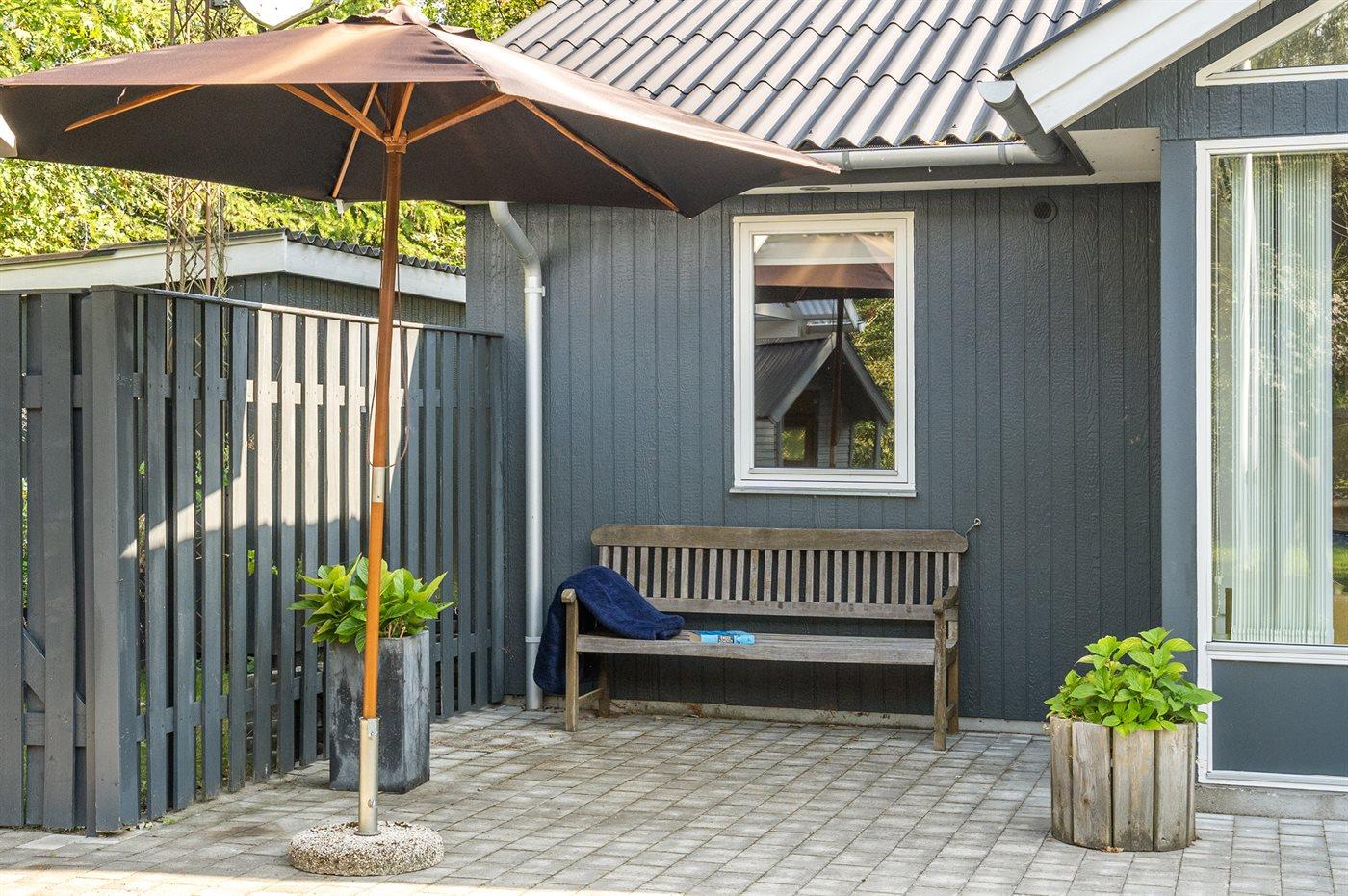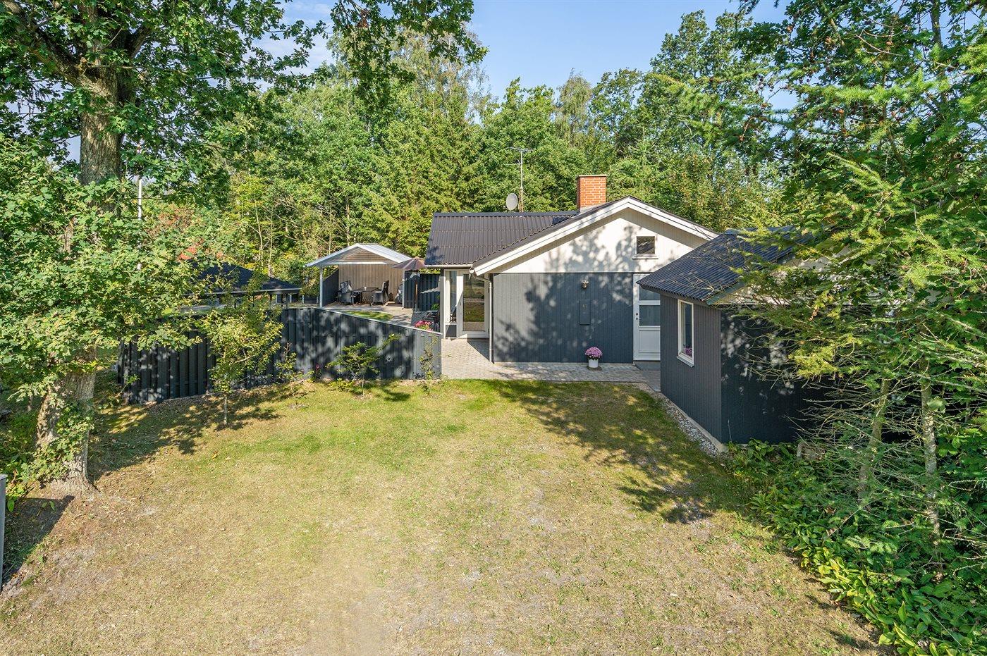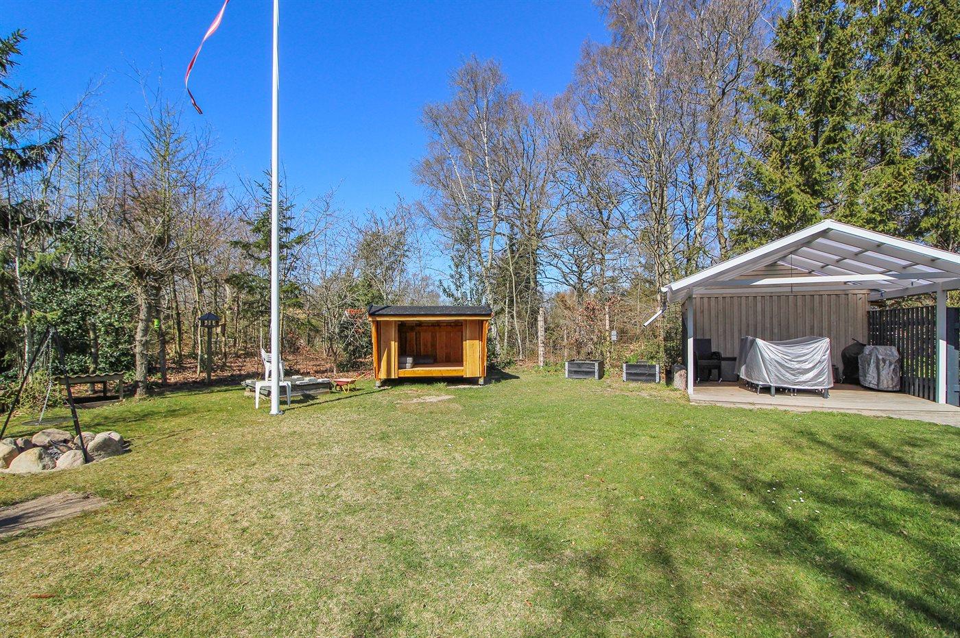 Ferieboligen er beliggende på en 1200 m² stor naturgrund. Der er 300 m til havet. Nærmeste forretning er beliggende i en afstand af 5000 m. Til ferieboligen hører 40 m² terrasseareal. Desuden er der 28 m² overdækket terrasse. Der er redskabsrum. Gynge. Sandkasse. Legehus. Bålsted. Shelter. På lune aftener sørger en udendørs pejs for hyggelig stemning. Grill til rådighed. Parkering ved ferieboligen.