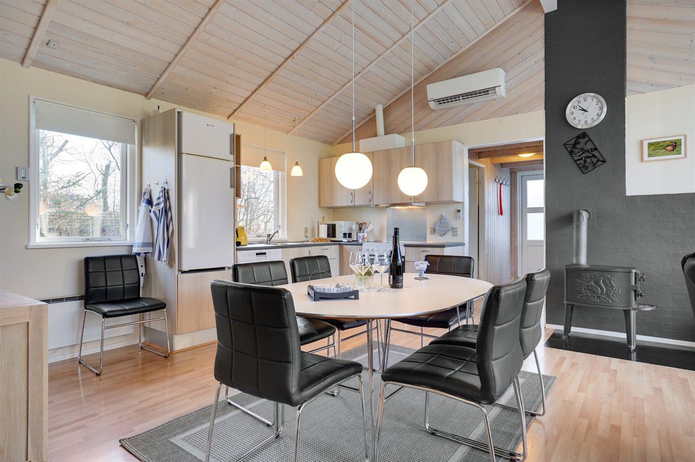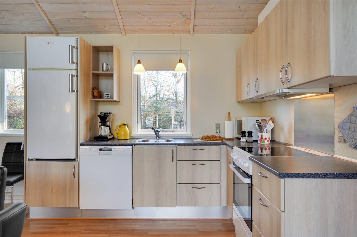 Køkkenet er udstyret med 1 køleskab. Der er 4 keramiske kogeplader, varmluftovn, mikrobølgeovn samt opvaskemaskine.