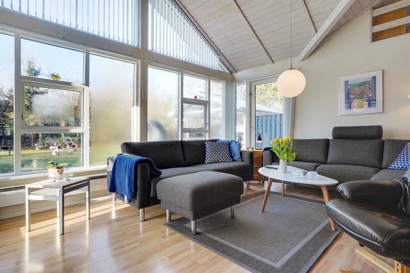 Rummeligt sommerhus i naturskønne omgivelser nær vandet med store terrassearealer og hyggelige udendørsfaciliteter.