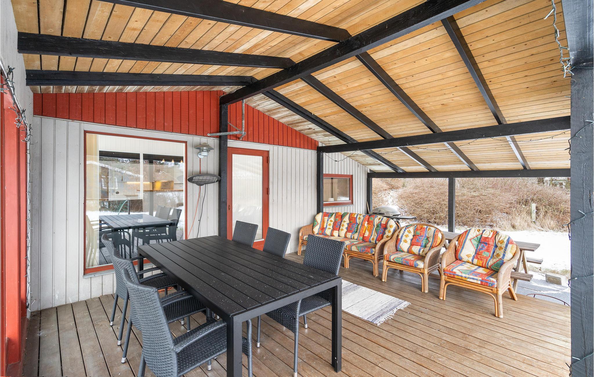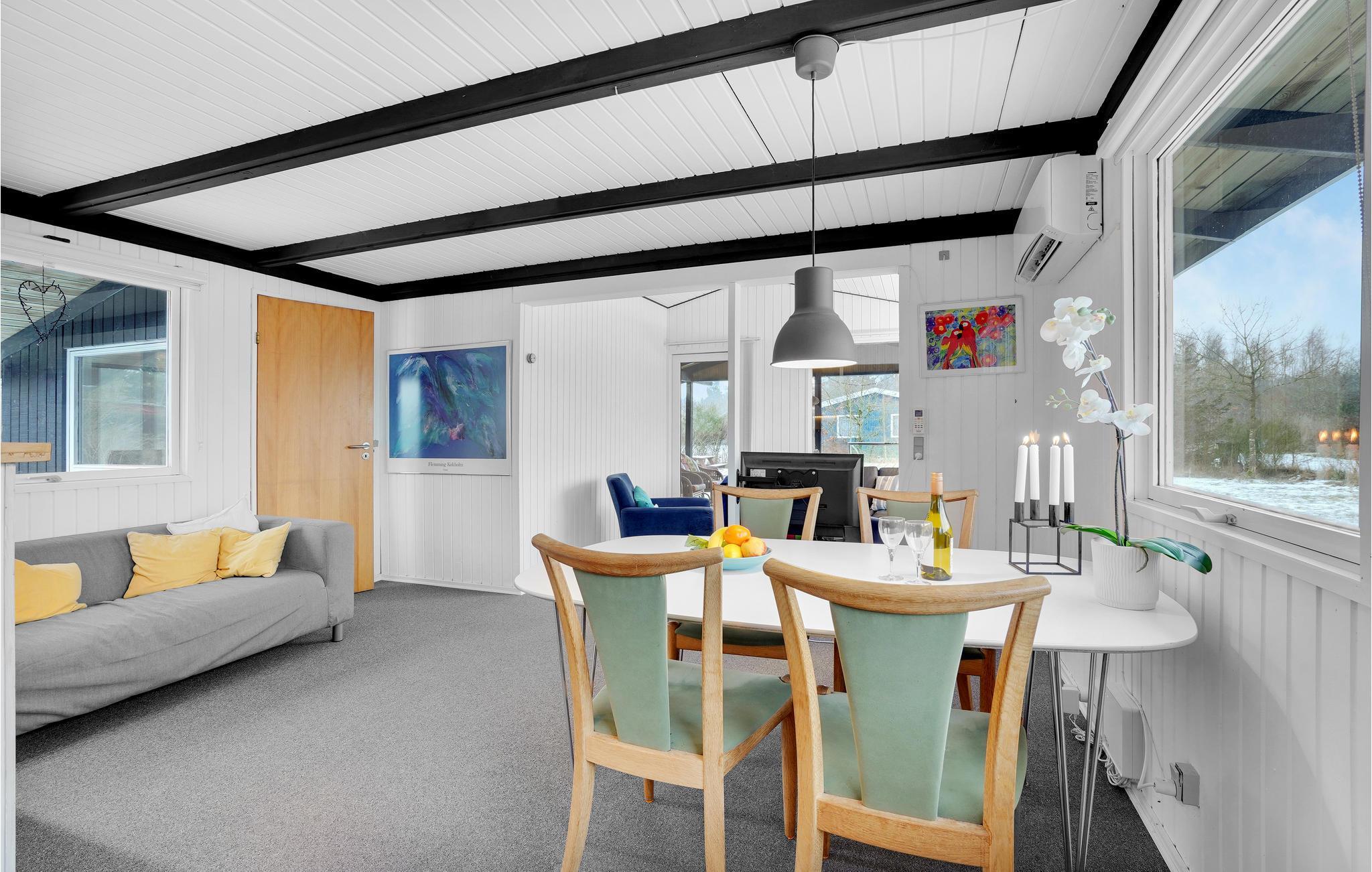 Dejligt træsommerhus tæt på stranden i Ørsted med moderne møbler og overdækket terrasse.