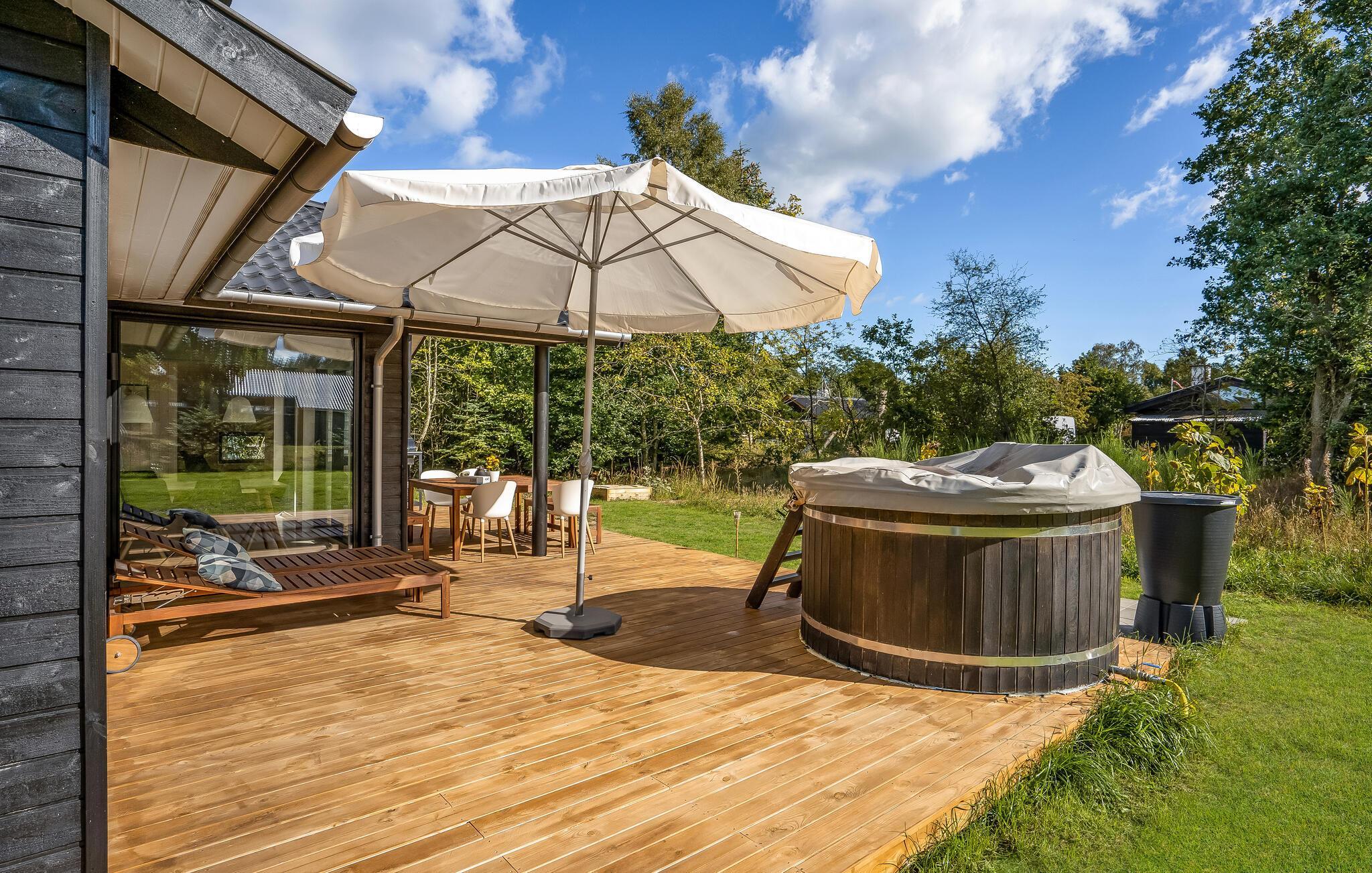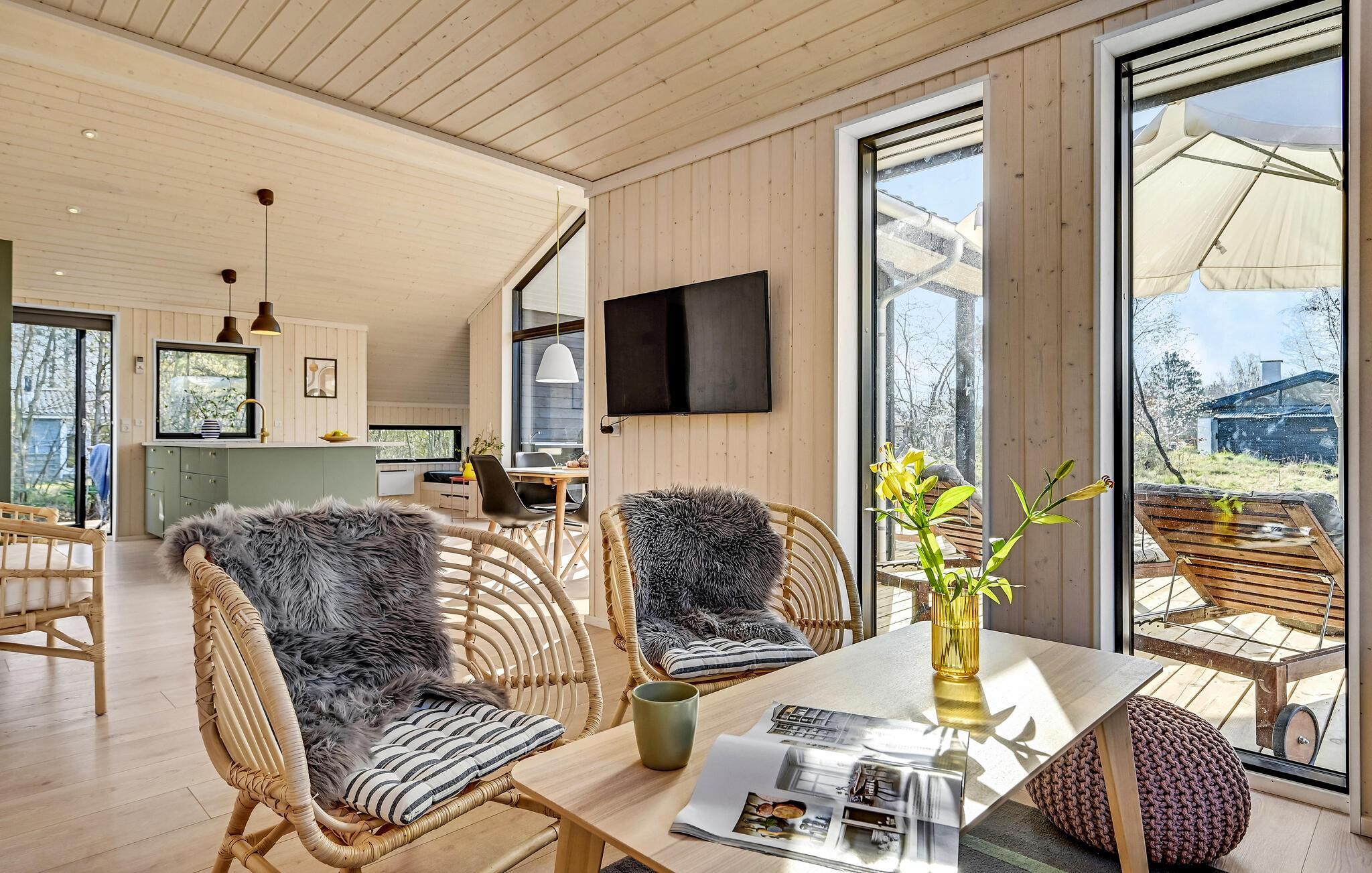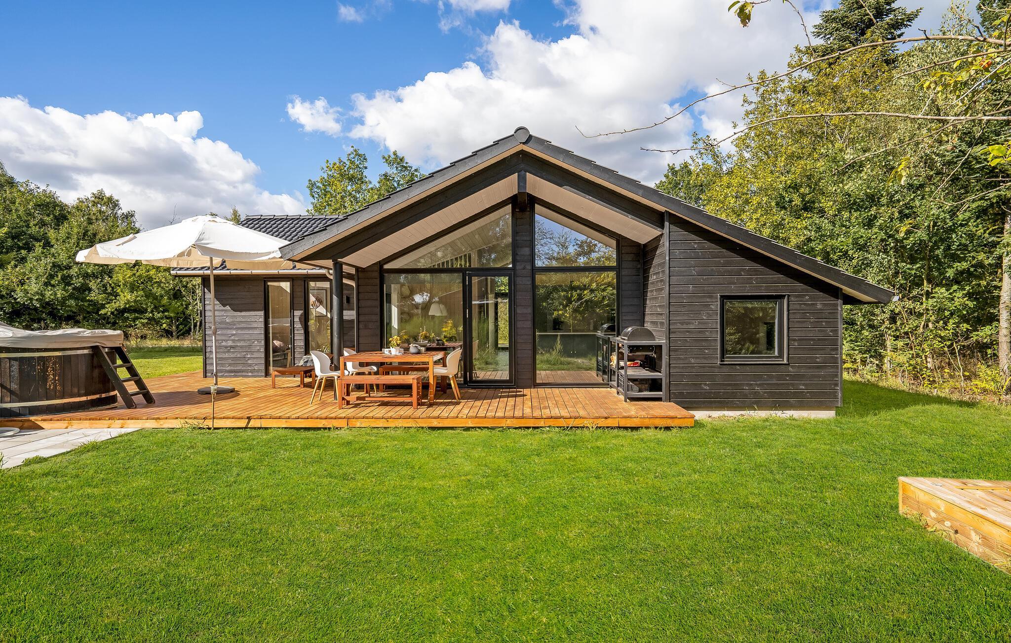 Luksus feriehus i Store Sjørup tæt på strand, med sauna, vildmarksbad og udendørs køkken for afslappende ophold.