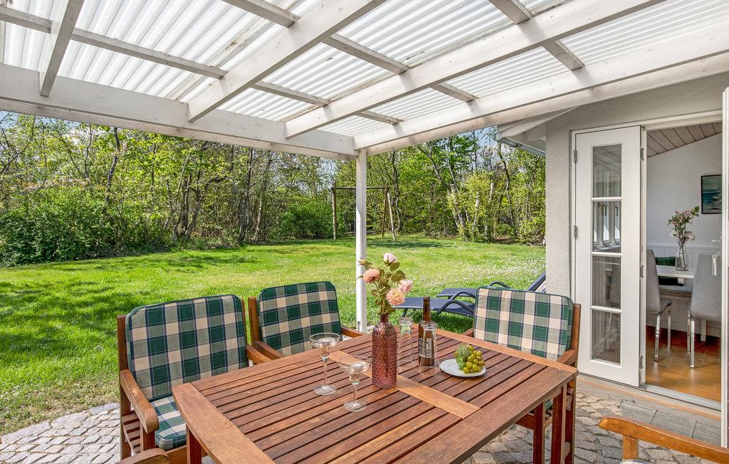 Overdækket og solrig terrasse med grill og havemøbler på rolig grund, med gyngestativ og plads til leg eller afslapning i liggestole.