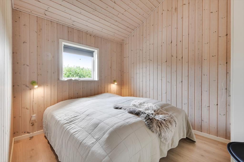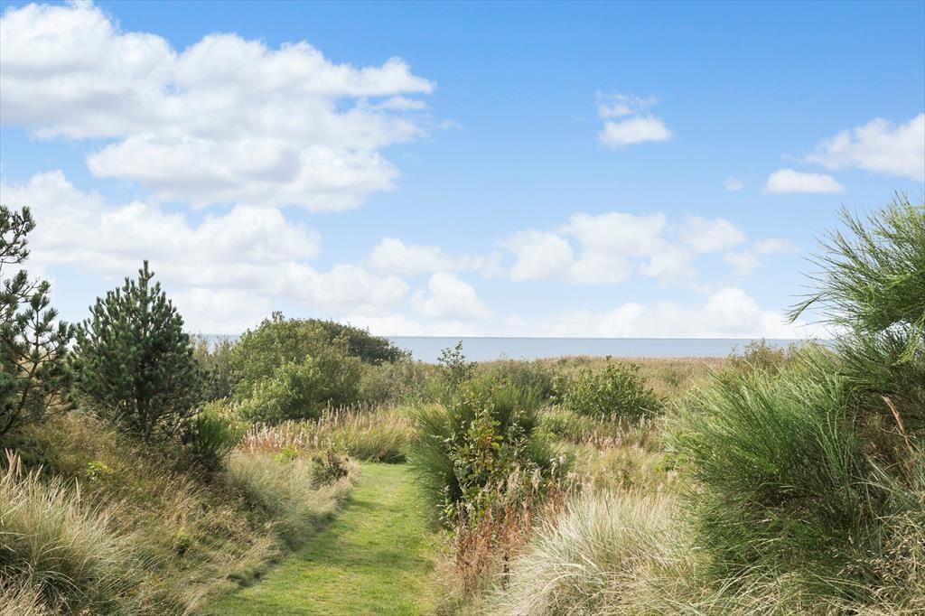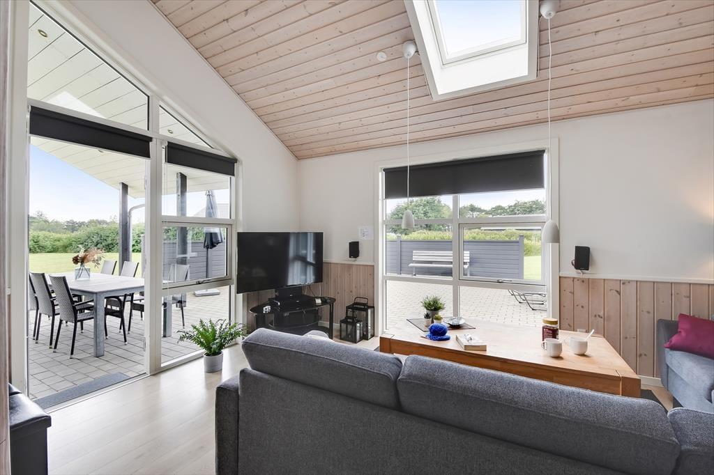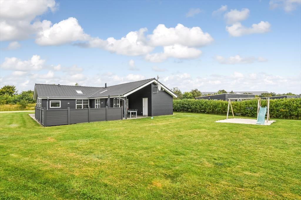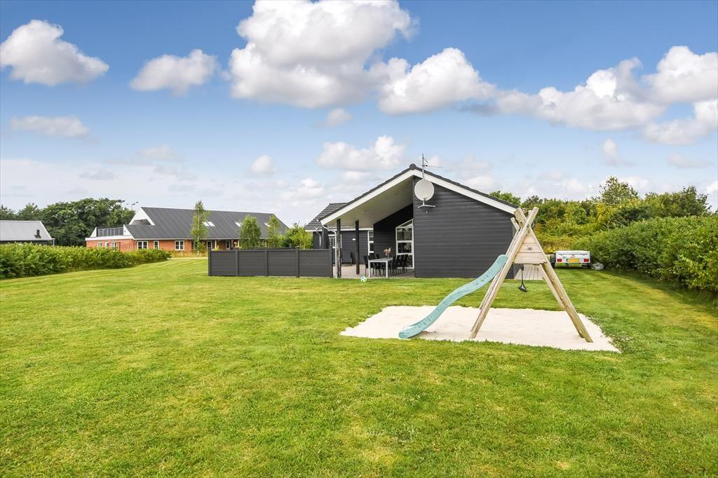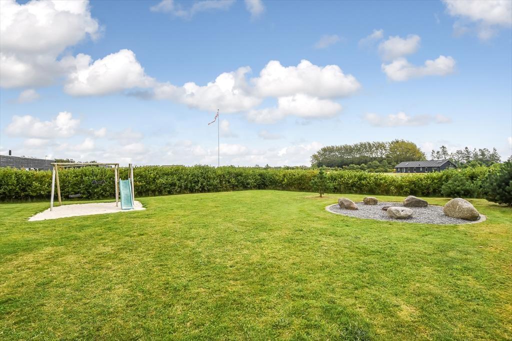 Sommerhuset ligger på en stor og velanlagt grund med en grøn græsplæne og en omkransende hæk. Hvis du har børn med på ferie, vil de sikkert straks få lyst til at smutte ud for at spille bold eller lege fangeleg, og der er også gynger, rutsjebane og sandkasse, som de yngste kan hygge sig med. Bålstedet er et hyggeligt sted at samles hele familien for at bage snobrød eller riste skumfiduser – for eksempel en klar efterårsdag eller en stille aften i sommertusmørket. Den store og delvist overdækkede terrasse indbyder ligeledes til mange gode stunder, uanset om du trænger til at sidde roligt med en kølig iskaffe og en god bog eller dækker op til en festlig frokost med dine kære.
