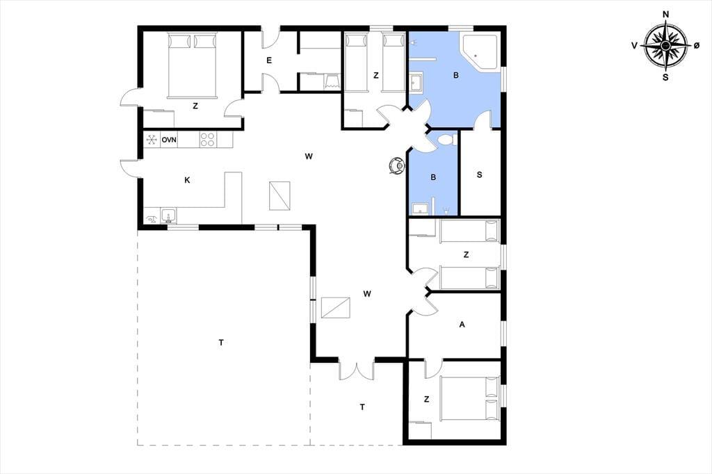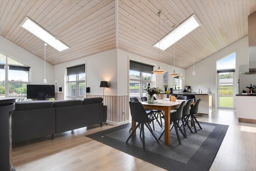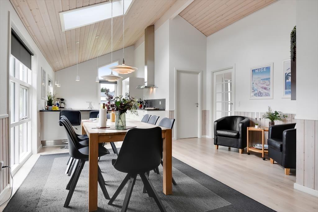 Allerede udefra står det klart, at der er tjek på tingene her på Rørkrogen 10. Sommerhuset præsenterer sig flot med mørk facade og hvide detaljer, og inden døre er atmosfæren lys og let. I opholdsafdelingen er der loft til kip og ovenlysvinduer såvel som store glaspartier, der skaber en god forbindelse til udearealerne. Det åbne køkken har godt med albueplads, så I kan sagtens være flere om at stå for madlavningen – hvis ikke du bare slår dig ned på en af barstolene for at holde kokken med selskab. Med brændeovn og en komfortabel sofaafdeling er der lagt op til masser af indendørs hygge, og når du trænger til at slappe fuldstændigt af, kan du gå i sauna eller tage en tilbagelænet pause i spabadet. Begge dele finder du på det største af husets to badeværelser, der begge ligger centralt placeret. Soveværelser er der fire af, og derfor passer planløsningen glimrende til otte personer.