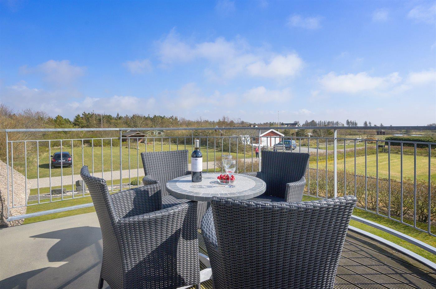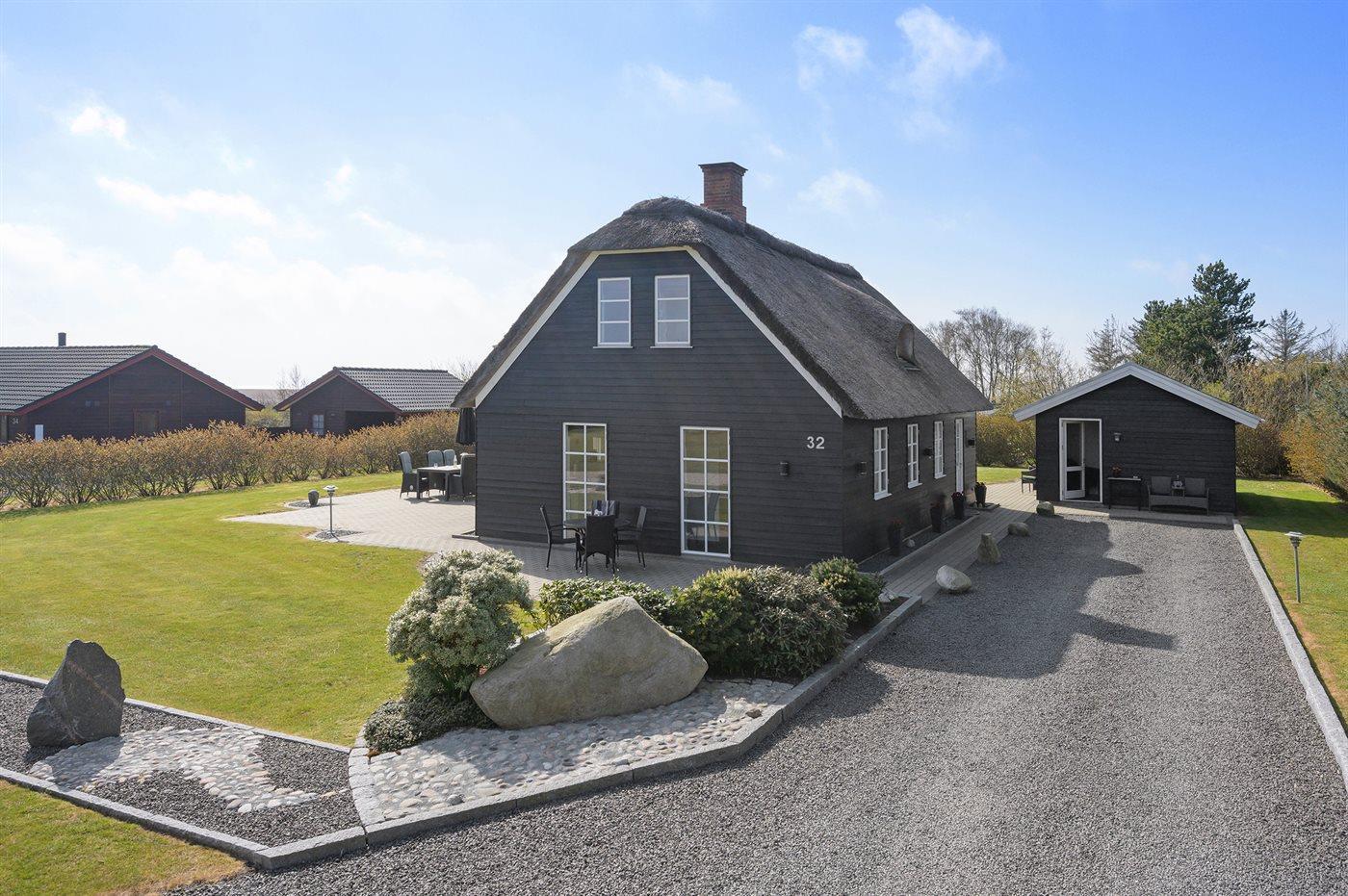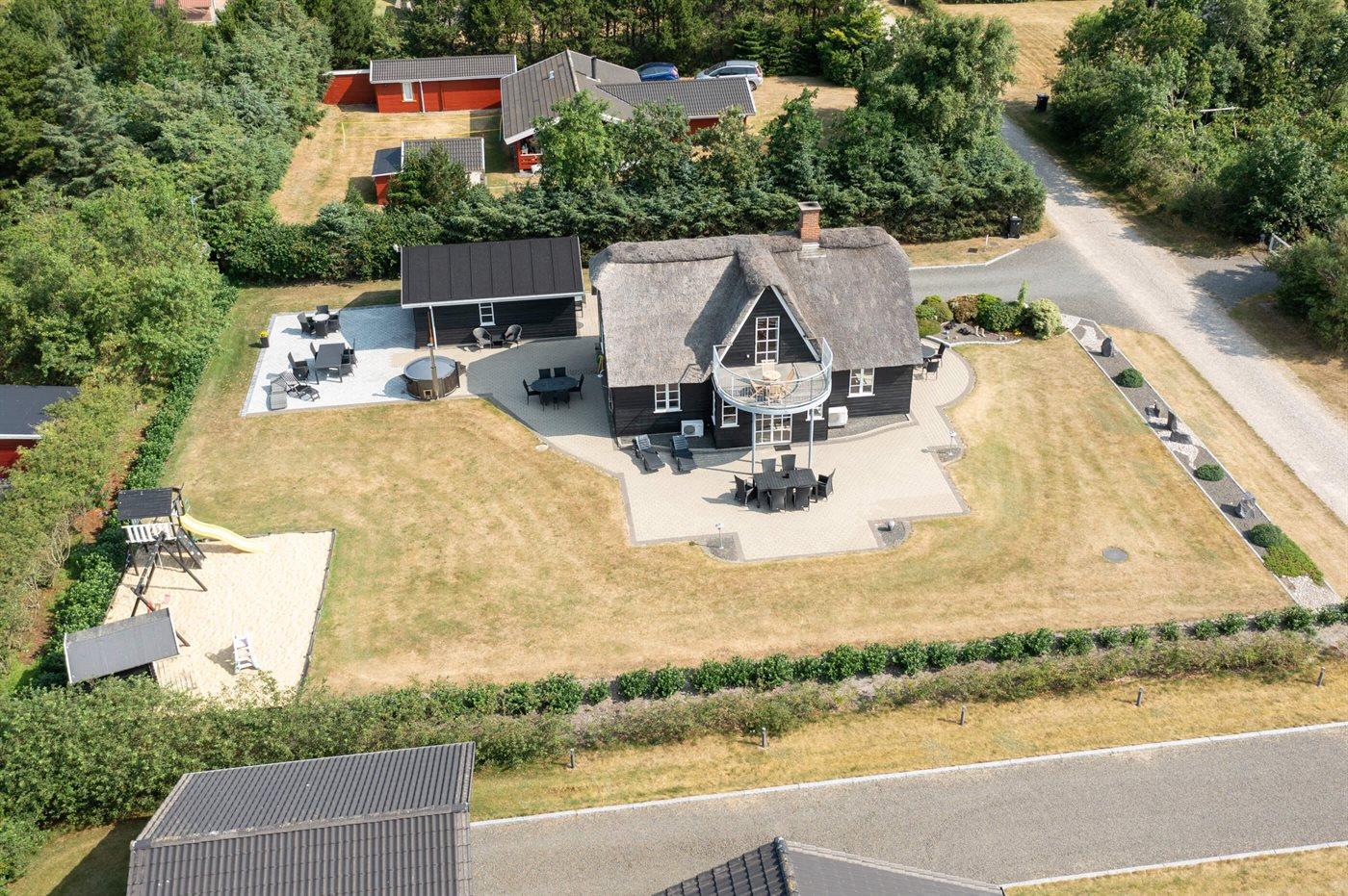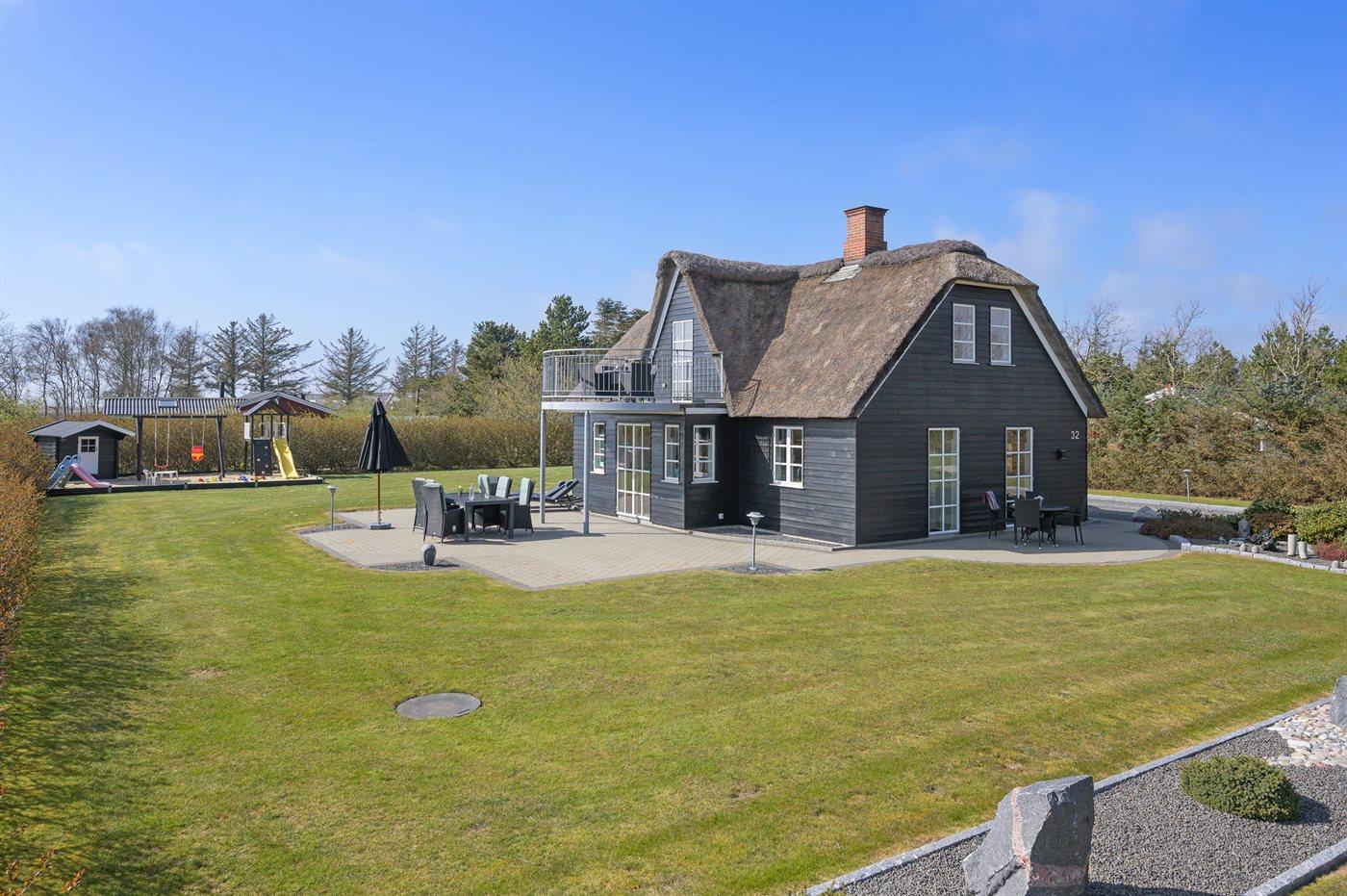 Et flot luksussommerhus i 2 plan, beliggende på en skøn naturgrund, hvor der fra 1. sal er udsigt over Ringkøbing Fjord. Huset er bygget i træ med stråtag 2008. Til huset hører stort såvel åbent som overdækket terrasseareal med div. havemøbler og et dejligt vildmarksbad til 6 personer, som kan benyttes hele året. Desuden balkon.