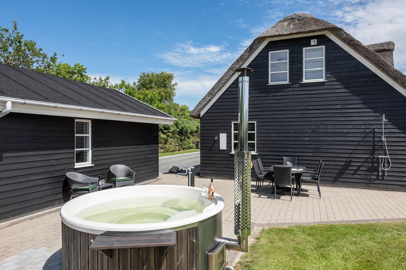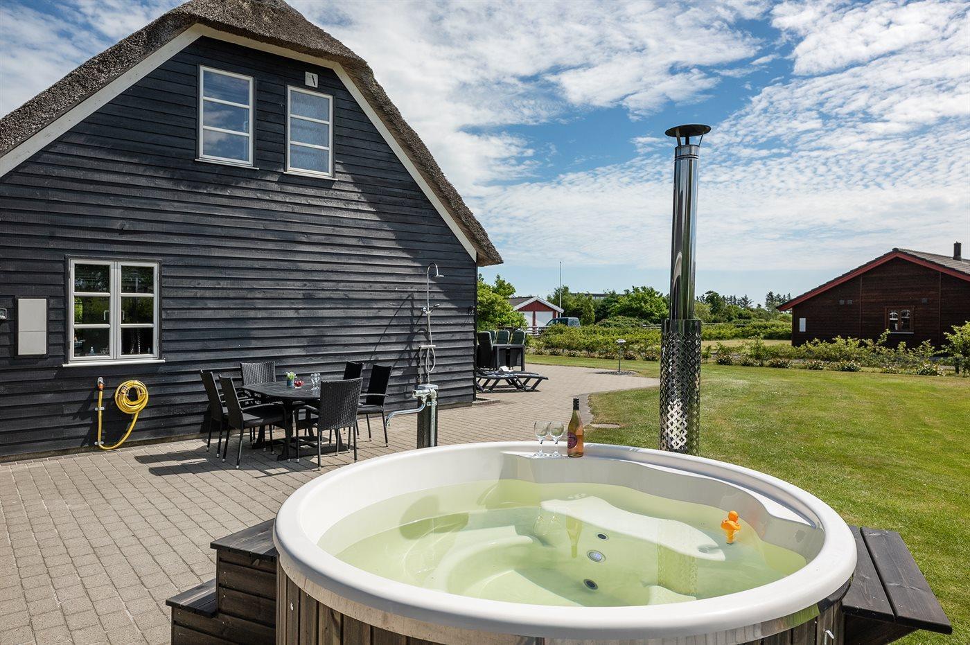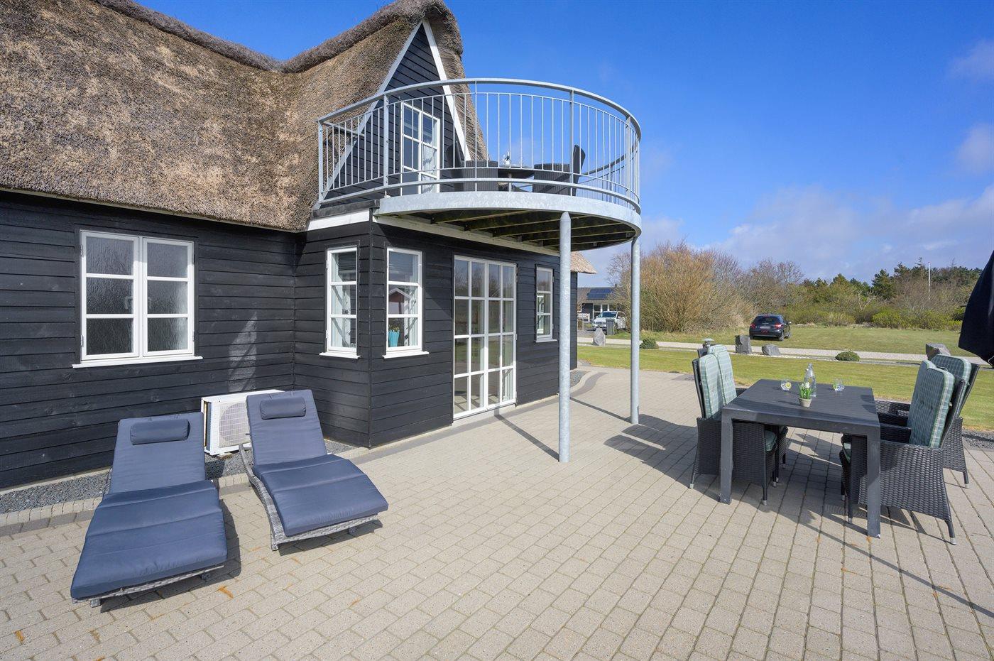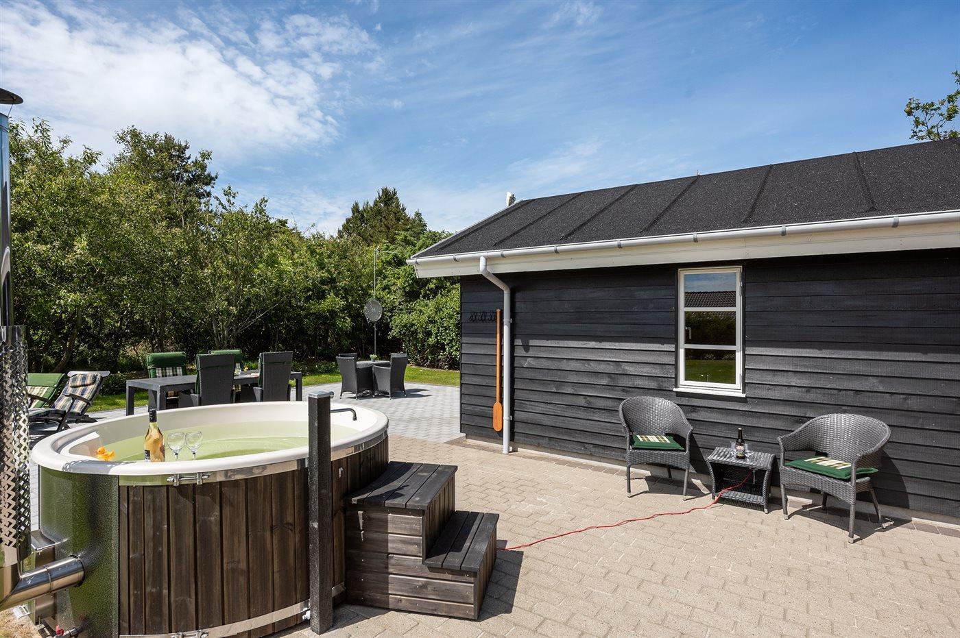 Et flot luksussommerhus i 2 plan, beliggende på en skøn naturgrund, hvor der fra 1. sal er udsigt over Ringkøbing Fjord. Huset er bygget i træ med stråtag 2008. Til huset hører stort såvel åbent som overdækket terrasseareal med div. havemøbler og et dejligt vildmarksbad til 6 personer, som kan benyttes hele året. Desuden balkon.
