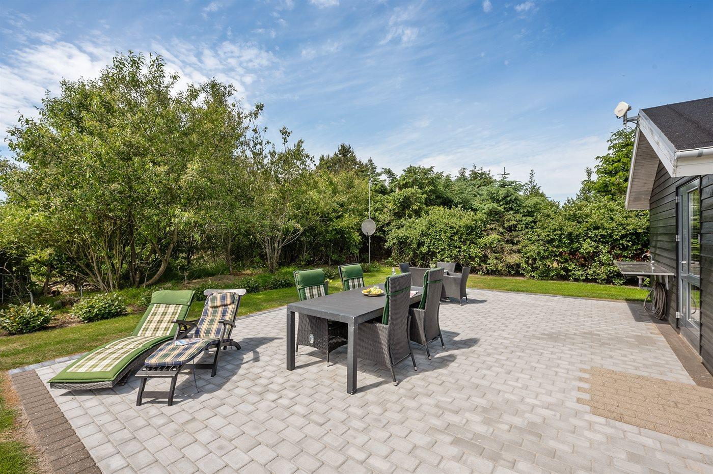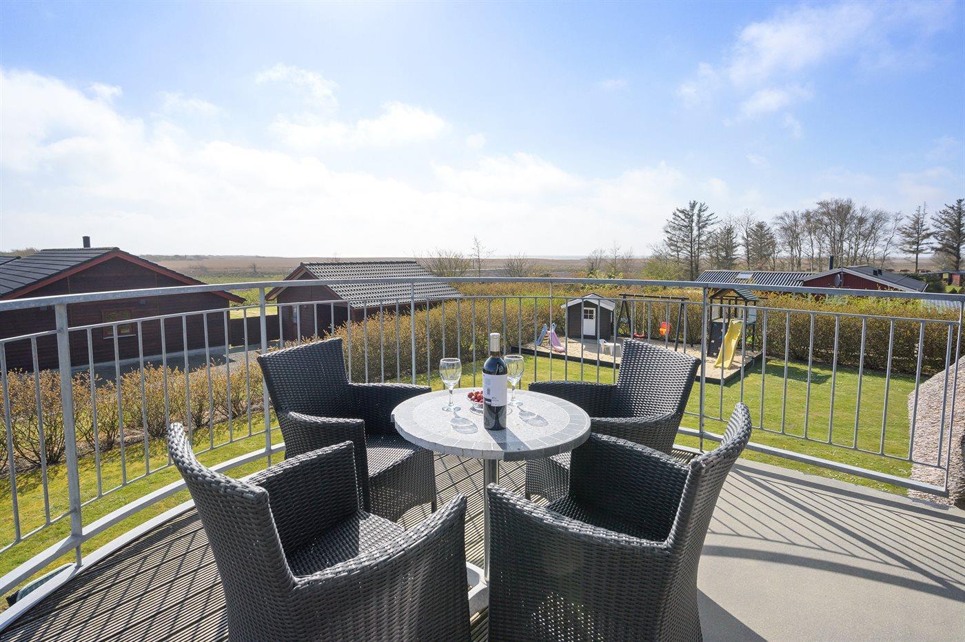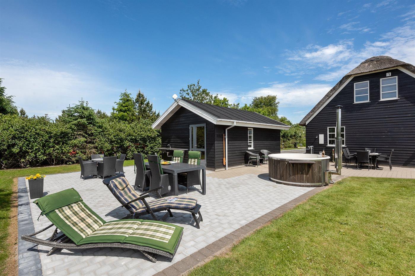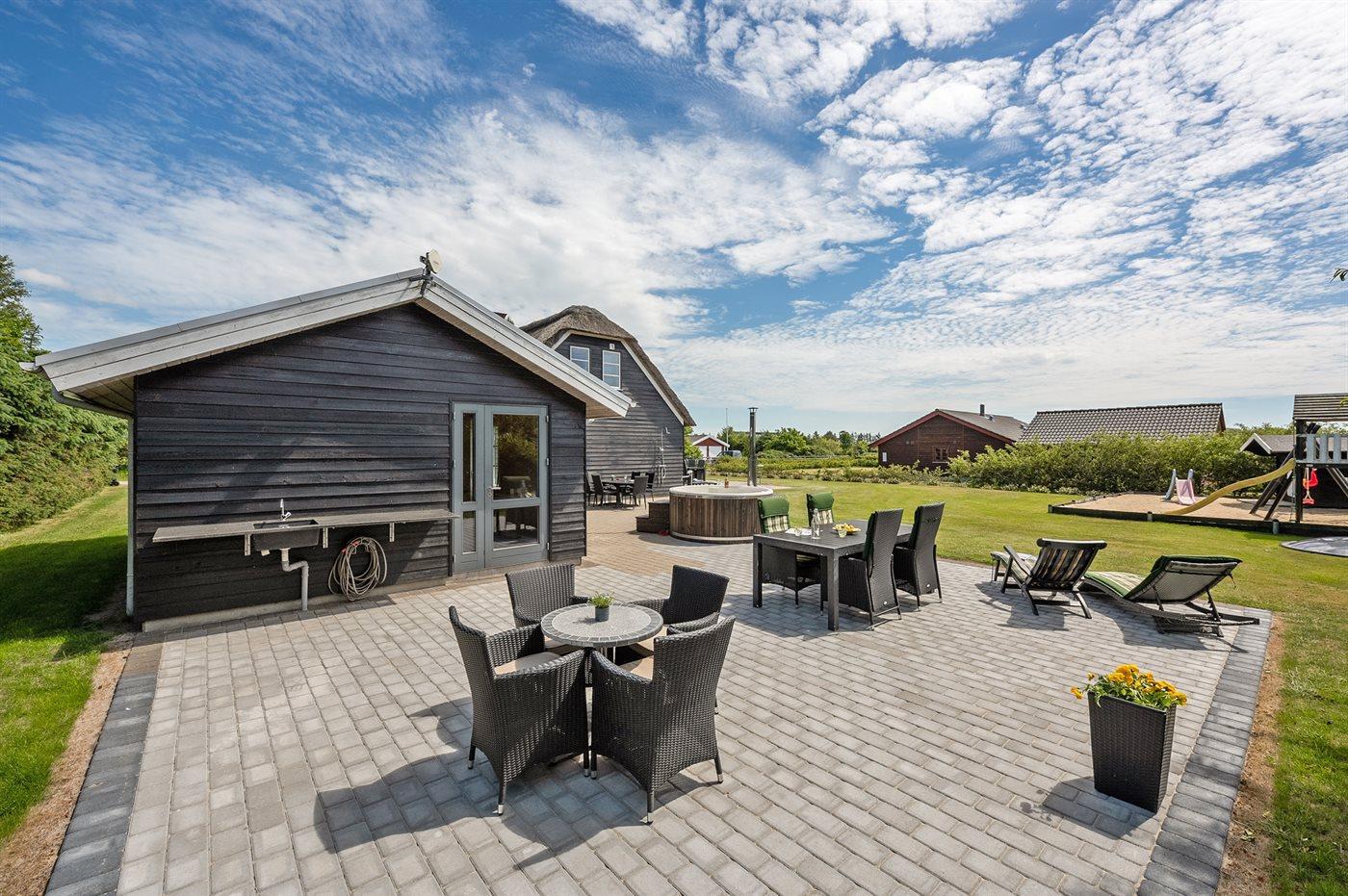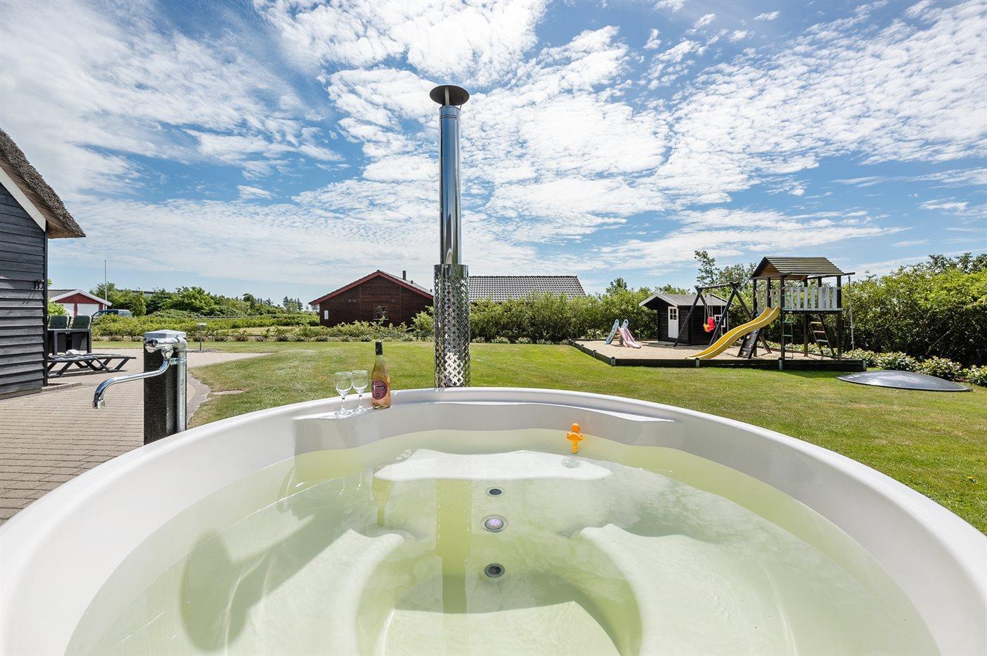 Et flot luksussommerhus i 2 plan, beliggende på en skøn naturgrund, hvor der fra 1. sal er udsigt over Ringkøbing Fjord. Huset er bygget i træ med stråtag 2008. Til huset hører stort såvel åbent som overdækket terrasseareal med div. havemøbler og et dejligt vildmarksbad til 6 personer, som kan benyttes hele året. Desuden balkon.