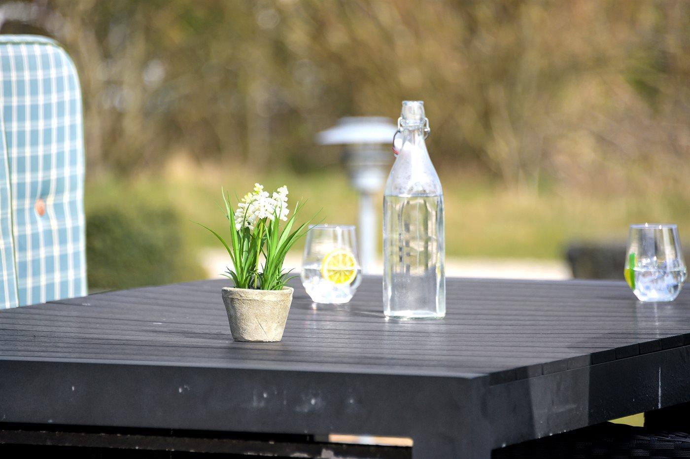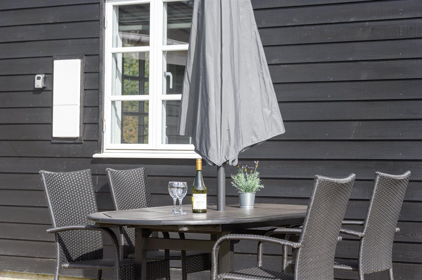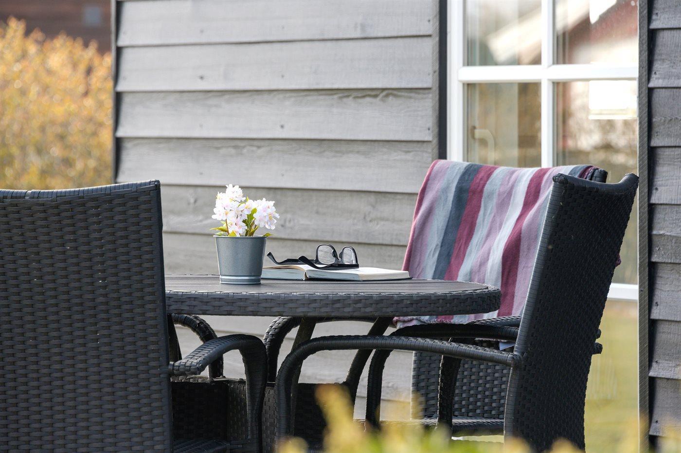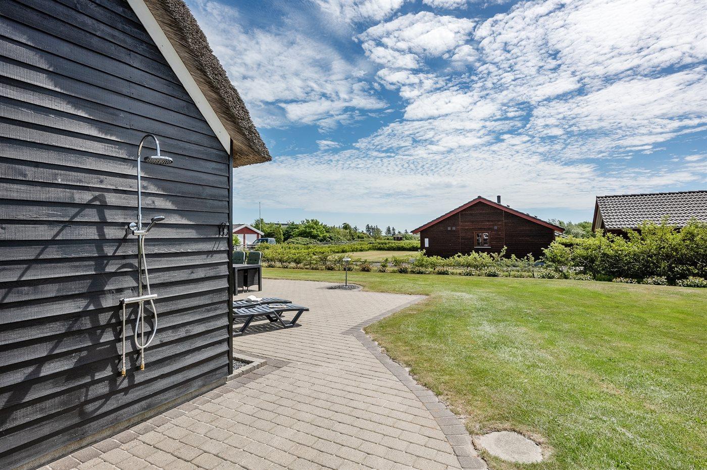 Et flot luksussommerhus i 2 plan, beliggende på en skøn naturgrund, hvor der fra 1. sal er udsigt over Ringkøbing Fjord. Huset er bygget i træ med stråtag 2008. Til huset hører stort såvel åbent som overdækket terrasseareal med div. havemøbler og et dejligt vildmarksbad til 6 personer, som kan benyttes hele året. Desuden balkon.