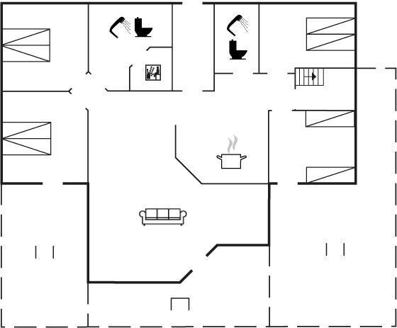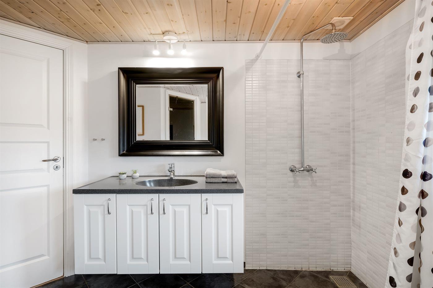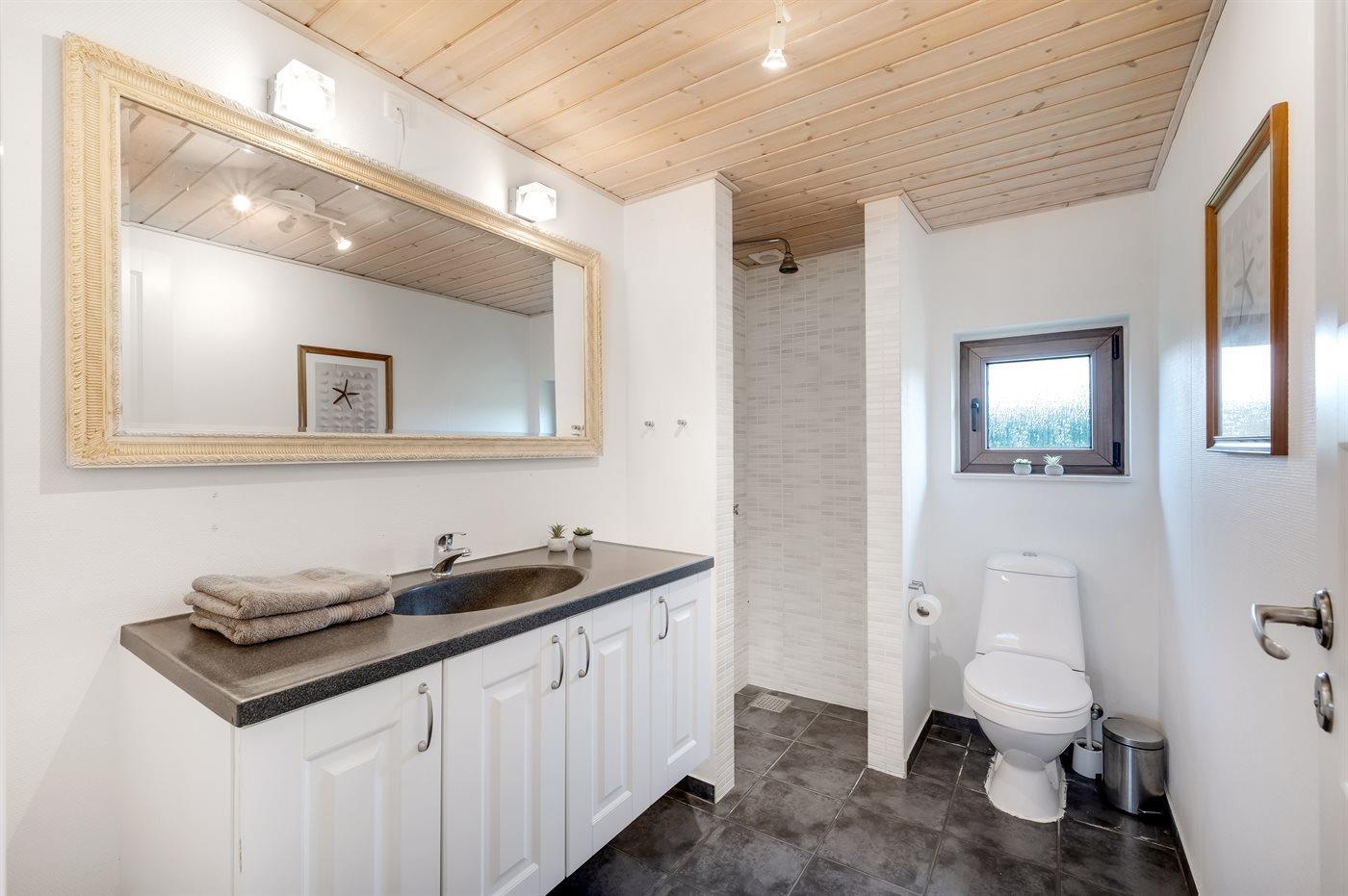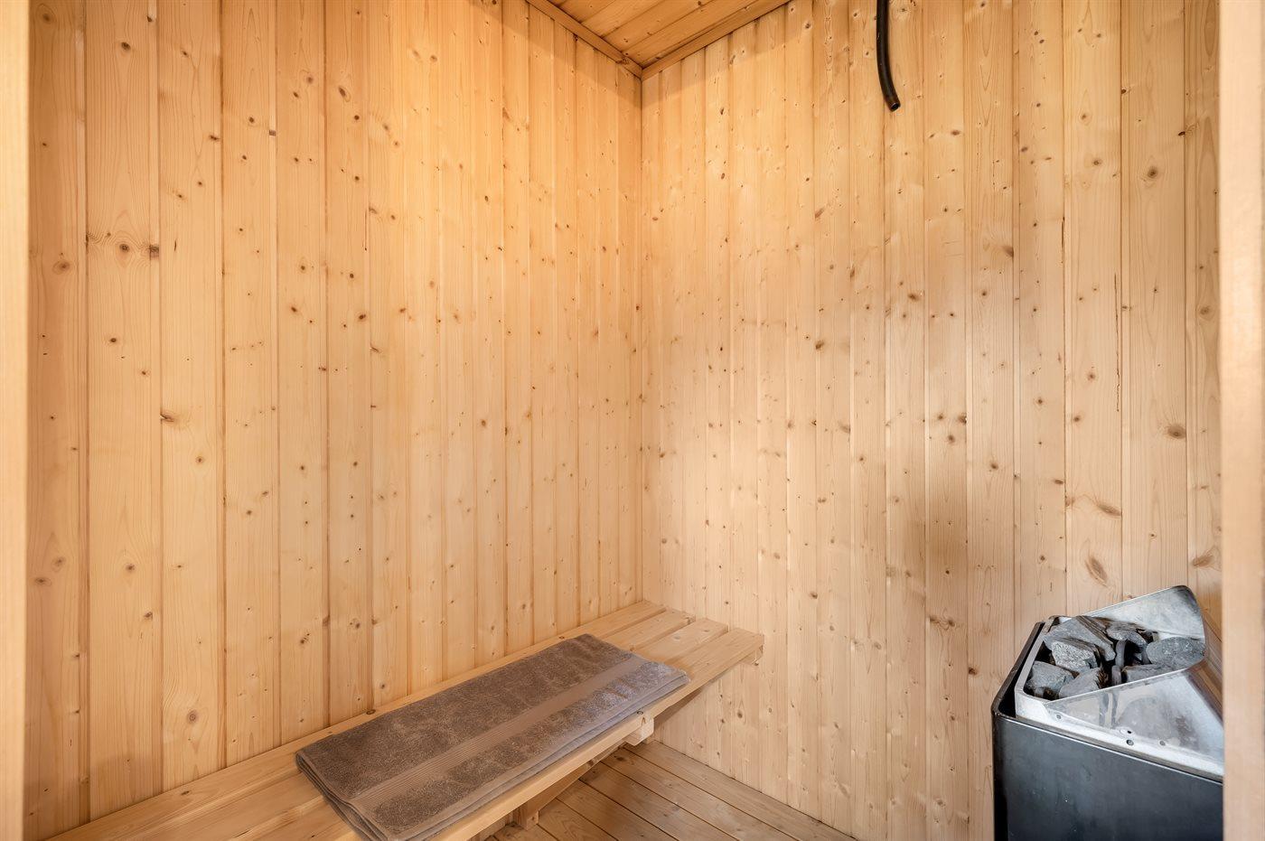 Der er 2 badeværelser med bruseniche og 2 toiletter. Der er gulvvarme på 1 badeværelse. I saunaen er der mulighed for afslapning.