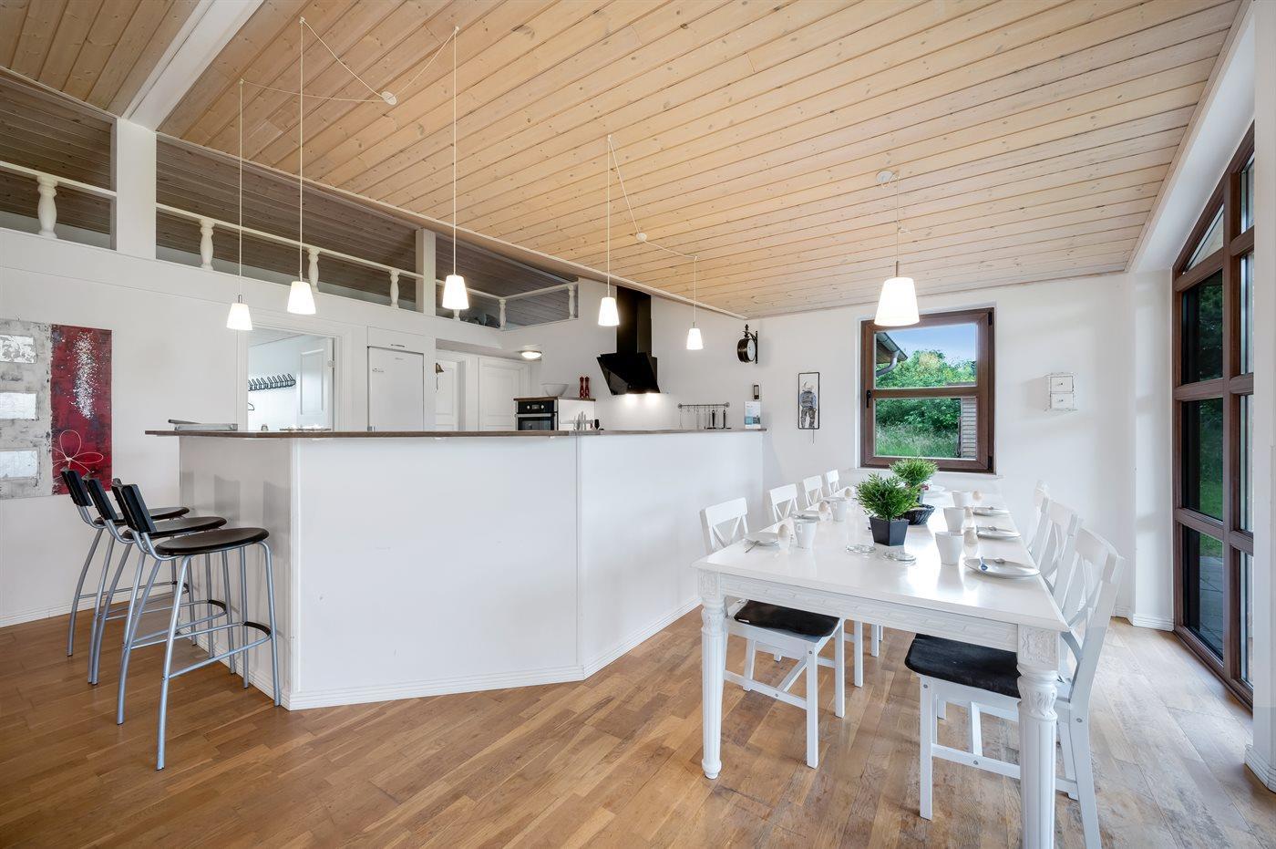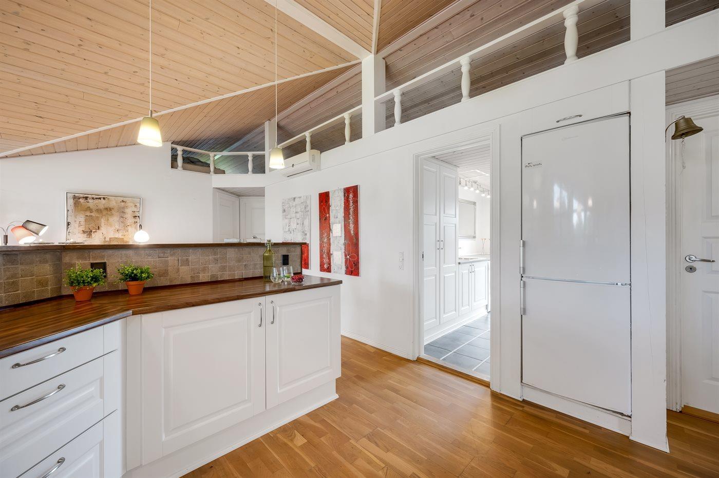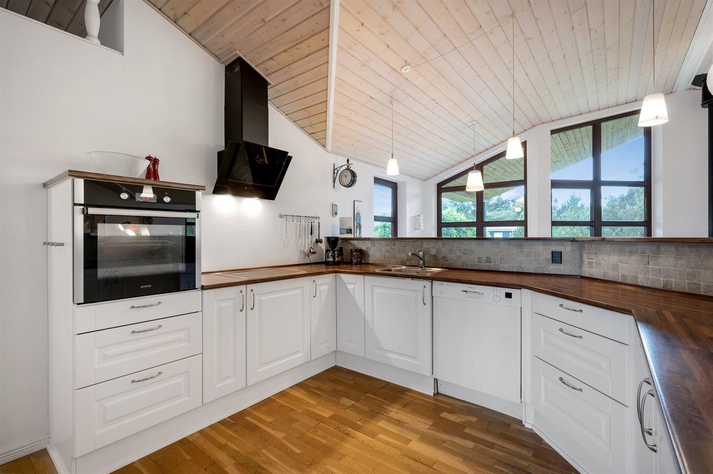 Køkkenet er udstyret med 1 køleskab. Der er 4 keramiske kogeplader, varmluftovn, mikrobølgeovn samt opvaskemaskine.