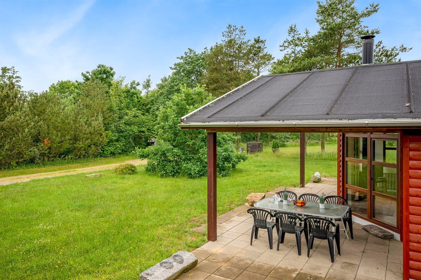 Ferieboligen er beliggende på en 1050 m² stor naturgrund. Der er 300 m til fjorden. Nærmeste forretning er beliggende i en afstand af 4000 m. Til ferieboligen hører 40 m² terrasseareal. Desuden er der 15 m² overdækket terrasse. Der er redskabsrum. Parkering ved ferieboligen.