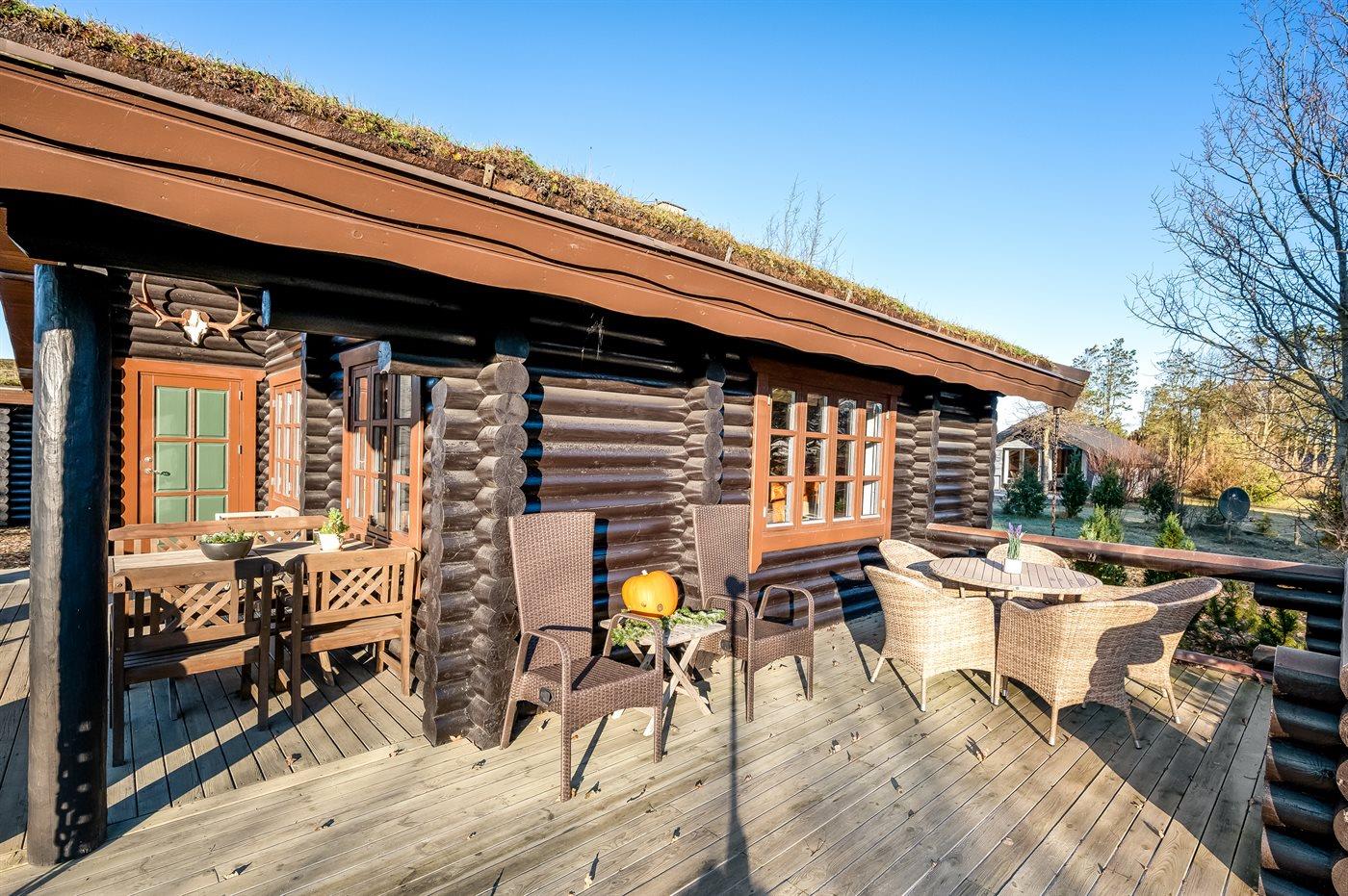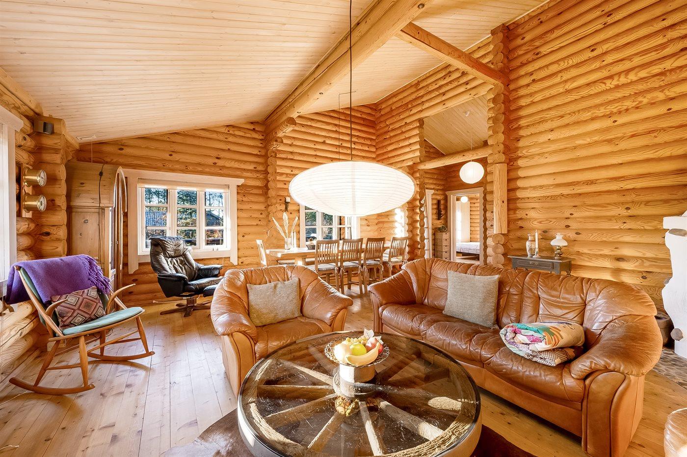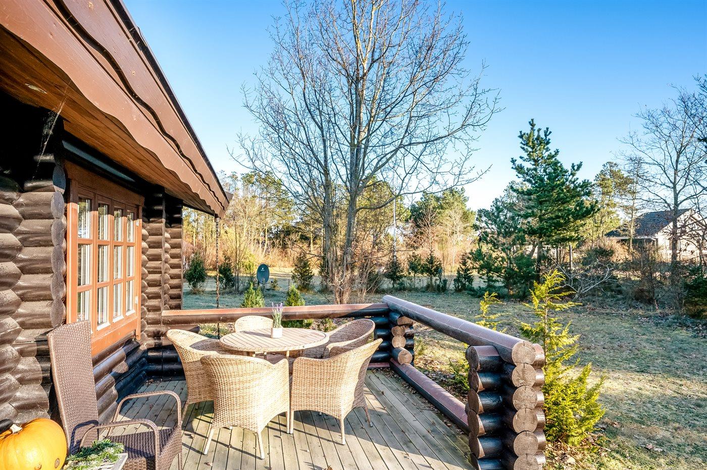 Hyggeligt bjælkesommerhus nær fjorden med plads til 6 personer og charmerende naturoplevelser i rolige omgivelser.