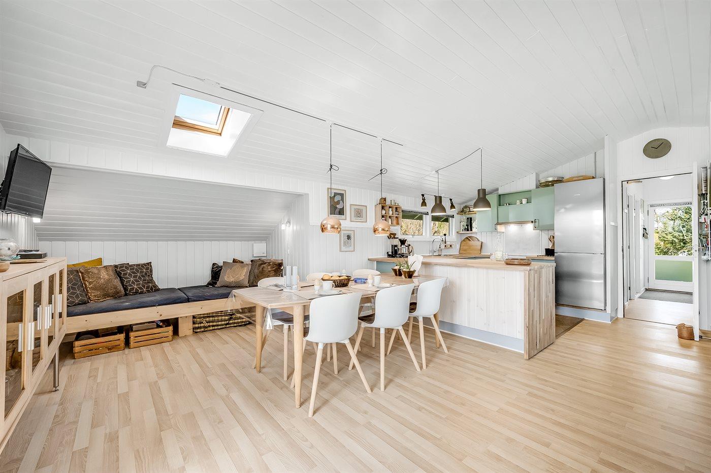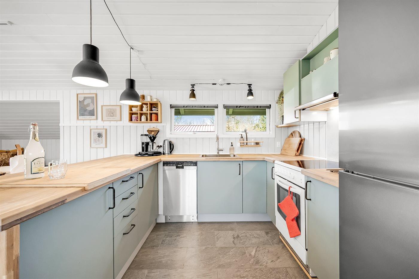 Køkkenet er udstyret med 1 køleskab. Der er 4 keramiske kogeplader, bageovn, mikrobølgeovn samt opvaskemaskine.