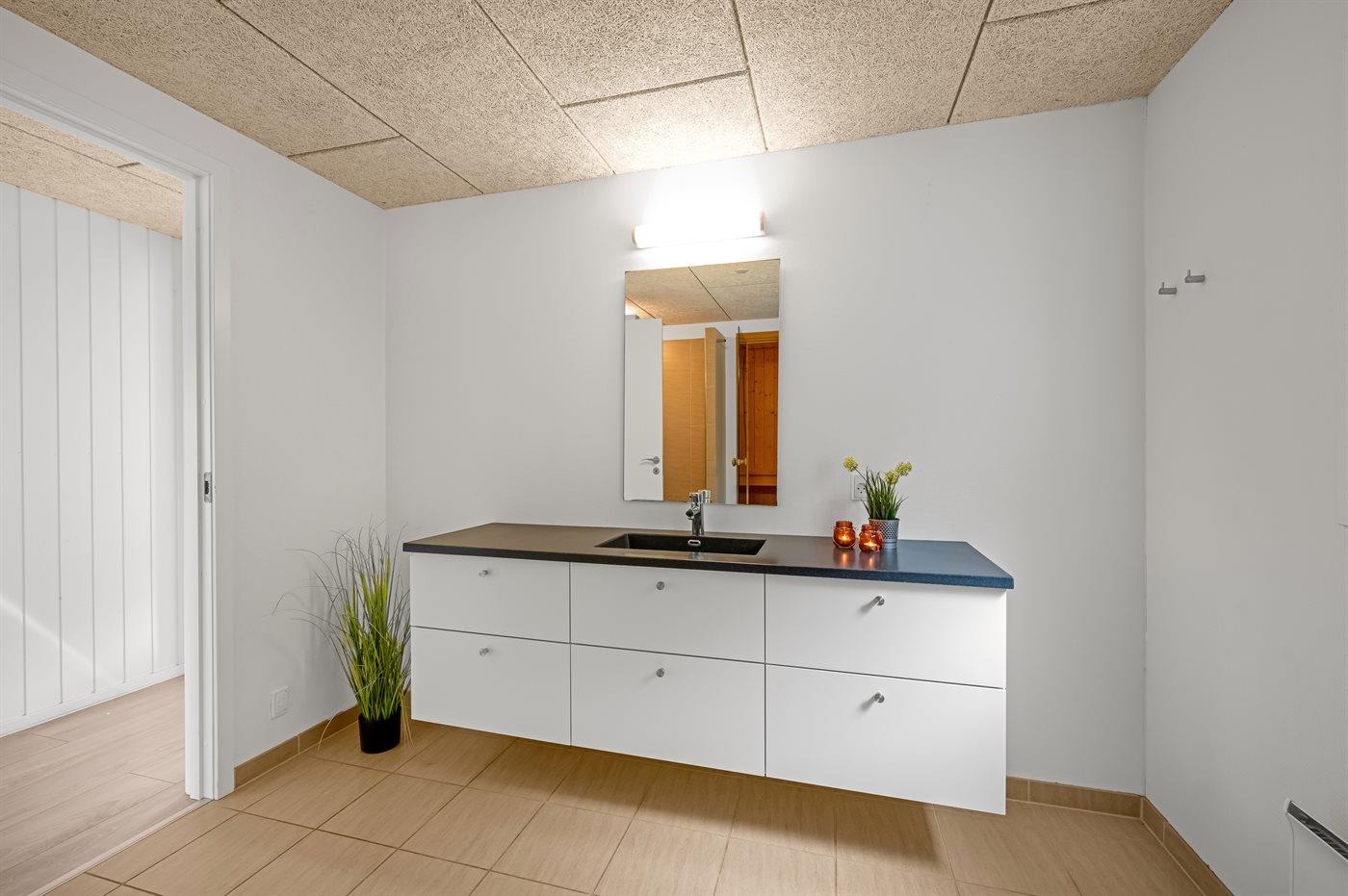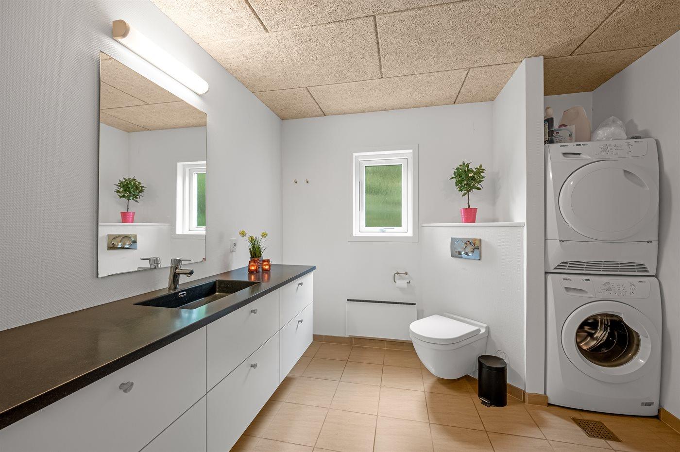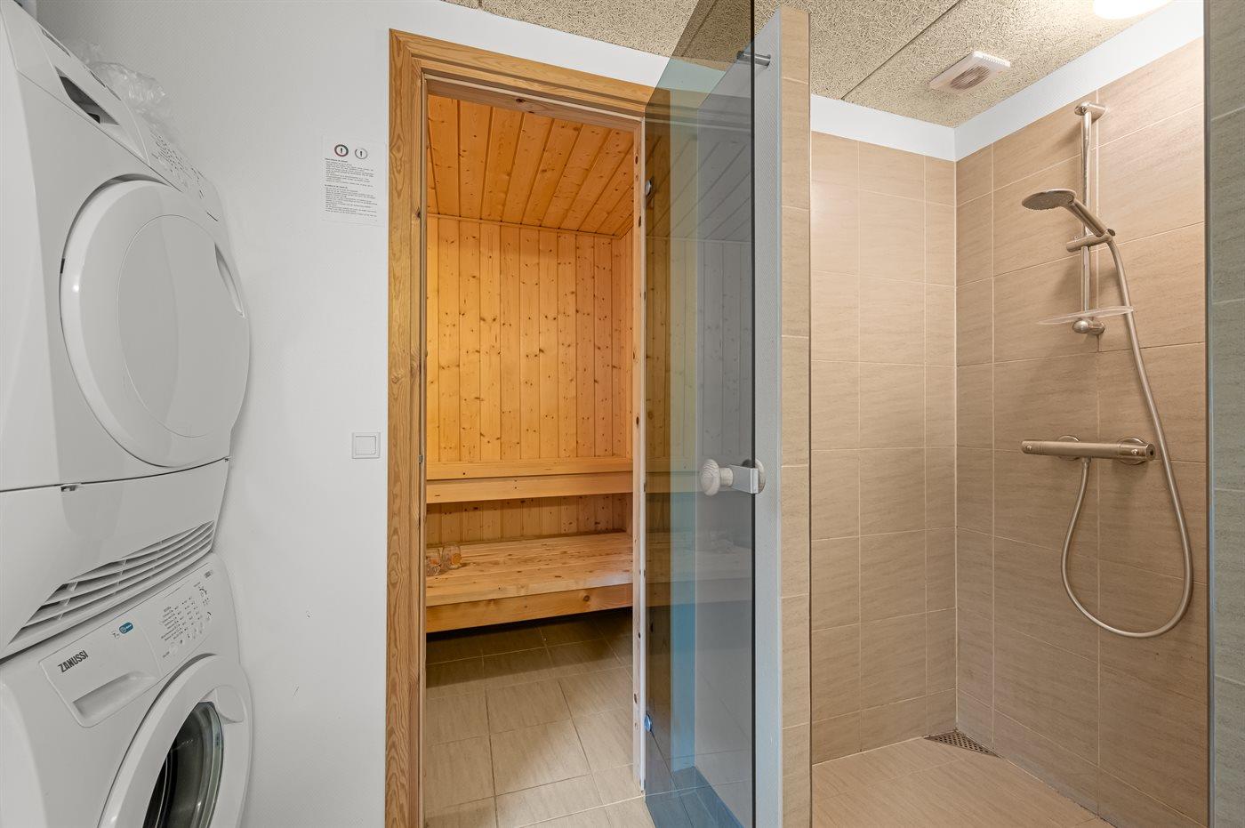 Der er 2 badeværelser med bruseniche og 2 toiletter. Der er gulvvarme på 2 badeværelser. I saunaen er der mulighed for afslapning.