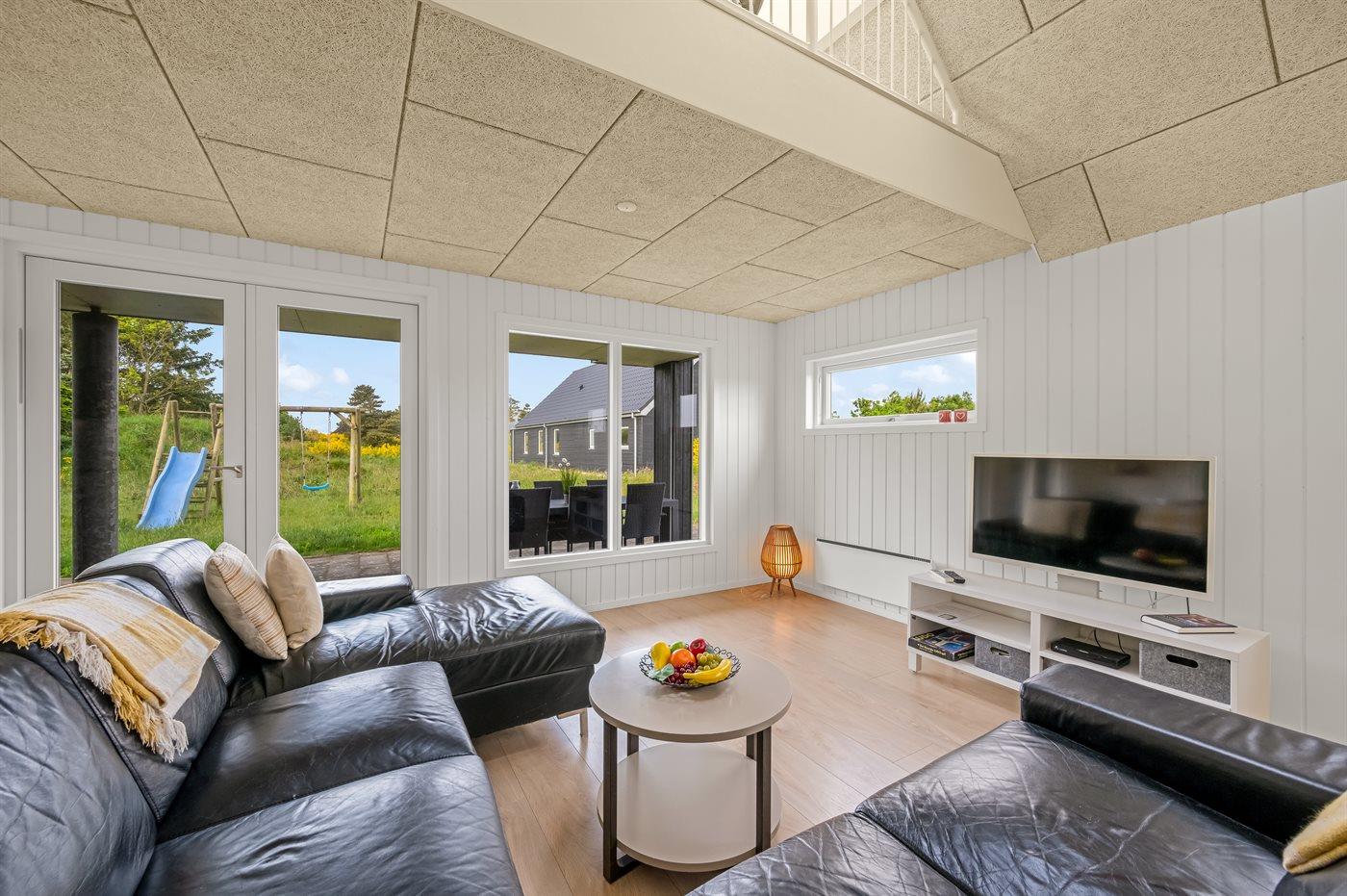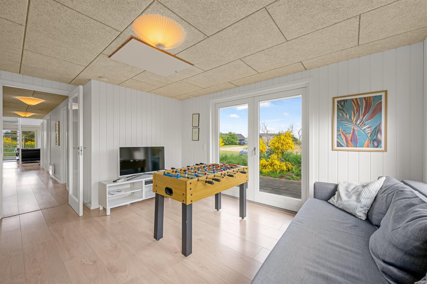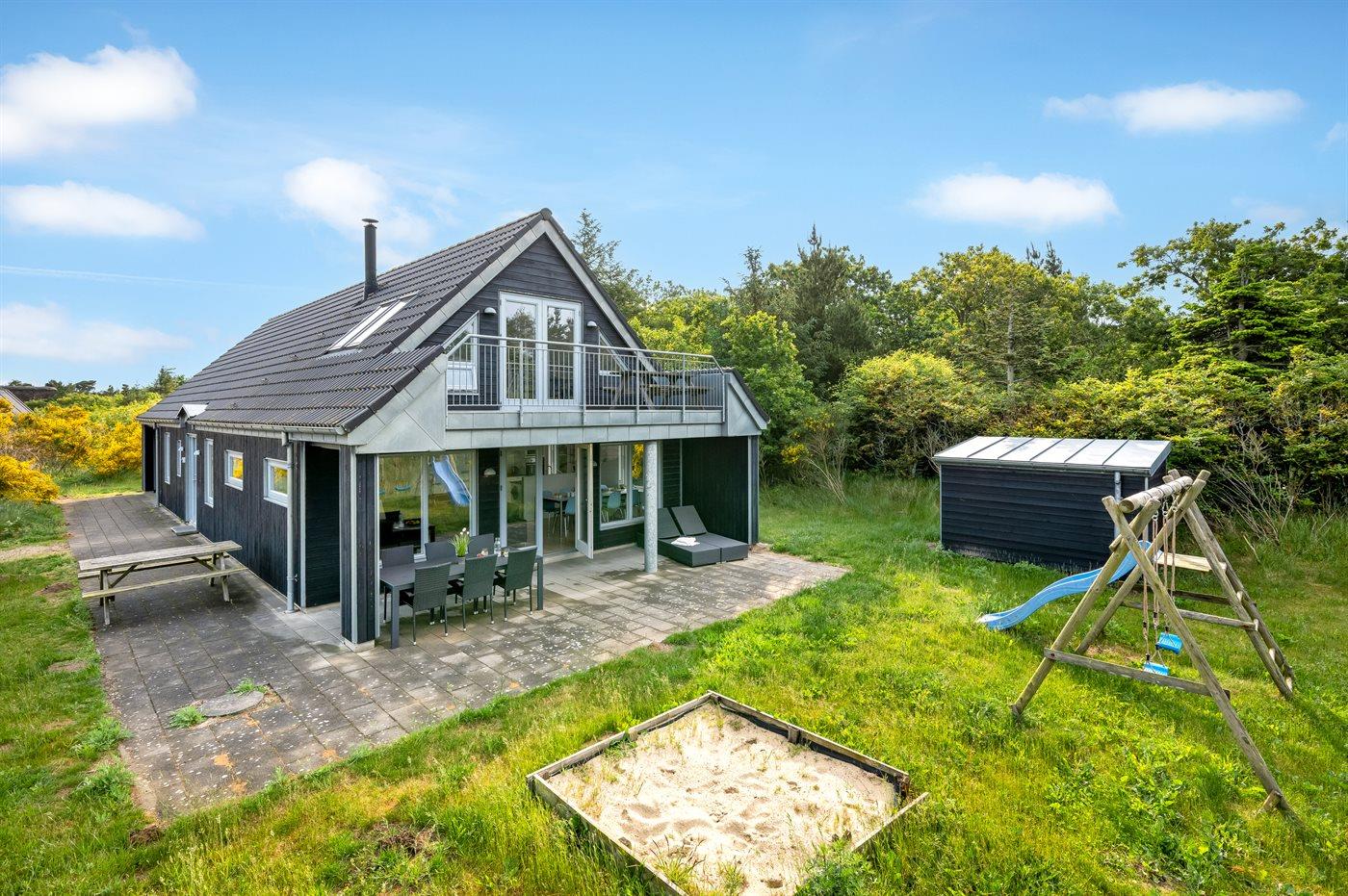 Hyggeligt sommerhus nær Ringkøbing Fjord med aktivitetsrum, sauna og stor altan med udsigt.