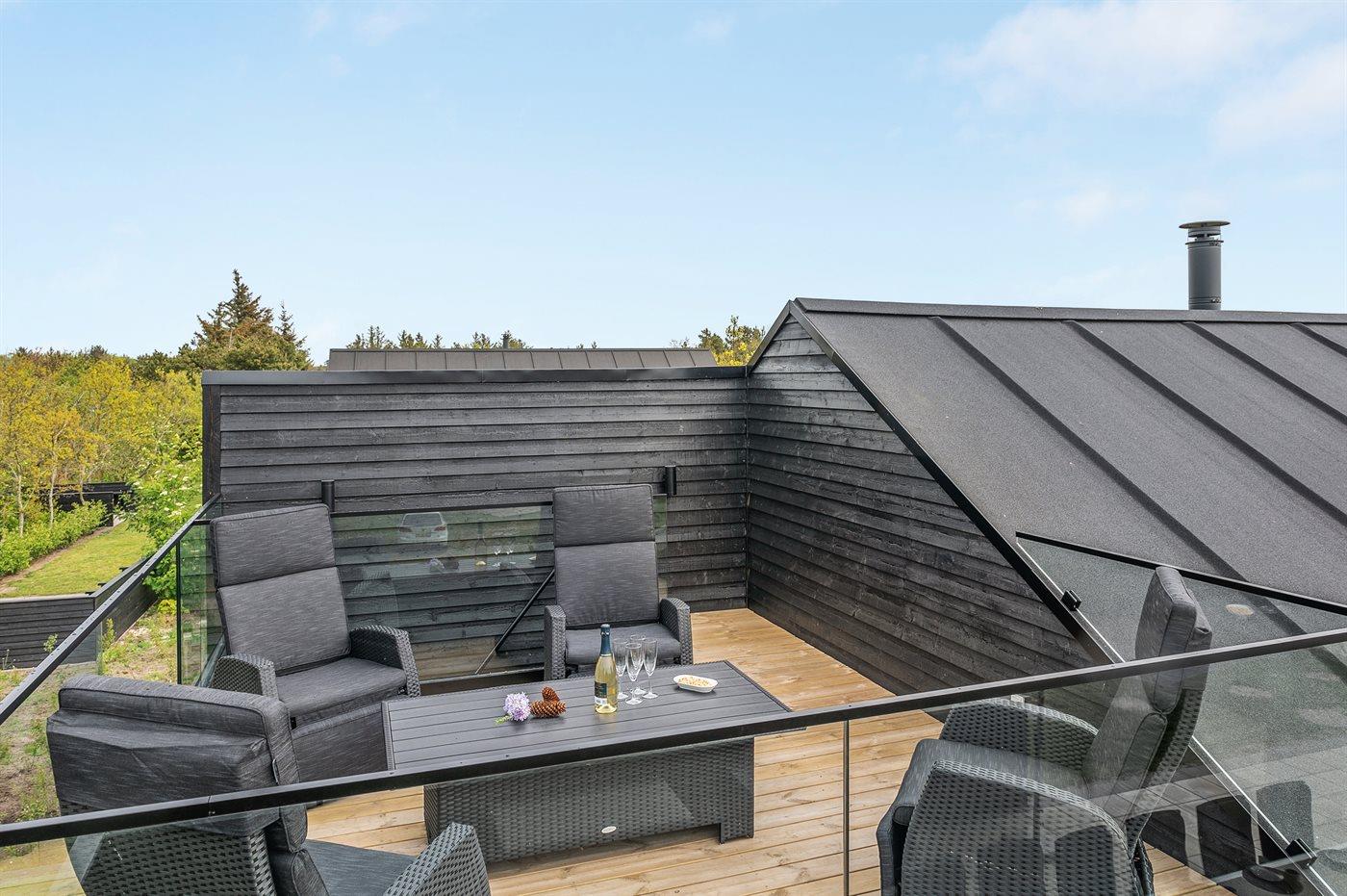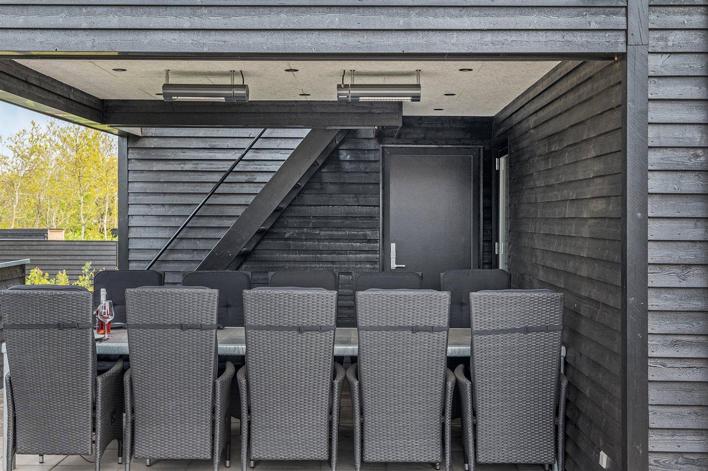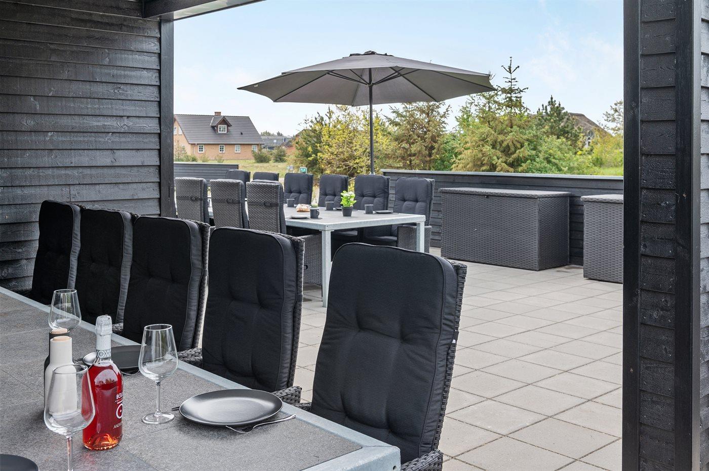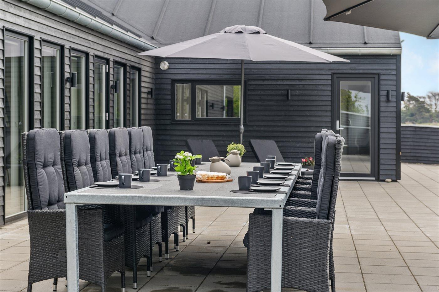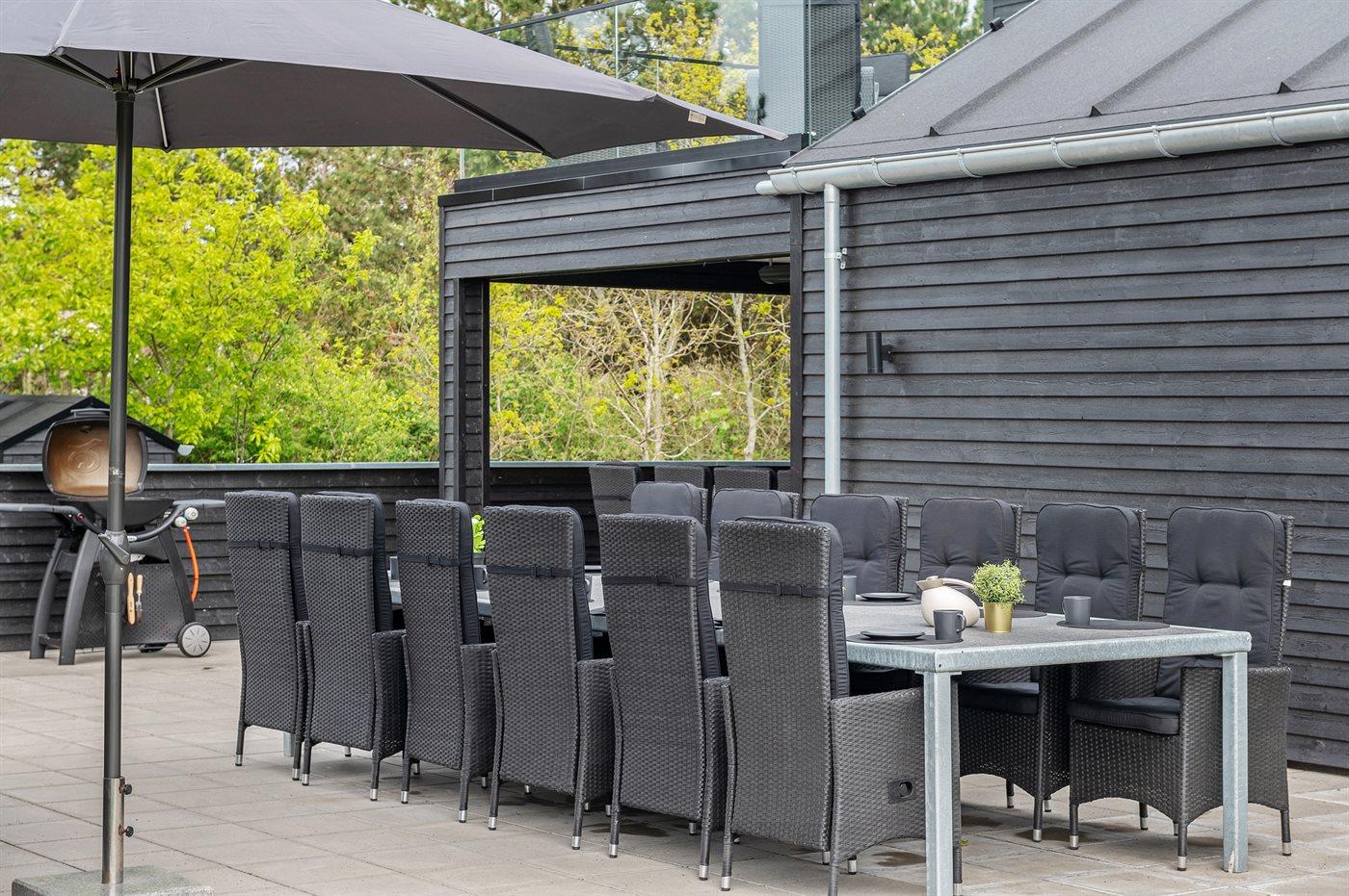 Til ferieboligen hører 200 m² åbent flisebelagt terrasseareal delvis omgivet med stakit for læ, oplyst med led lys, og til huset hører også et dejligt overdækket 16 m² terrasseareal med indbyggede elektriske terrassevarmer. Der er 2 store haveborde lavet i stål og granit hvor der er plads til 10-12 personer ved hvert område med havestole og hynder, samt solsenge med hynder. Ovenover den overdækkede terrasse er der en dejlig tagterrasse med fjordudsigt. Tagterrassen er med loungemøbler omkranset af glas. Der findes desuden en gasgrill af mærket Weber Q3000 med tilhørende gas til afbenyttelse. Desuden er der flisebelagt gangsti rundt om hele huset. Adgang til U-formet og solopvarmet udebruser (35 liter), som er oplyst med led lys.