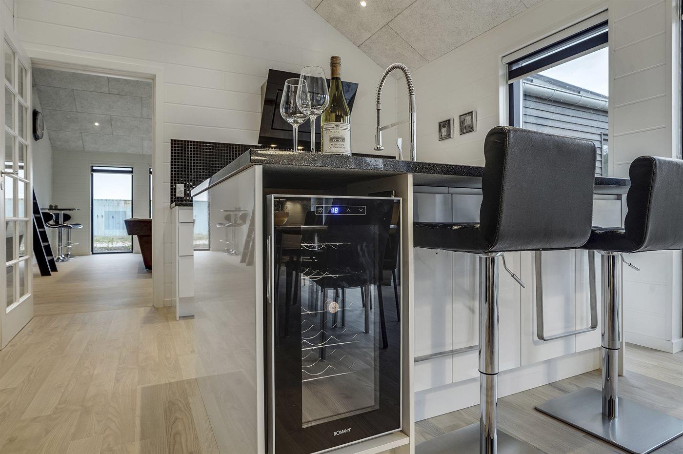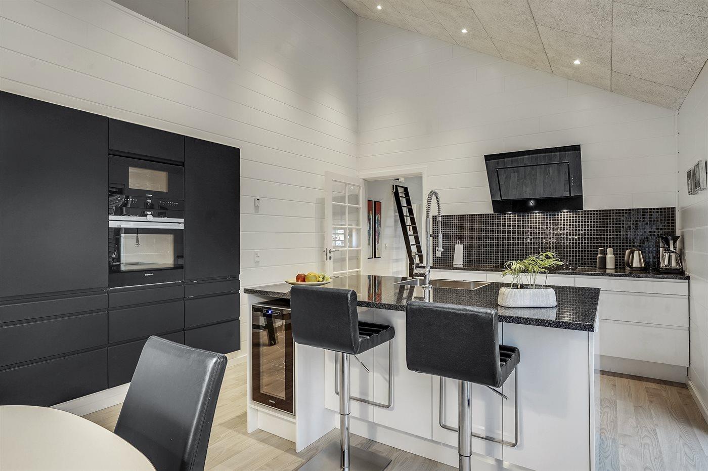 Køkkenet er udstyret med 1 køleskab samt en vinkøler til 18 flasker. Der er 4 induktionskogeplader, varmluftovn, kombi/mikrobølgeovn samt opvaskemaskine. Der er 2 barstole sammen med vaskeøen.
