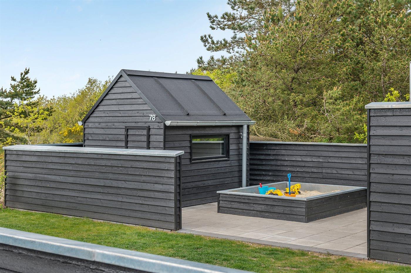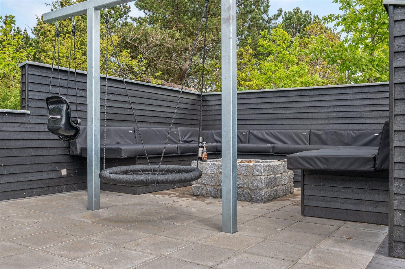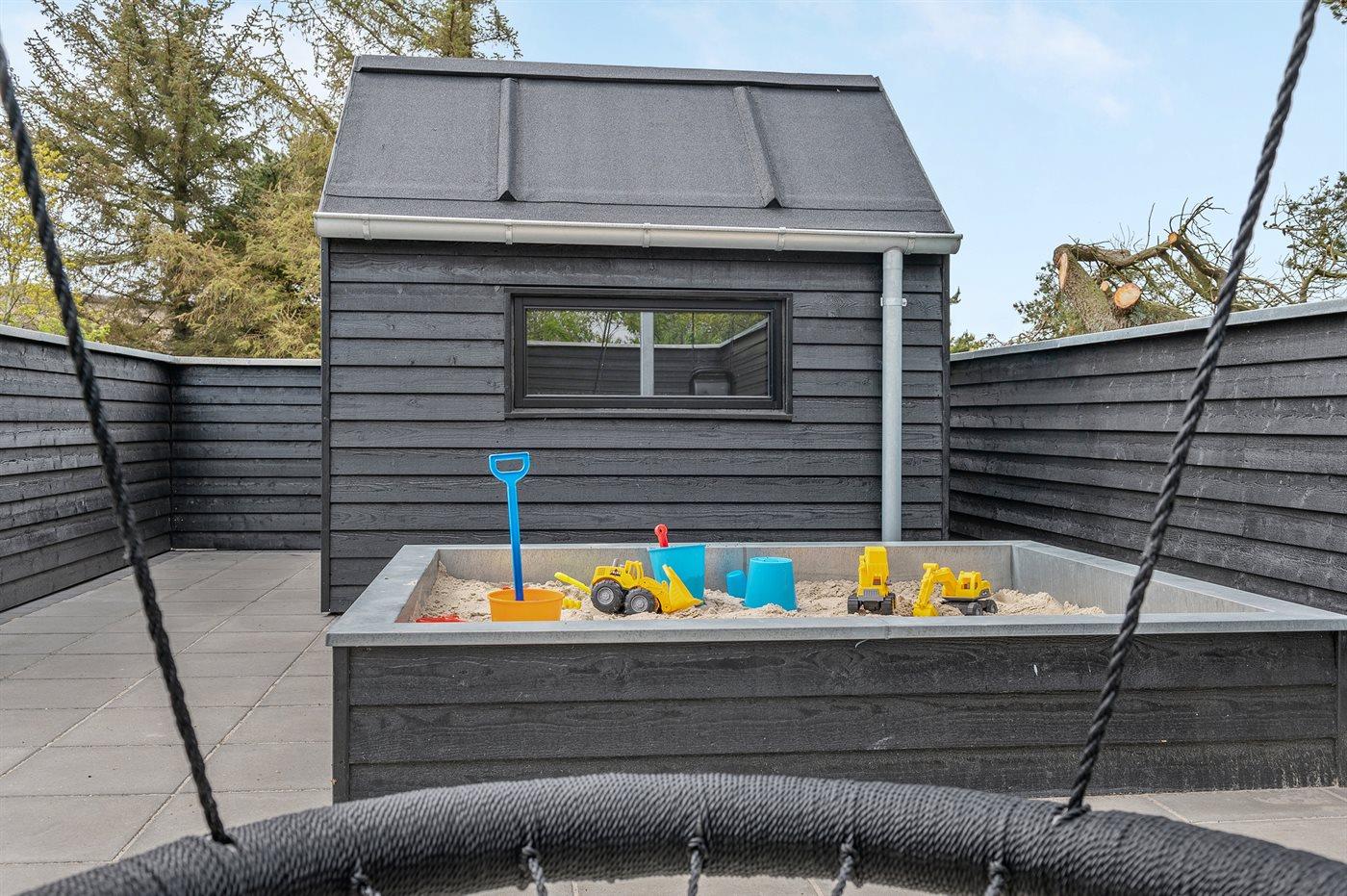 Der findes også et 45 m² flisebelagt lege og hygge område med stor sandkasse, gynge og isoleret legehus opført i samme stil som sommerhuset. Der er et bålsted omgivet med brede bænke samt en sansegynge. Hele området er omgivet med stakit i 2 højder for læ og oplyst med led lys.