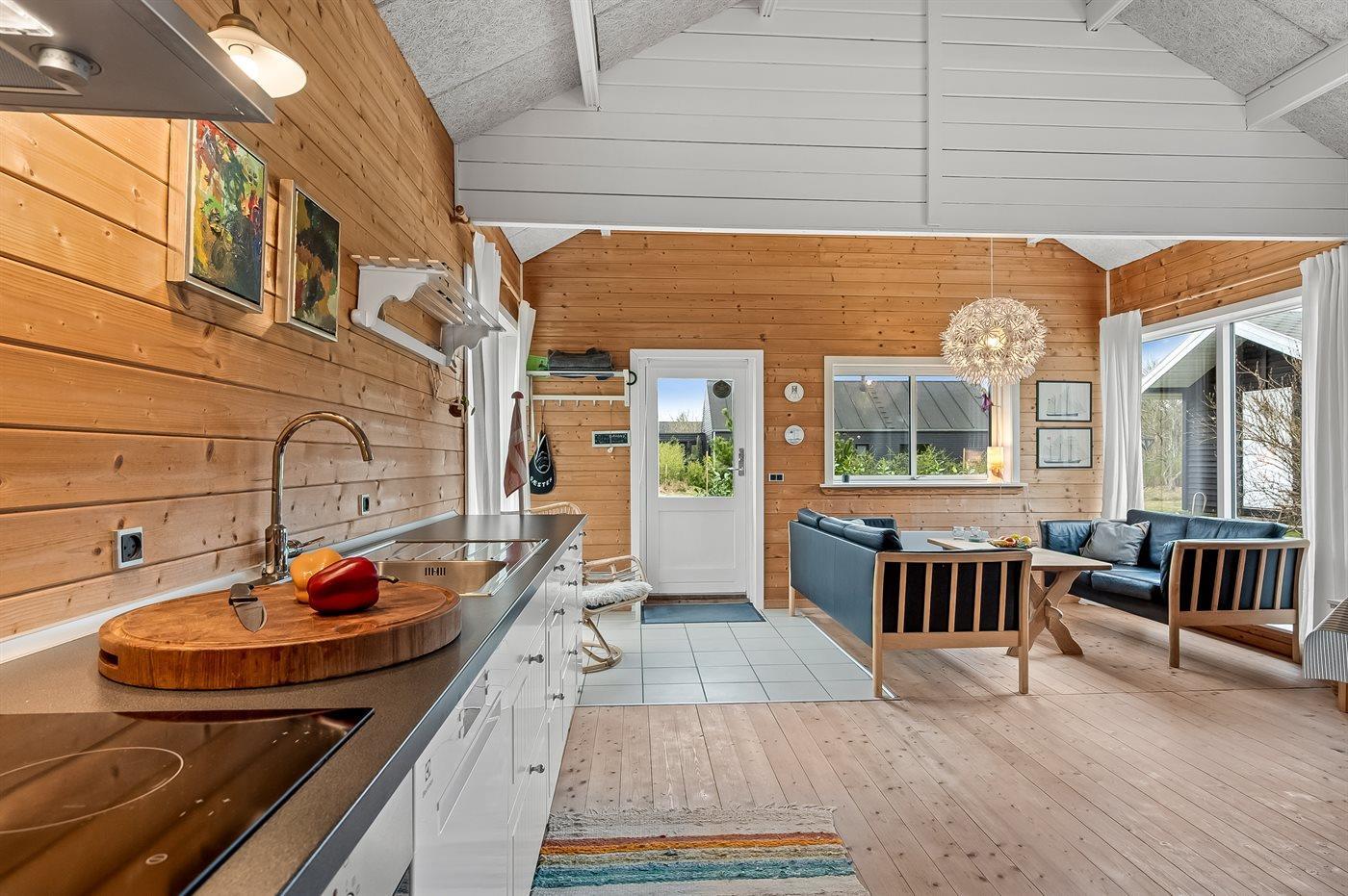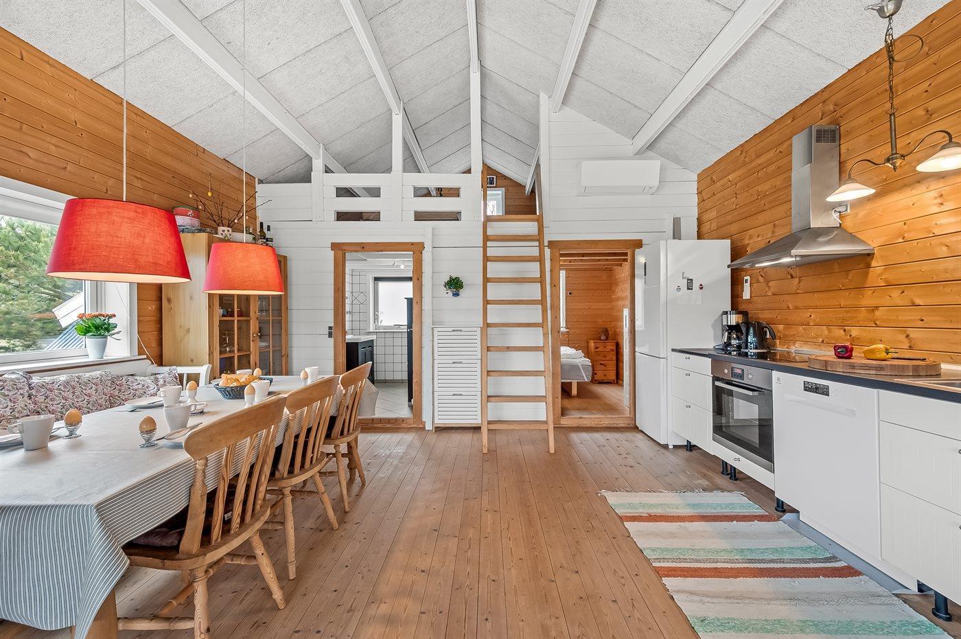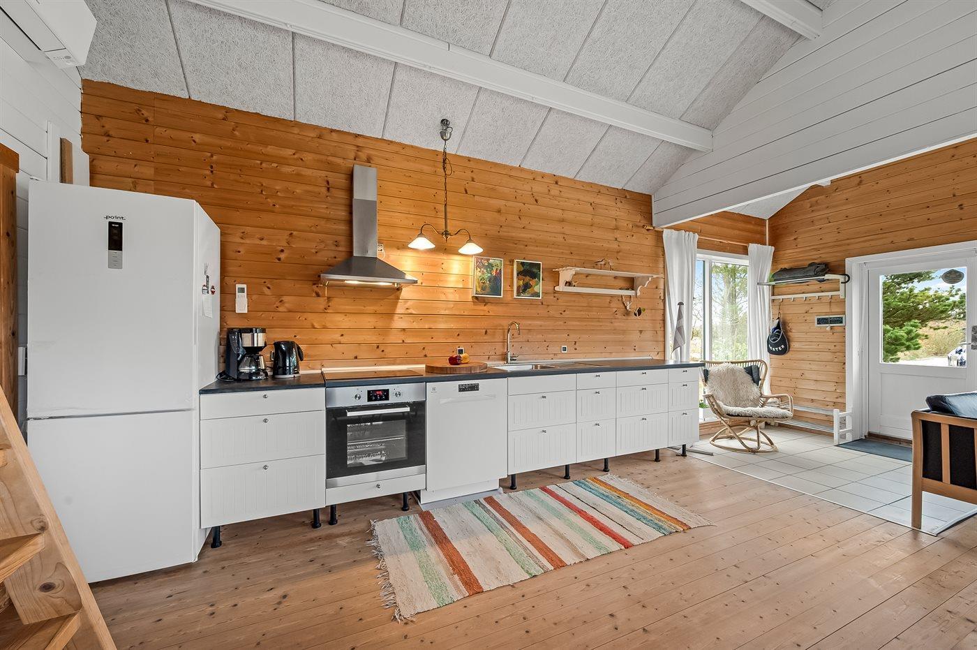 Køkkenet er udstyret med 1 køleskab. Der er 4 keramiske kogeplader, varmluftovn samt opvaskemaskine.