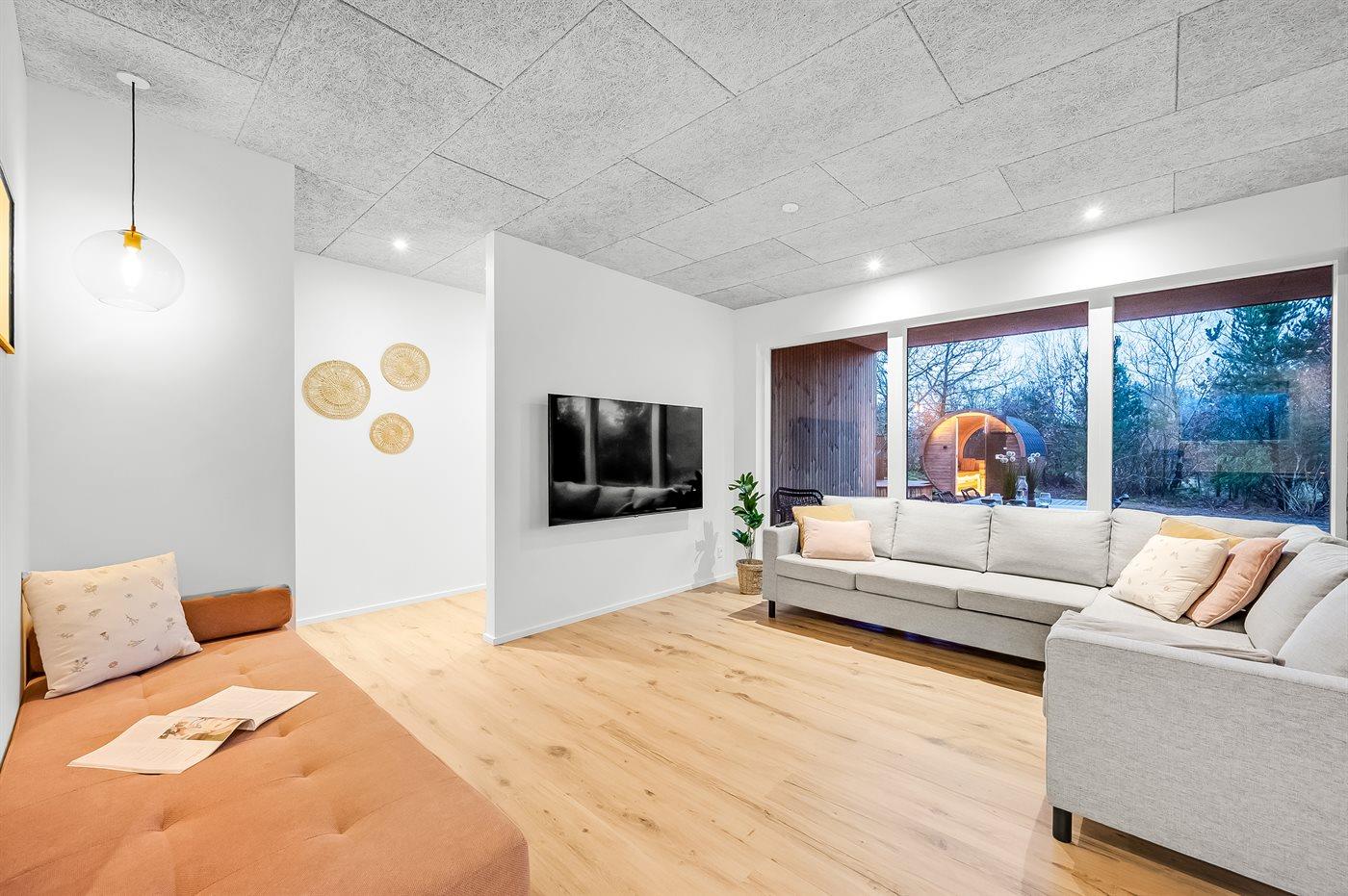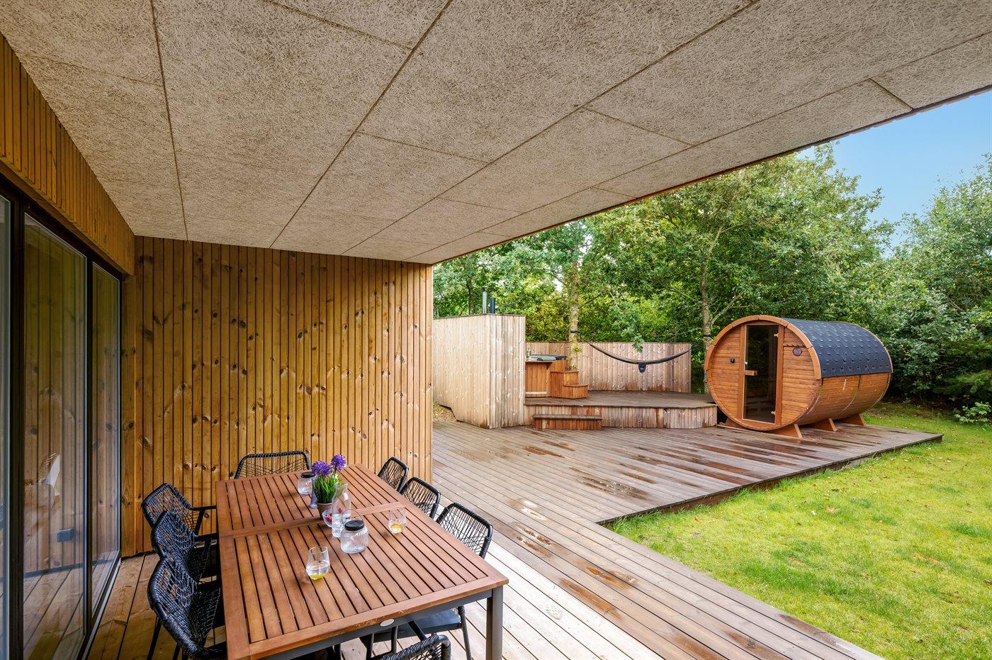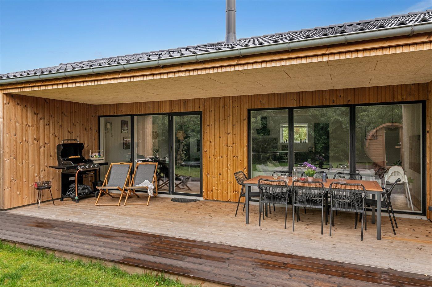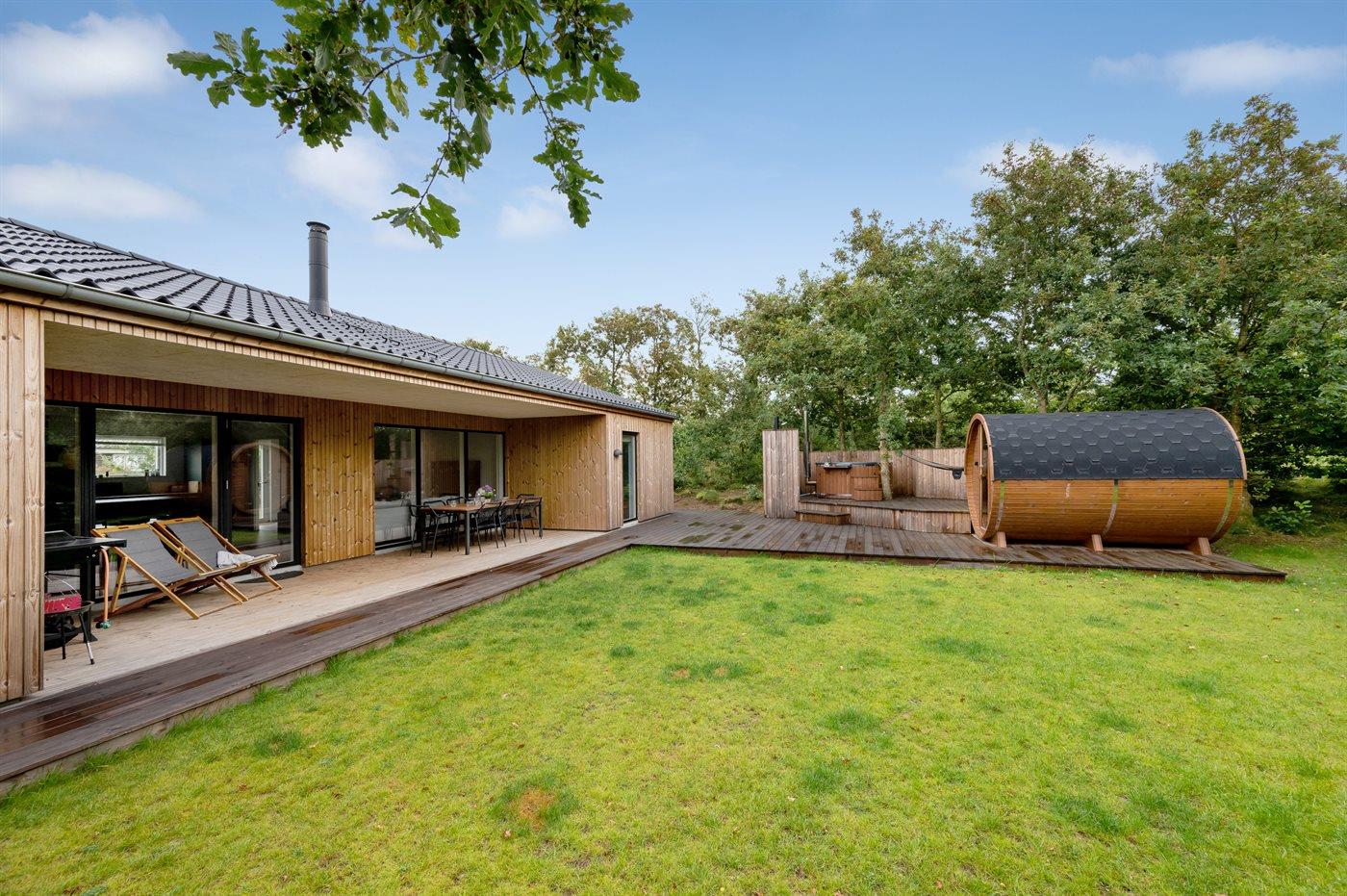 Fra opholdsrummet kan I træde direkte ud på den delvist overdækkede terrasse og nyde udendørslivet i komfortable havemøbler. Forkæl jer selv i det skønne udendørs område med både vildmarksbad, saunatønde og udebruser.