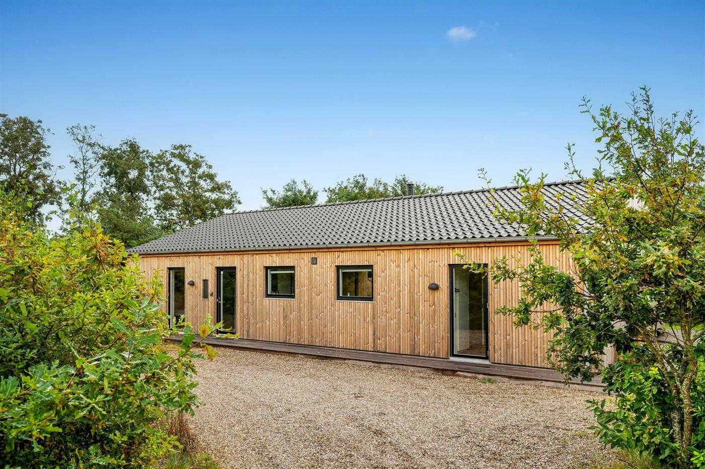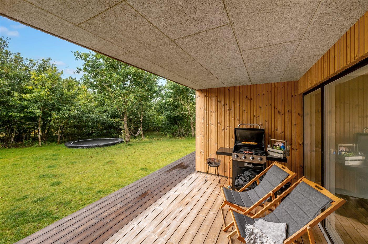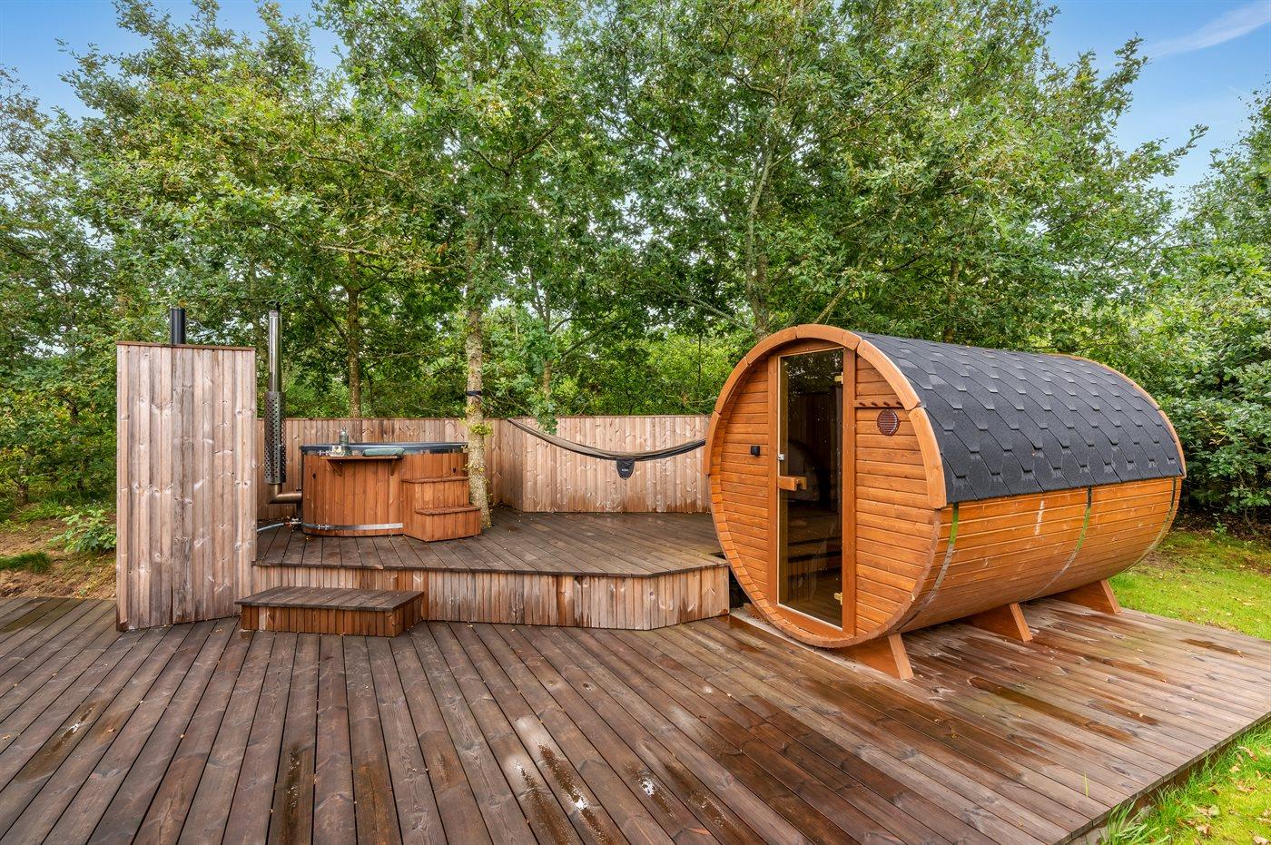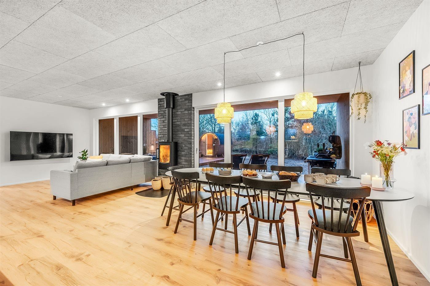 Fra opholdsrummet kan I træde direkte ud på den delvist overdækkede terrasse og nyde udendørslivet i komfortable havemøbler. Forkæl jer selv i det skønne udendørs område med både vildmarksbad, saunatønde og udebruser.