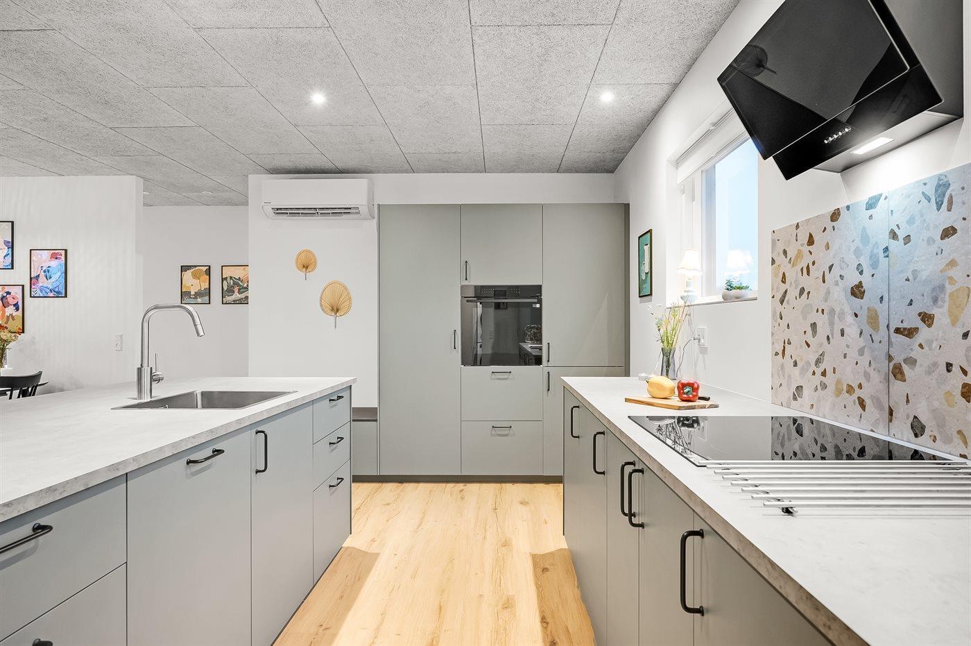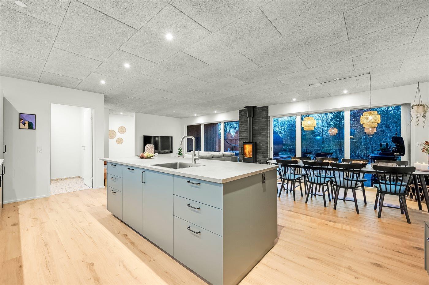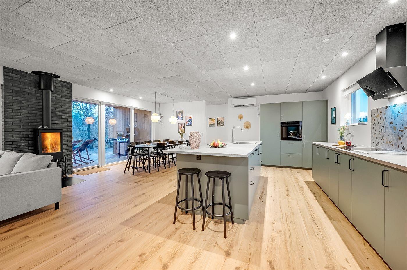 Køkkenet er udstyret med 1 køleskab. Der er 4 induktionskogeplader, varmluftovn, mikrobølgeovn samt opvaskemaskine.
