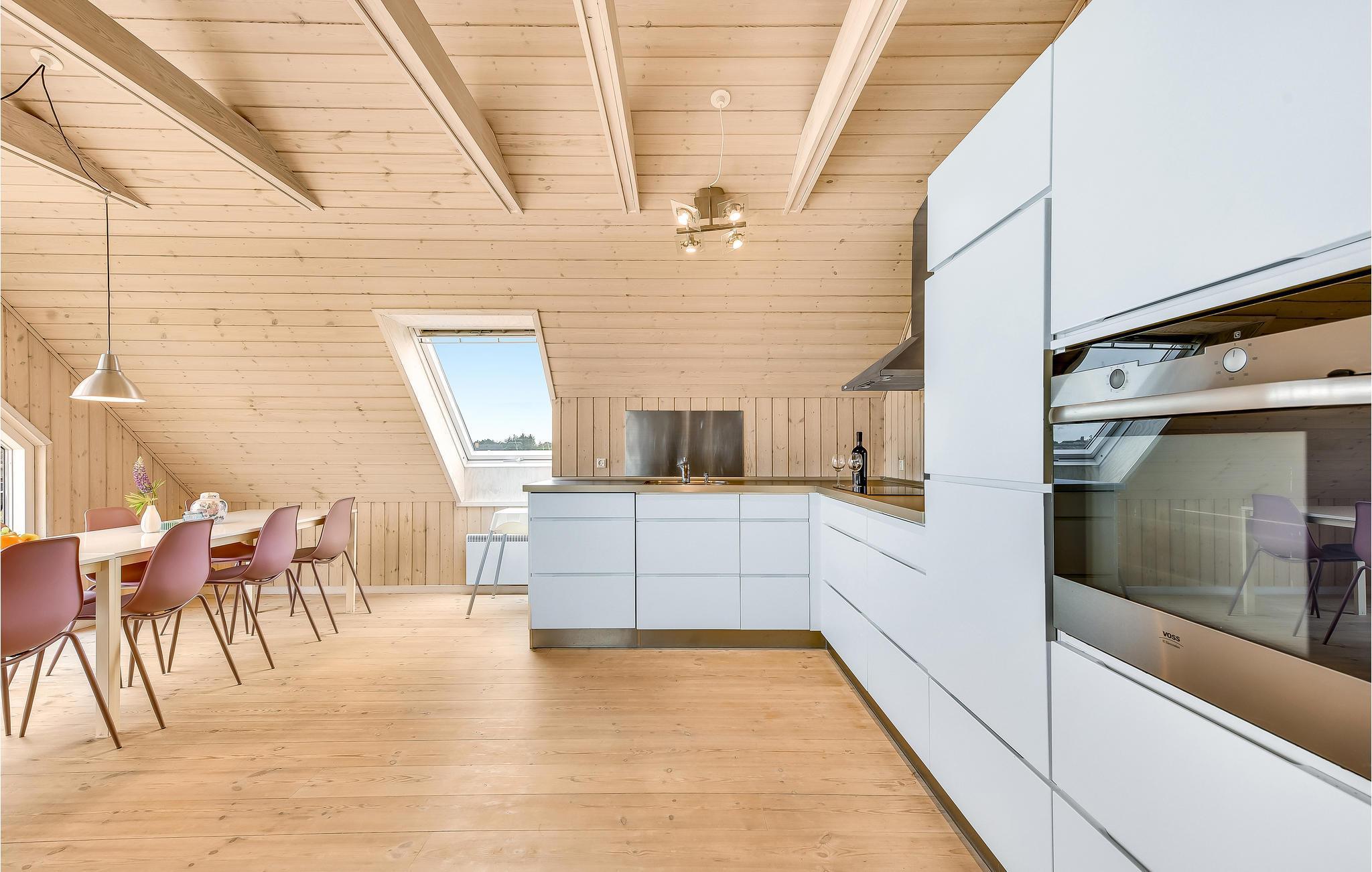 Minimalistisk feriehus med panoramaudsigt over Ringkøbing Fjord og brændeovn i køkken/alrum.