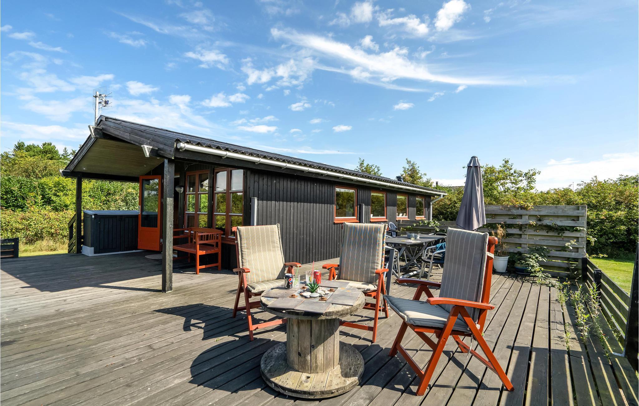 Hyggeligt træhus med udsigt over Ringkøbing Fjord og dejlig terrasse til afslapning i smuk natur.