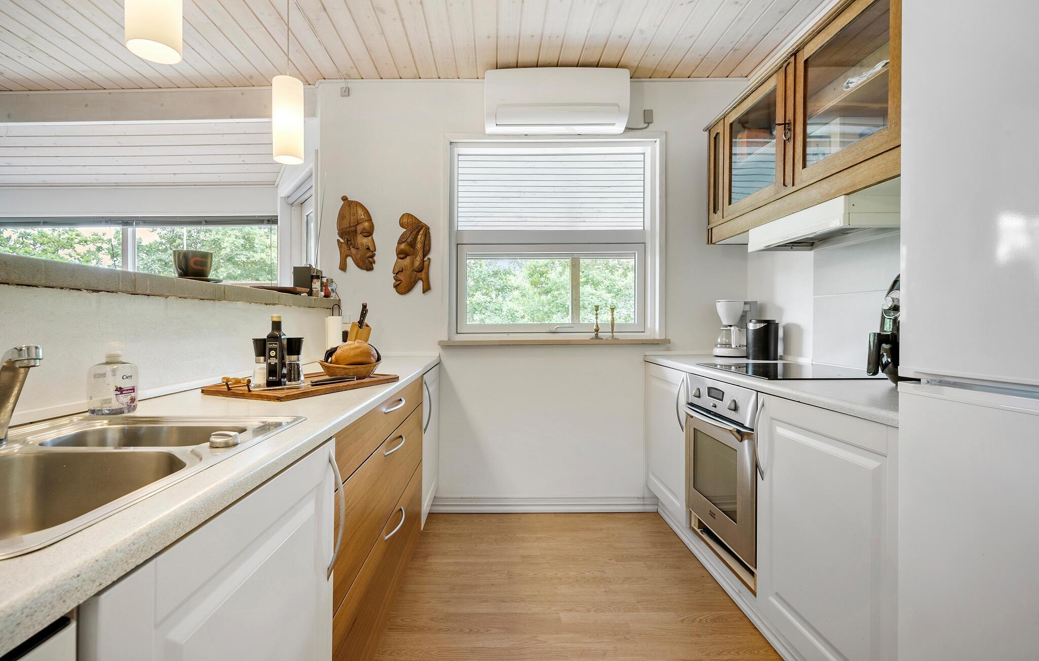 Jeres charmerende hus byder på en komfortabel og hyggelig indretning. Glæd jer til den første kop kaffe om morgenen, som I kan tilberede sammen med morgenmaden i det praktisk indrettede køkken. I det indbydende opholdsområde, udstyret med behagelige lænestole, en sofa og en stilfuld brændeovn, kan I tilbringe hyggelige aftener. Nyd jeres måltider ved det store spisebord, mens I lader blikket vandre ud i det grønne.