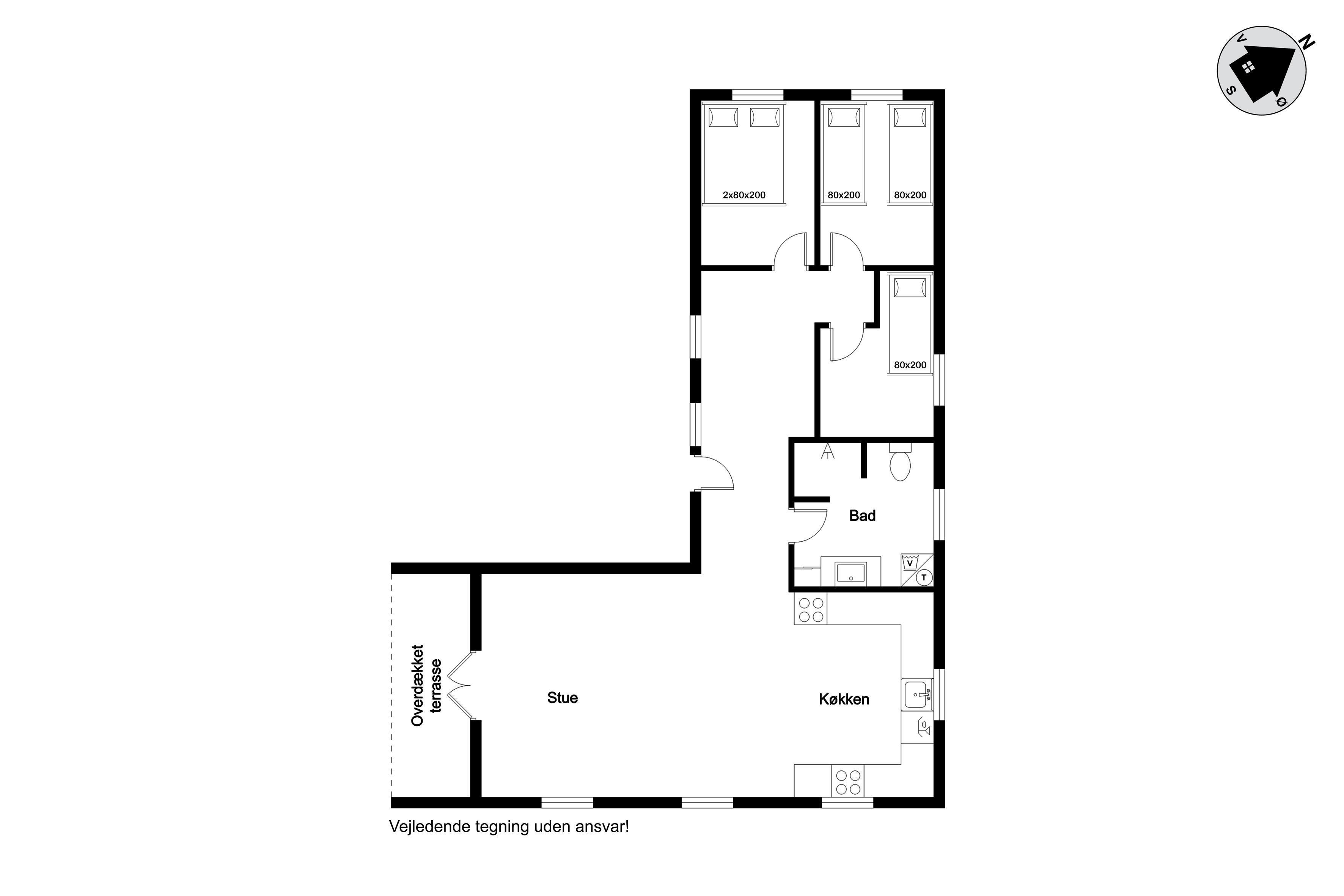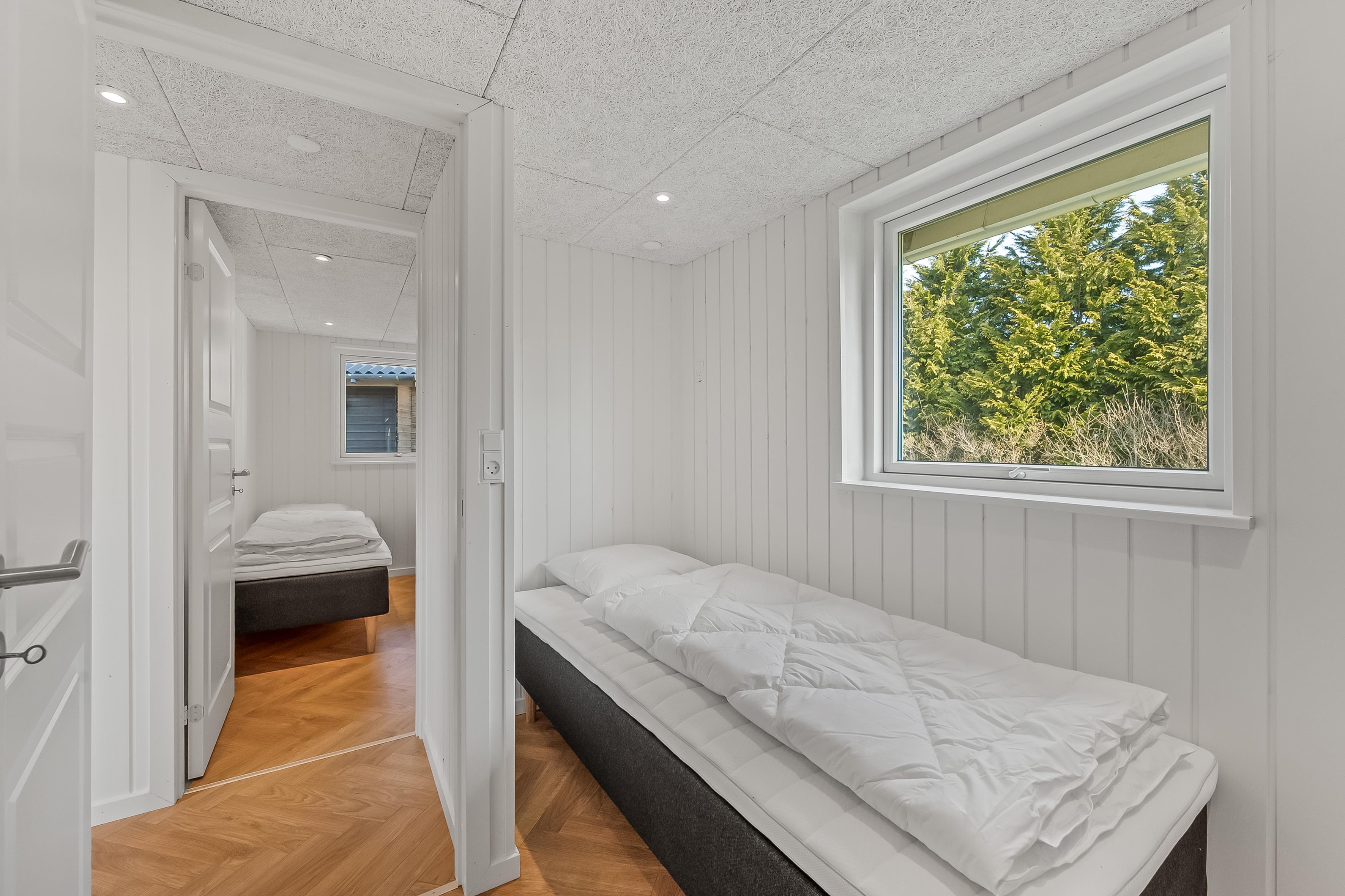 Feriehuset har plads til op til 6 personer, hvilket gør det perfekt til ferie med familie eller venner. Der er tre soveværelser, herunder to med dobbeltsenge og et med en enkeltseng, så der er plads til både par og enkeltpersoner. Hvert værelse er lyst og indbydende, med fokus på komfort og afslapning. Badet er veludstyret med gulvvarme, bruser og toilet, hvilket gør det til et behageligt sted at friske sig op efter en lang dag.