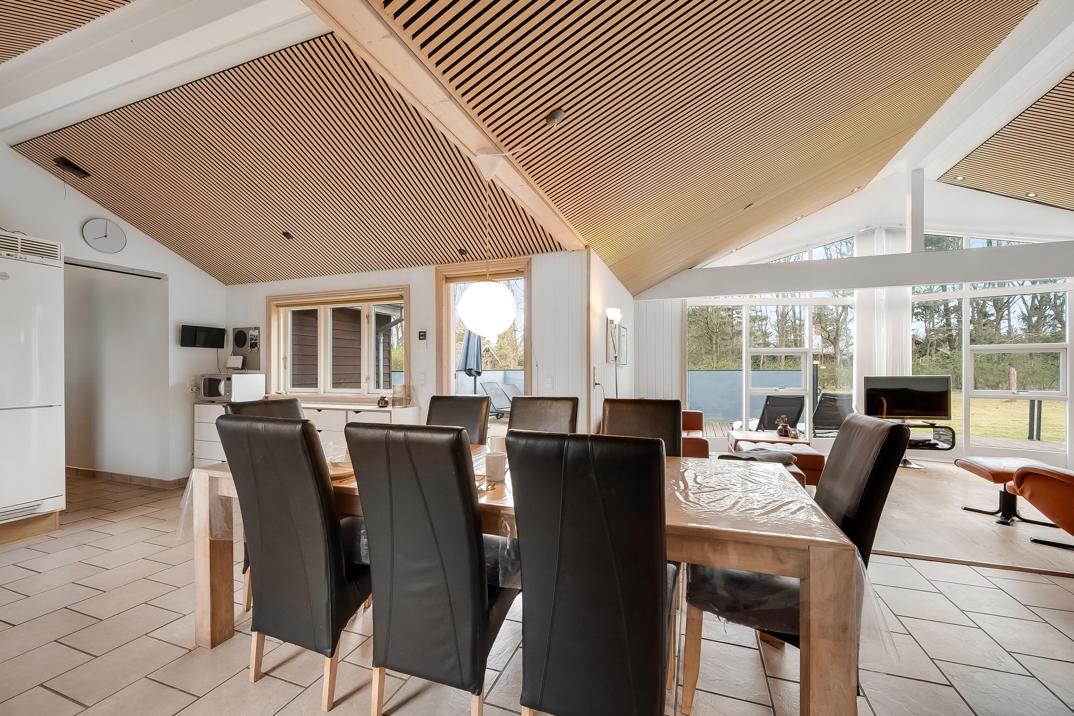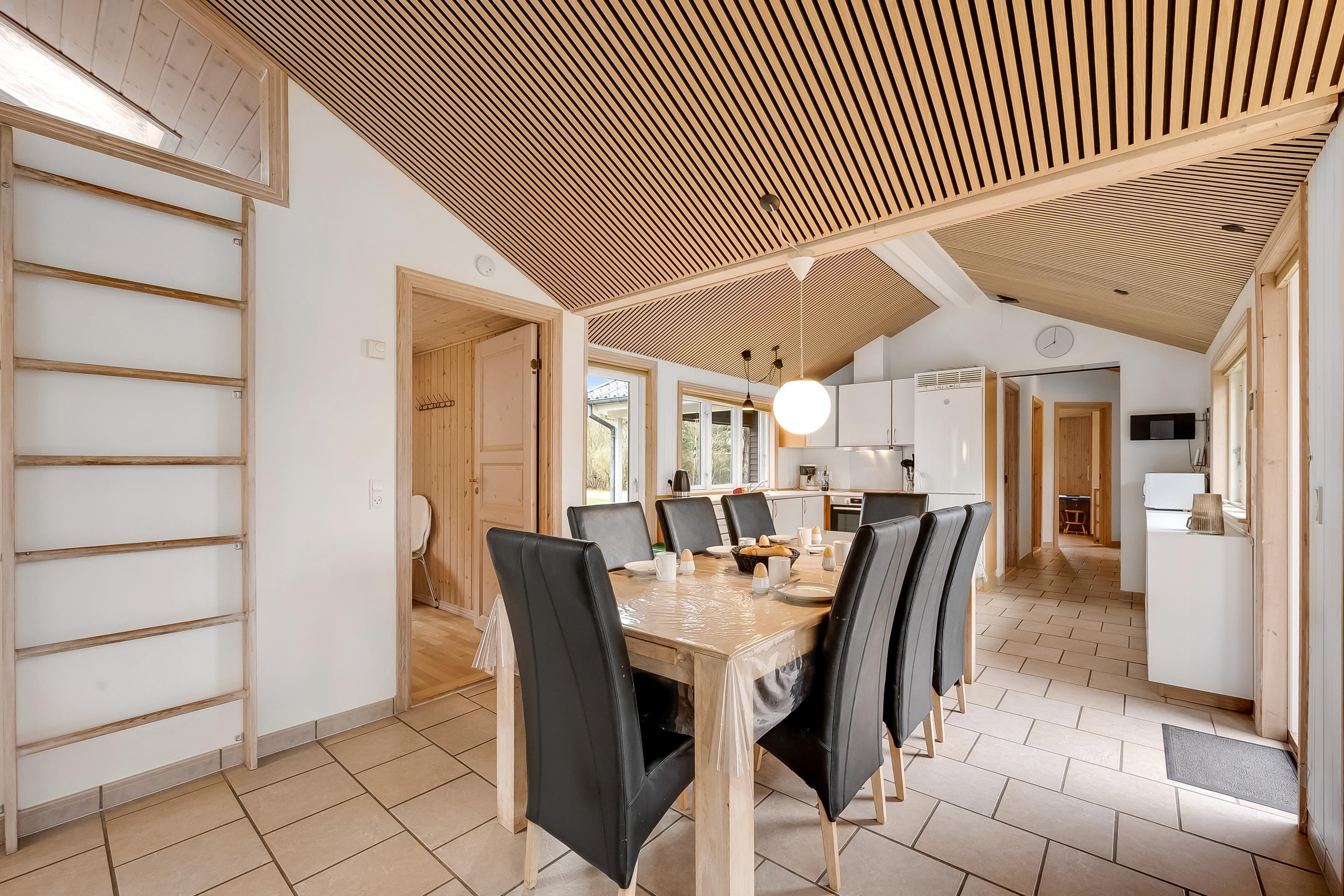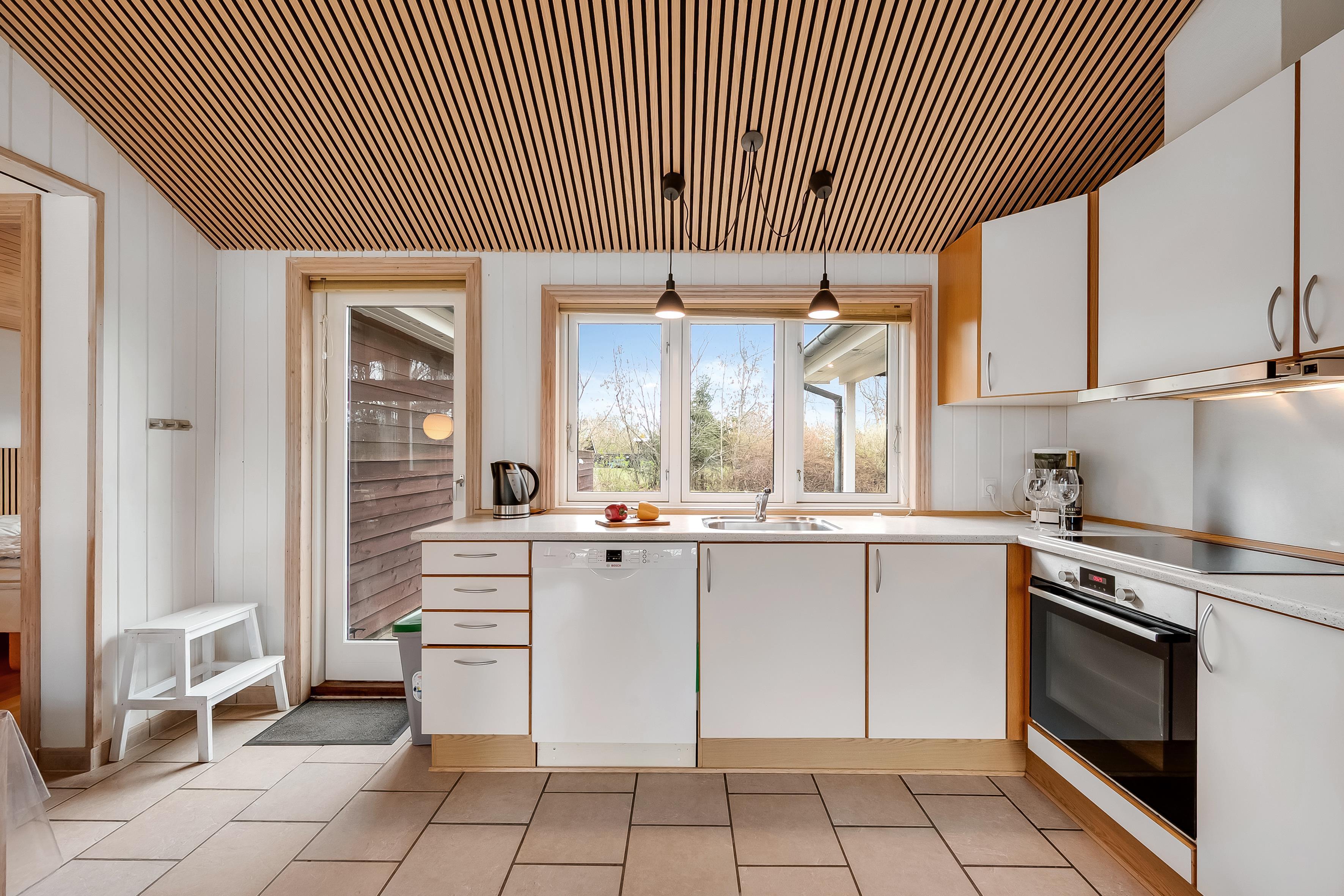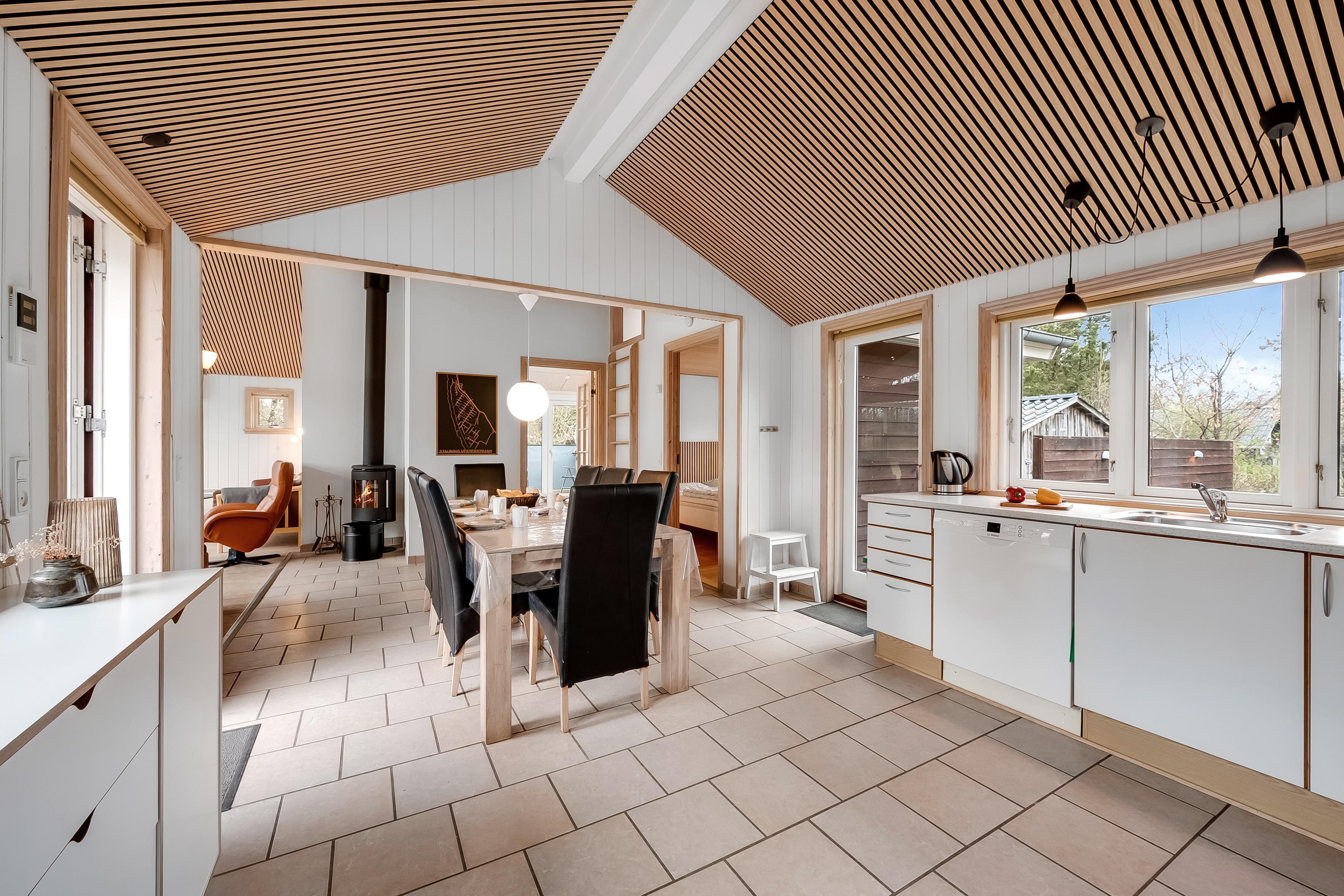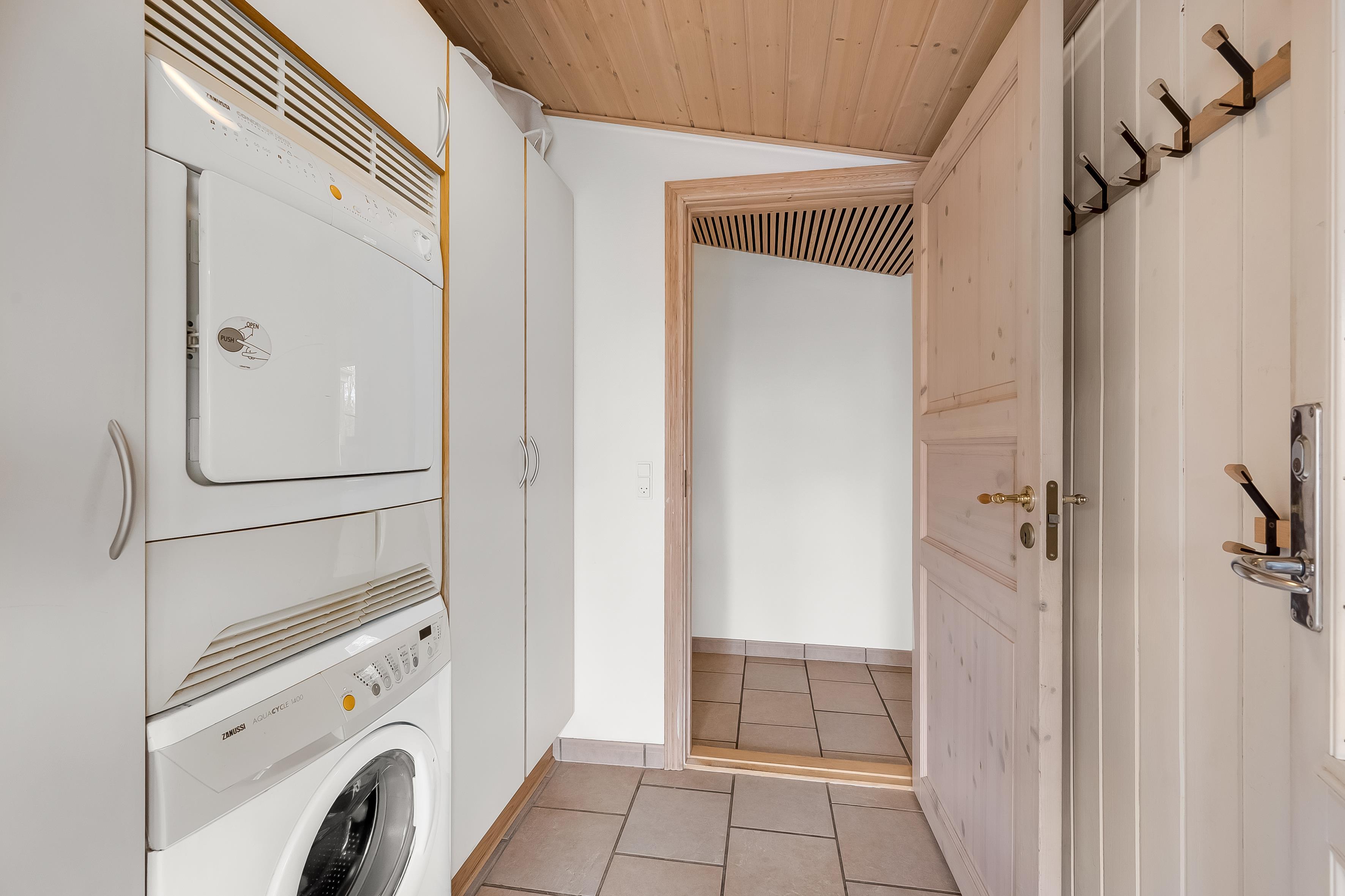 Indenfor finder du et moderne og veludstyret køkken, som er udstyret med keramisk komfur, ovn, mikrobølgeovn, opvaskemaskine, køleskab og fryser med en kapacitet på 100 liter. Dette gør det let at tilberede lækre måltider til hele familien. Der er også en vaskemaskine og tørretumbler til rådighed, så du kan holde dit tøj friskt under dit ophold.