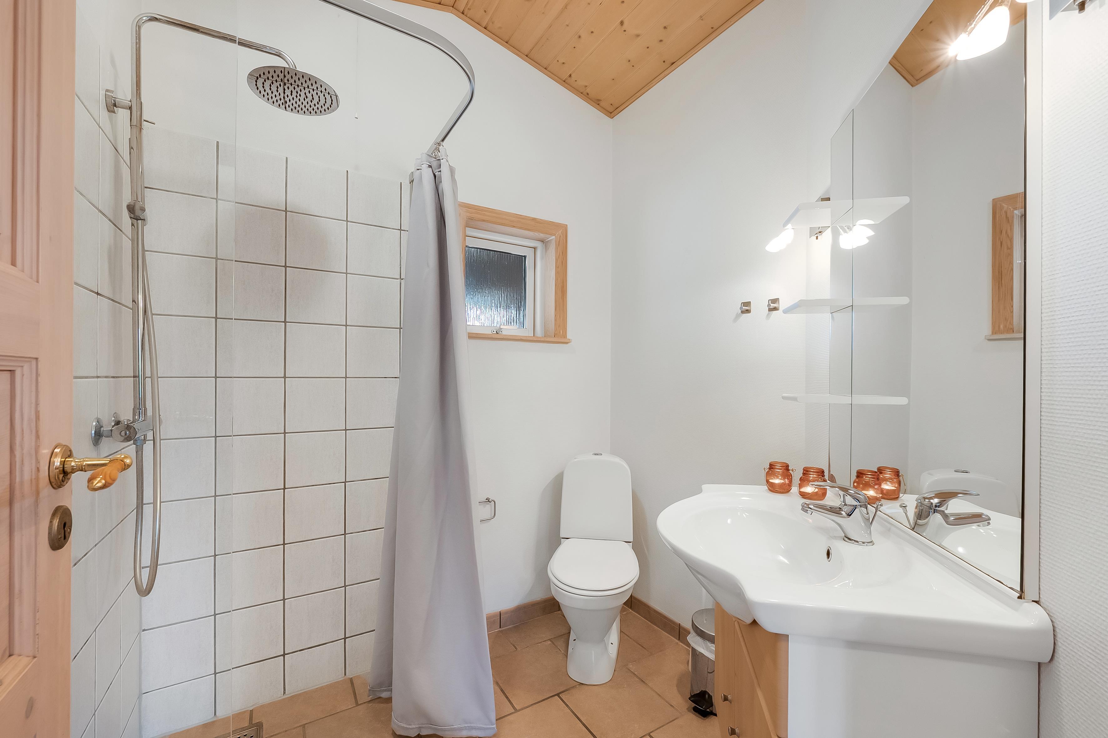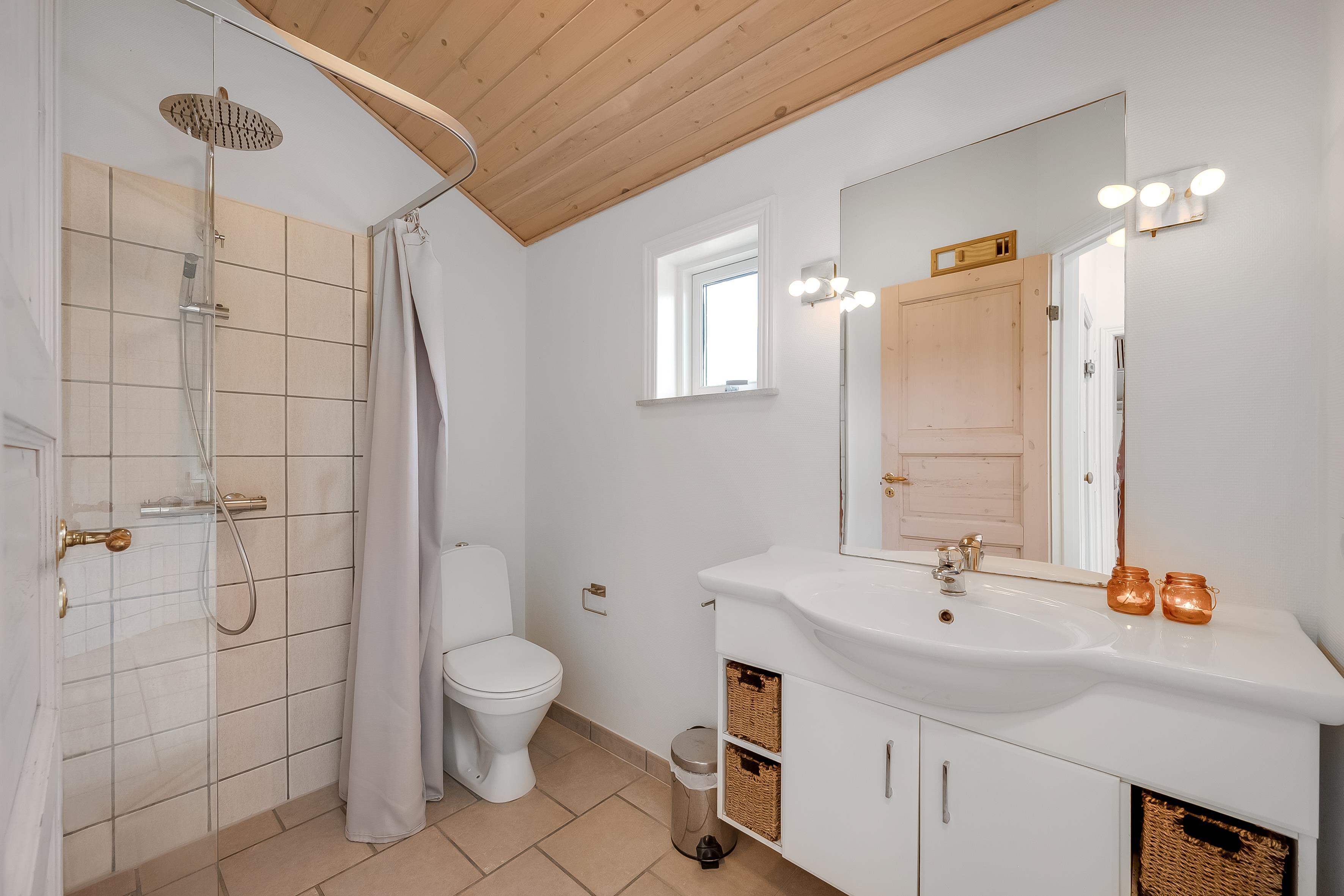 Badeværelserne er moderne og funktionelle, med toilet og bruser. Gulvvarme på badeværelset sikrer, at du altid har det behageligt, mens du gør dig klar til dagens eventyr. Huset er også udstyret med en energibesparende varmepumpe som også kan fungere som aircondition, så du kan justere temperaturen efter dine præferencer.