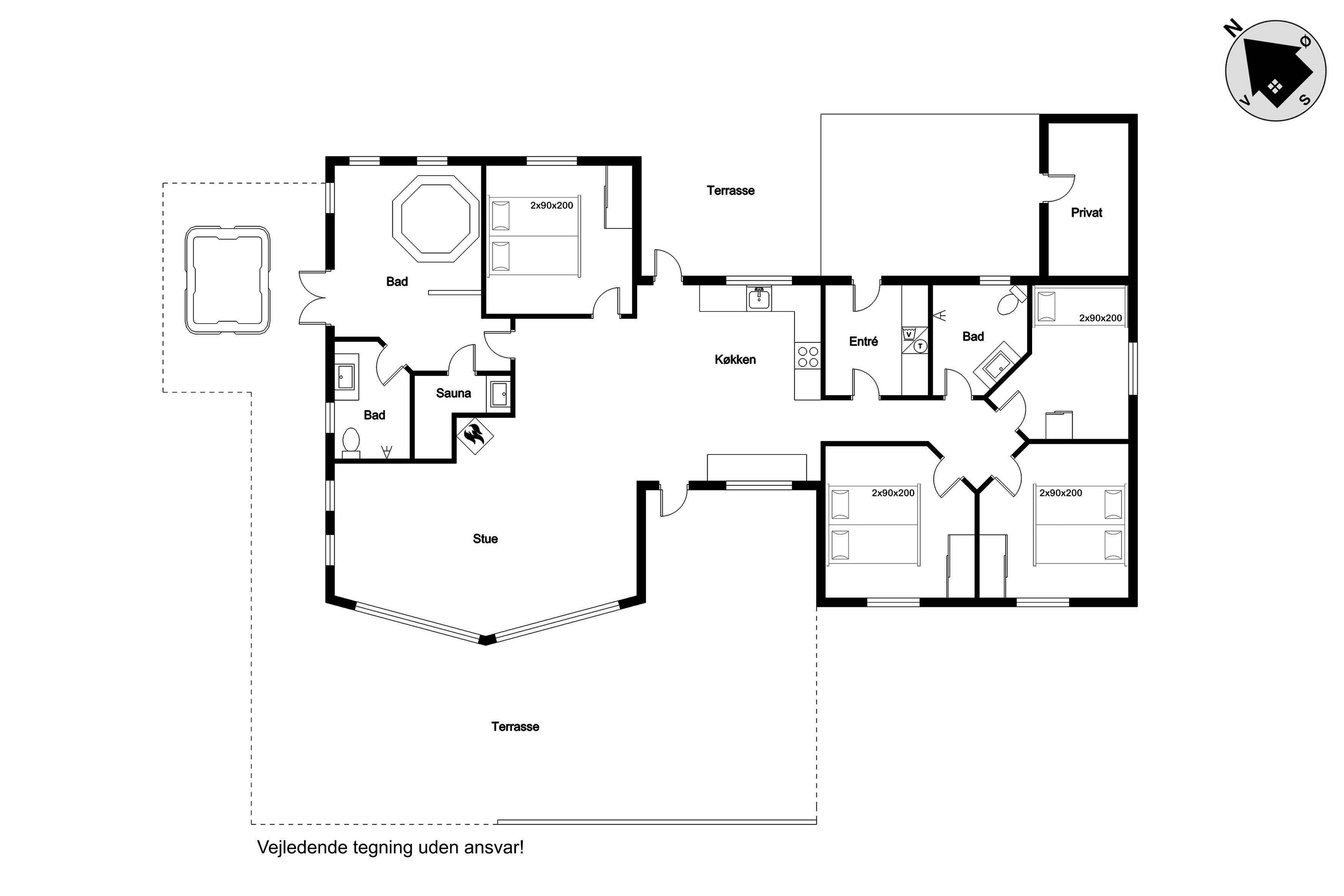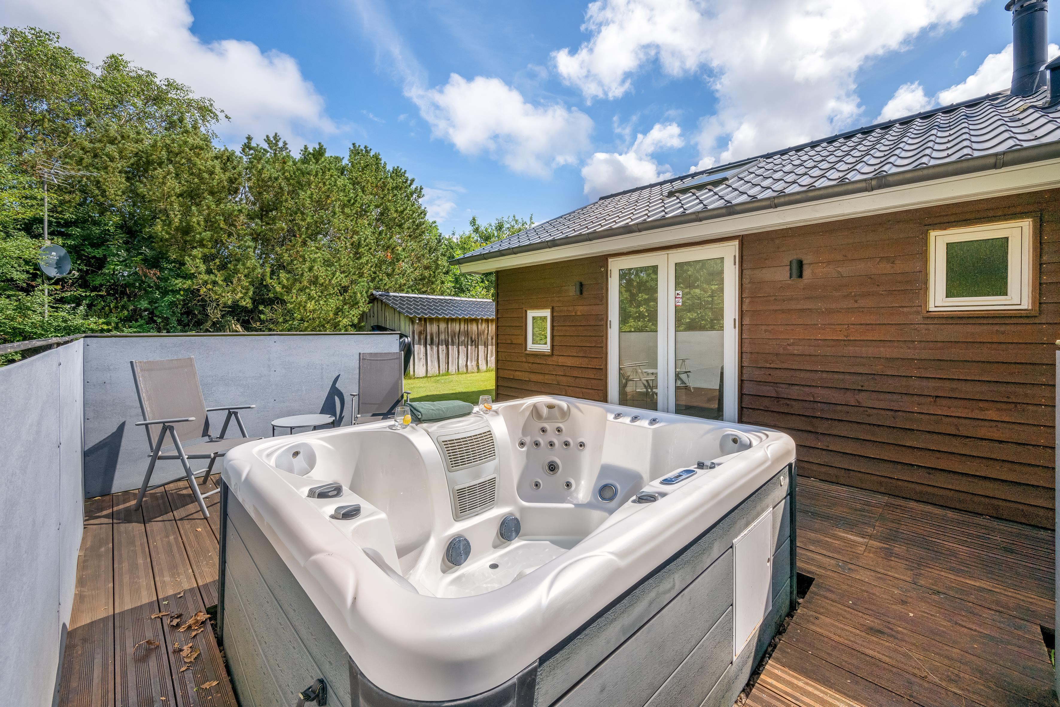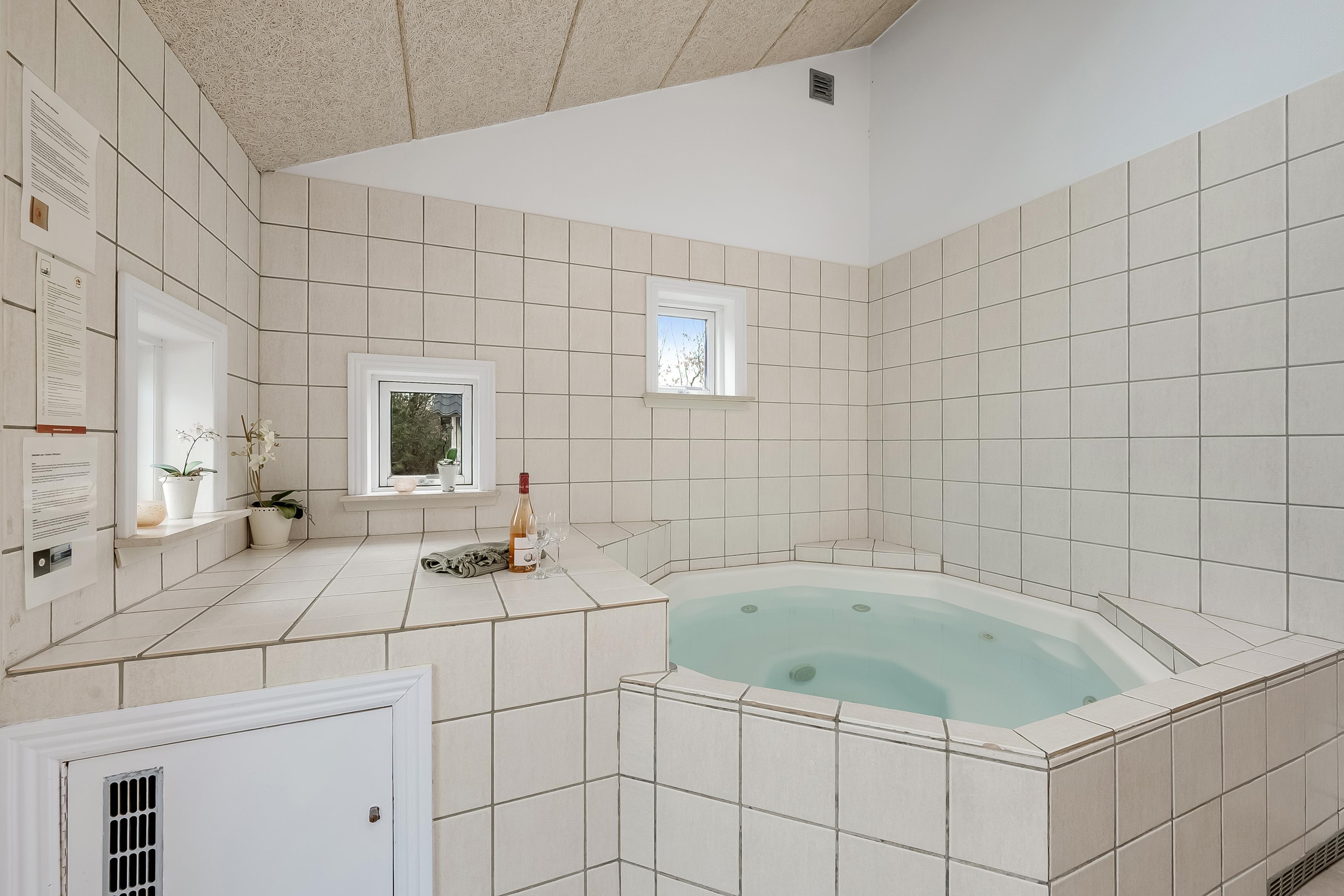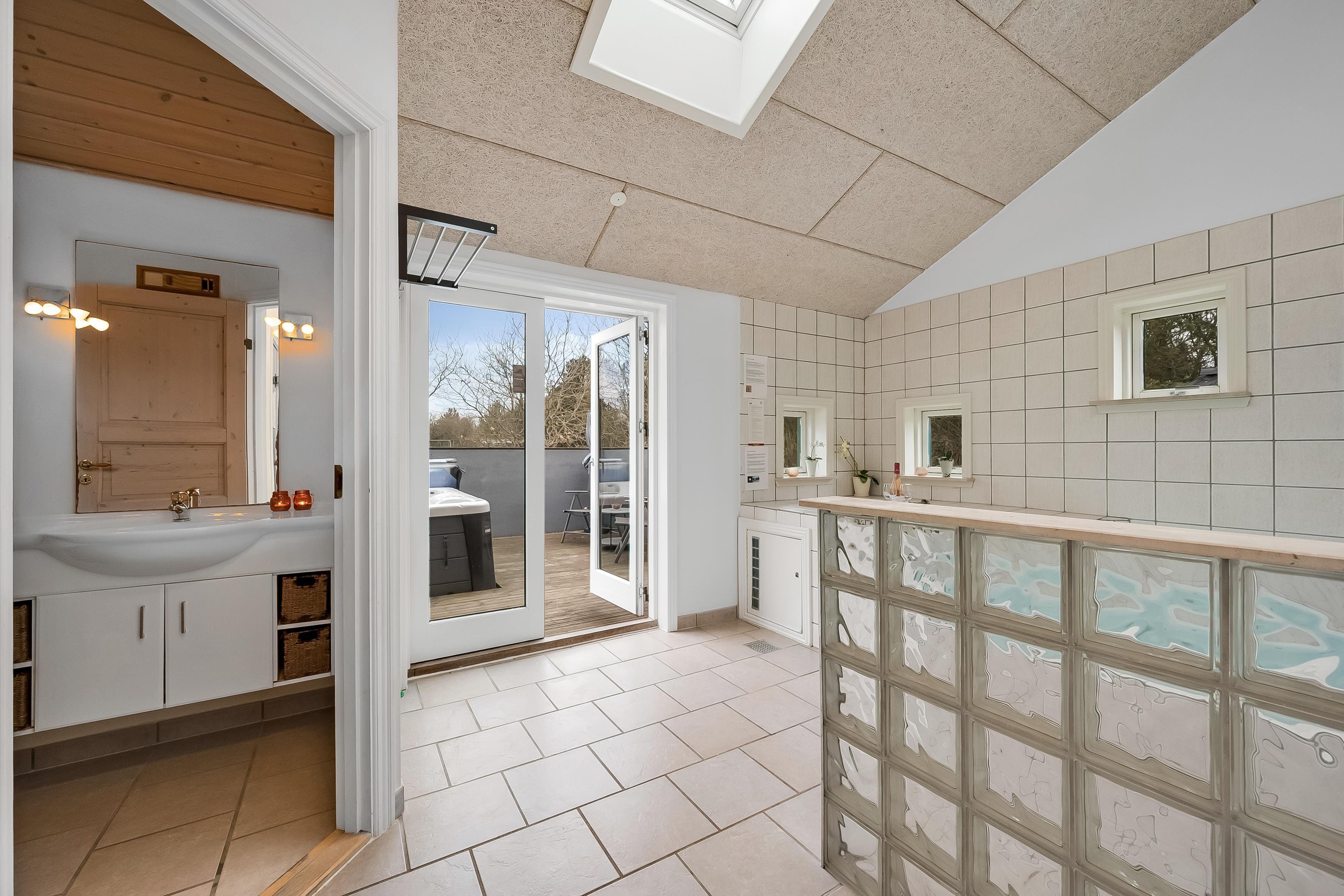 For dem, der ønsker at slappe af, er der både et indendørs og udendørs spa, hvor op til 6 og 5 personer kan nyde en dejlig boblebadoplevelse. Desuden findes der en sauna til dem, der ønsker at forkæle sig selv med en afslappende session. Den overdækkede terrasse og den åbne terrasse er perfekte til udendørs spisning eller blot at nyde det gode vejr.