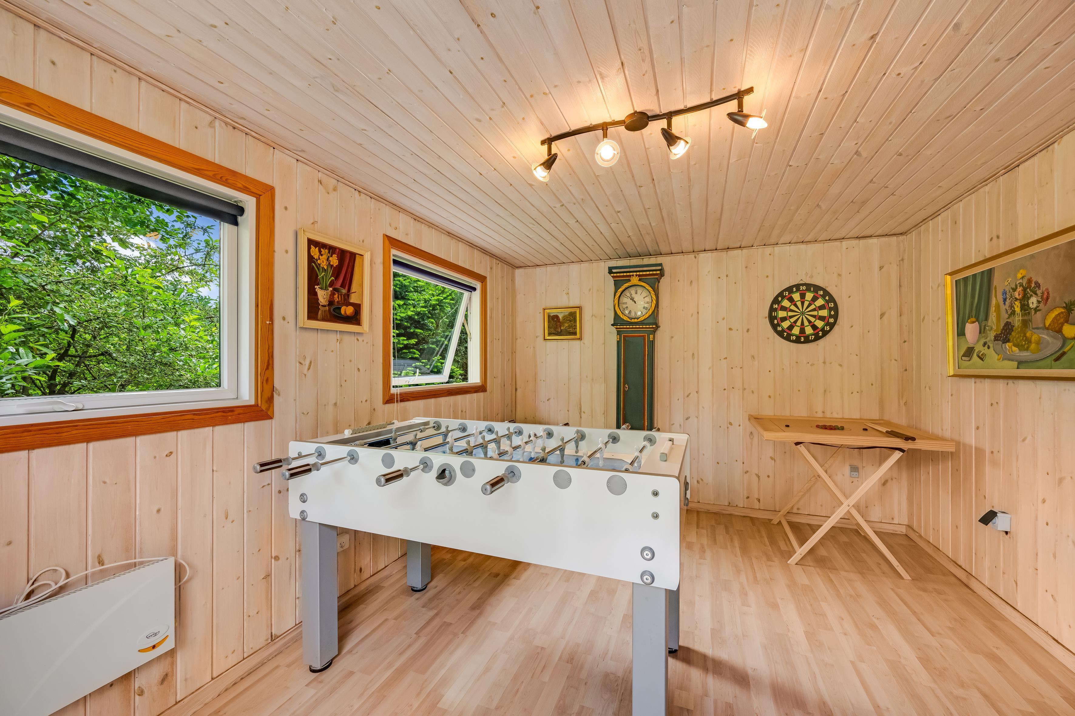 For dem, der ønsker at slappe af og nyde naturen, tilbyder huset en overdækket terrasse, hvor du kan nyde dine måltider udendørs, uanset vejret. Der er også en lukket terrasse, som giver mulighed for privatliv, samt en stor naturgrund med gynger og en sandkasse for børnene. Det udendørs område inkluderer et bordtennisbord, bålsted og en grill, ideelt til hyggelige sommeraftener med familie og venner.
