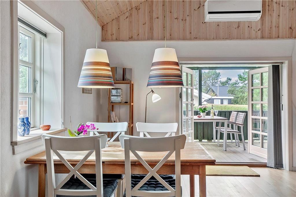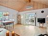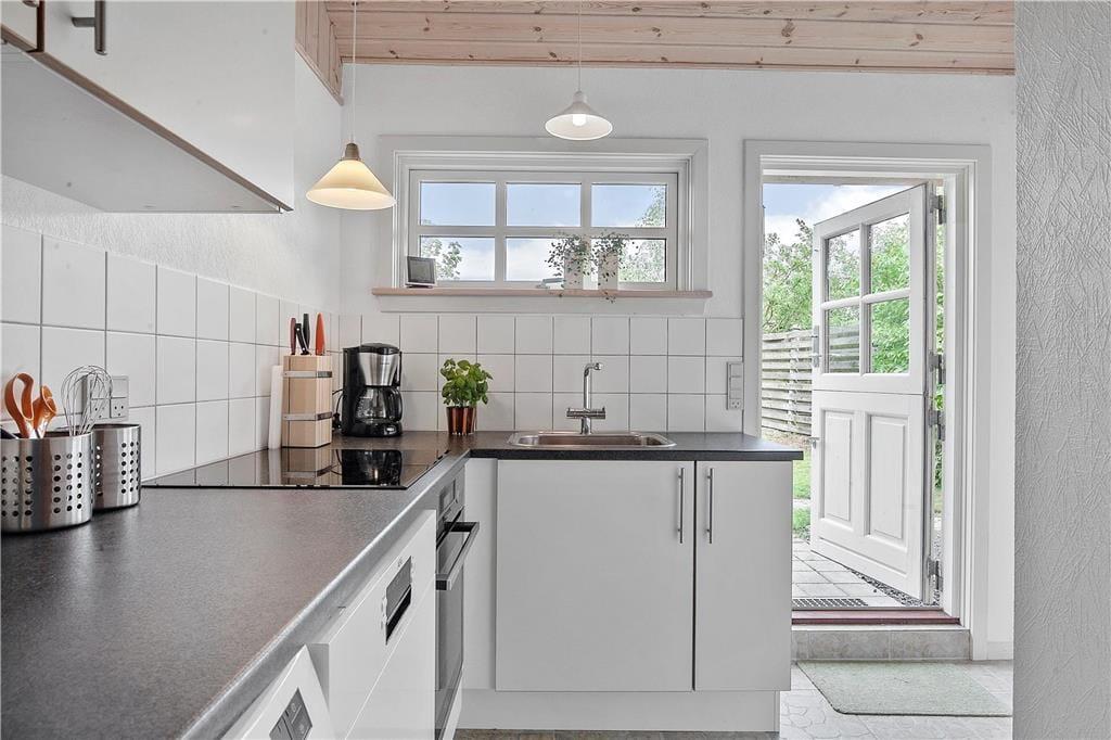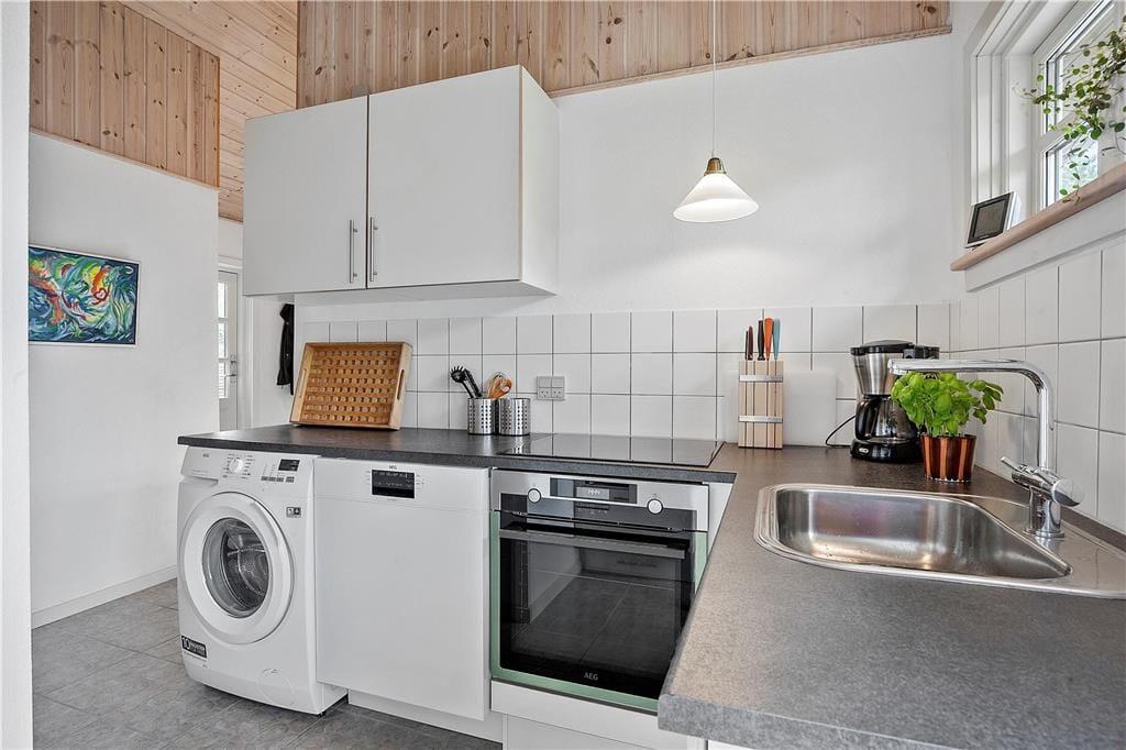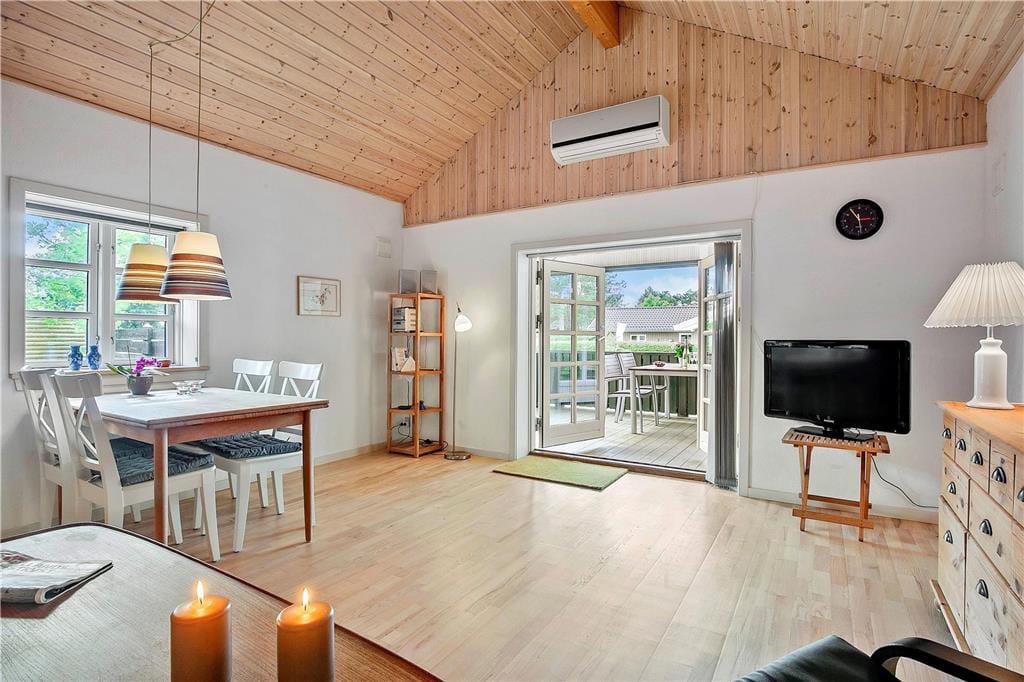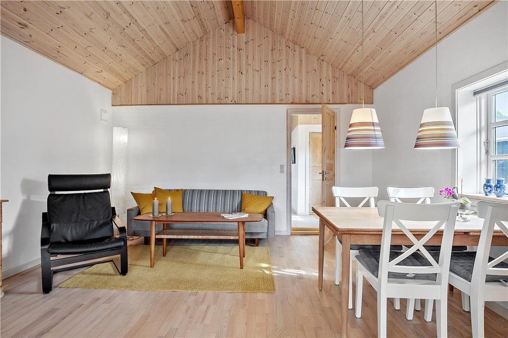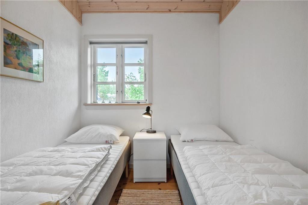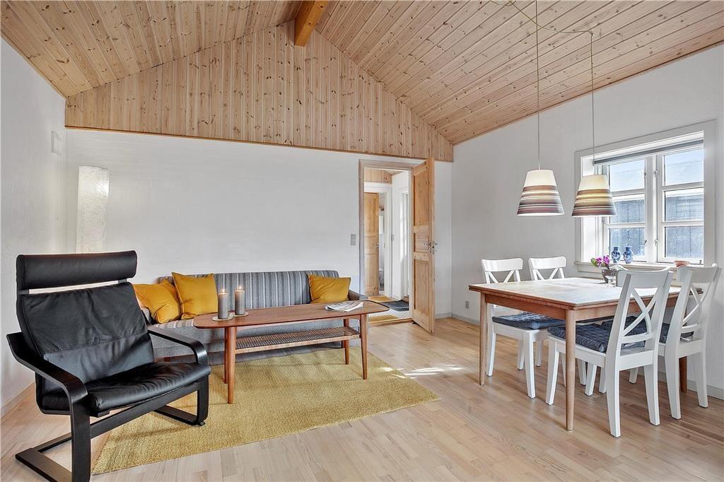 Feriehuset som er nyrenoveret indeholder separat køkken og opholdsstue. Lyst godt indrettet køkken med udgang til fliseterrasse, indeholder indbygget ovn, keramiske kogeplader, opvaskemaskine, køleskab med lillefryseboks, mikroovn og vaskemaskine. Opholdsstue med udgang til terrasse, hyggelig spiseplads, sofa, TV med boxer abonnement og Chromecast. Badeværelse med klinkegulv, bruseniche og gulvvarme. 2 soveværelser, 1 med dobbeltseng og et med 2 enkeltsenge. Huset opvarmes med varmepumpe og elvarme.