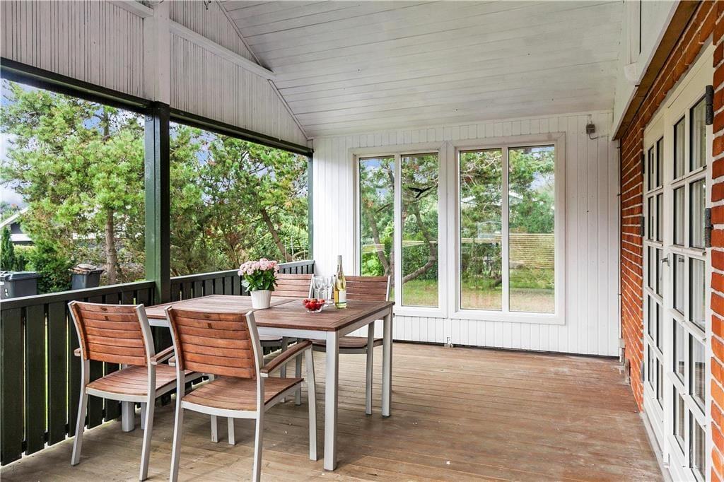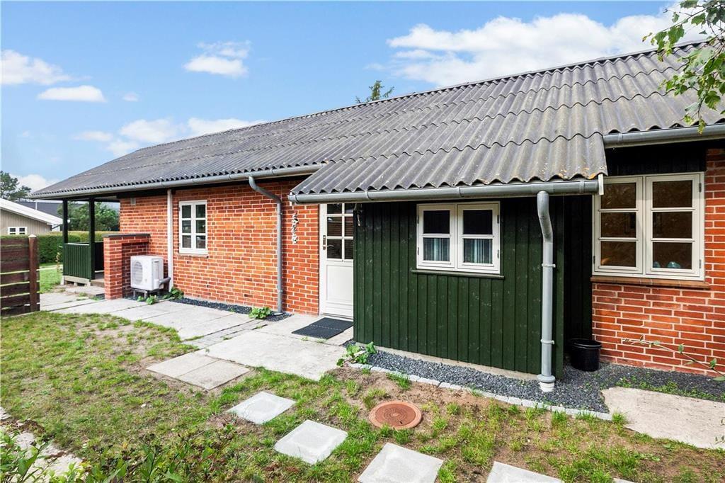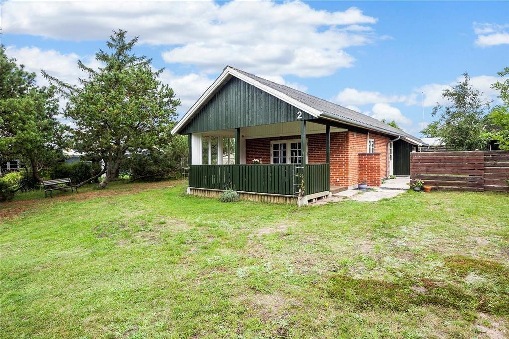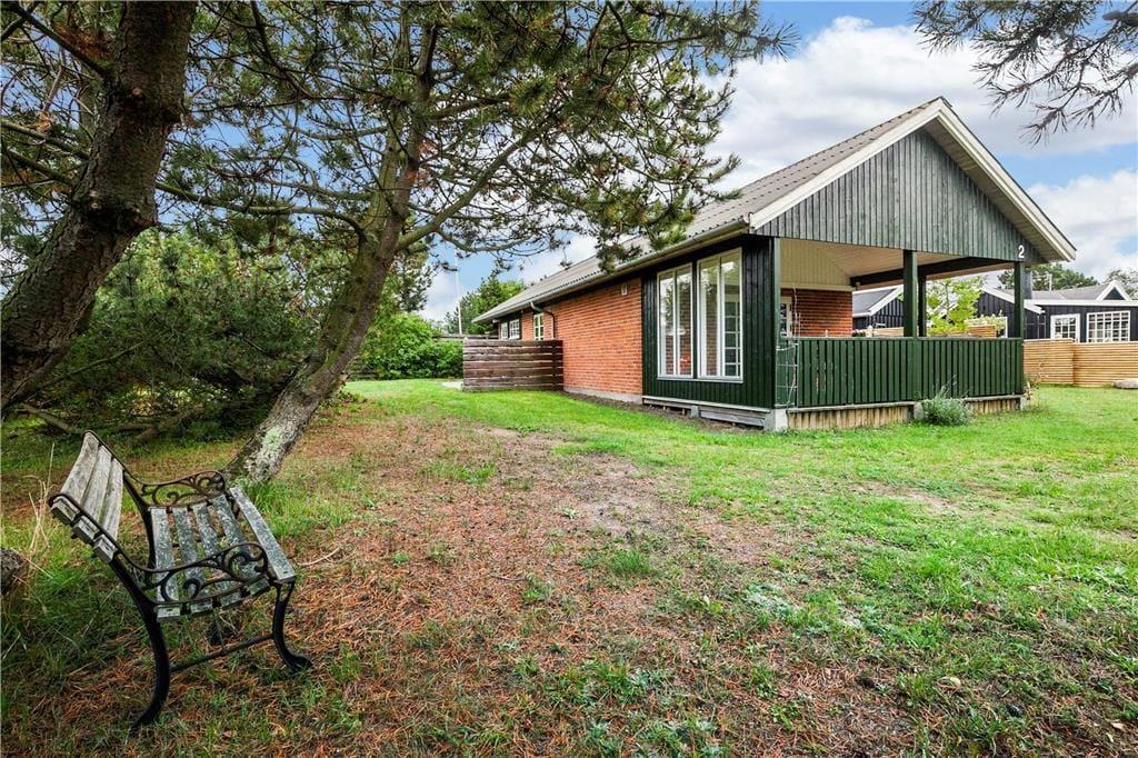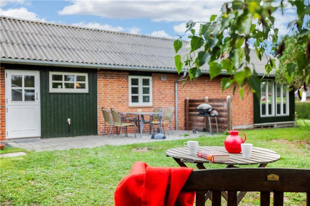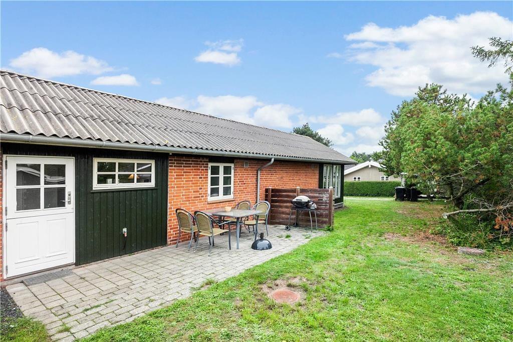 Huset har en 498 m2 grund, og en delvis 17 m2 overdækket træterrasse og en åben fliseterrasse. Ved feriehuset er der havemøbler og gasgrill