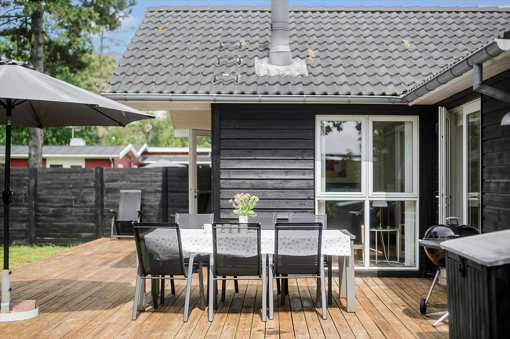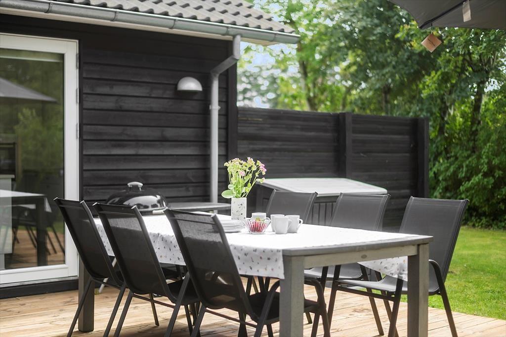 Feriehuset har en dejlig næsten indelukket grund på 670 m3 med en skøn have, hvor der er plads til leg og afslapning. Der er en delvist overdækket træterrasse, hvorfra man kan nyde solen i fulde drag og få gang i grillen til aften. Ved feriehuset er der havemøbler, liggestole, parasol og grill.