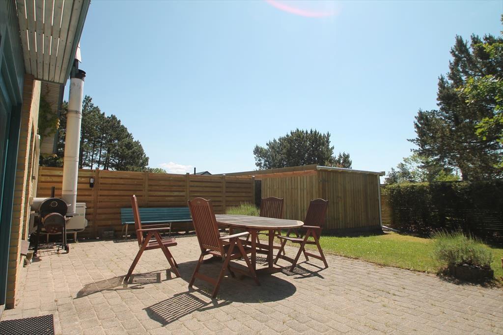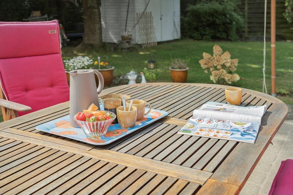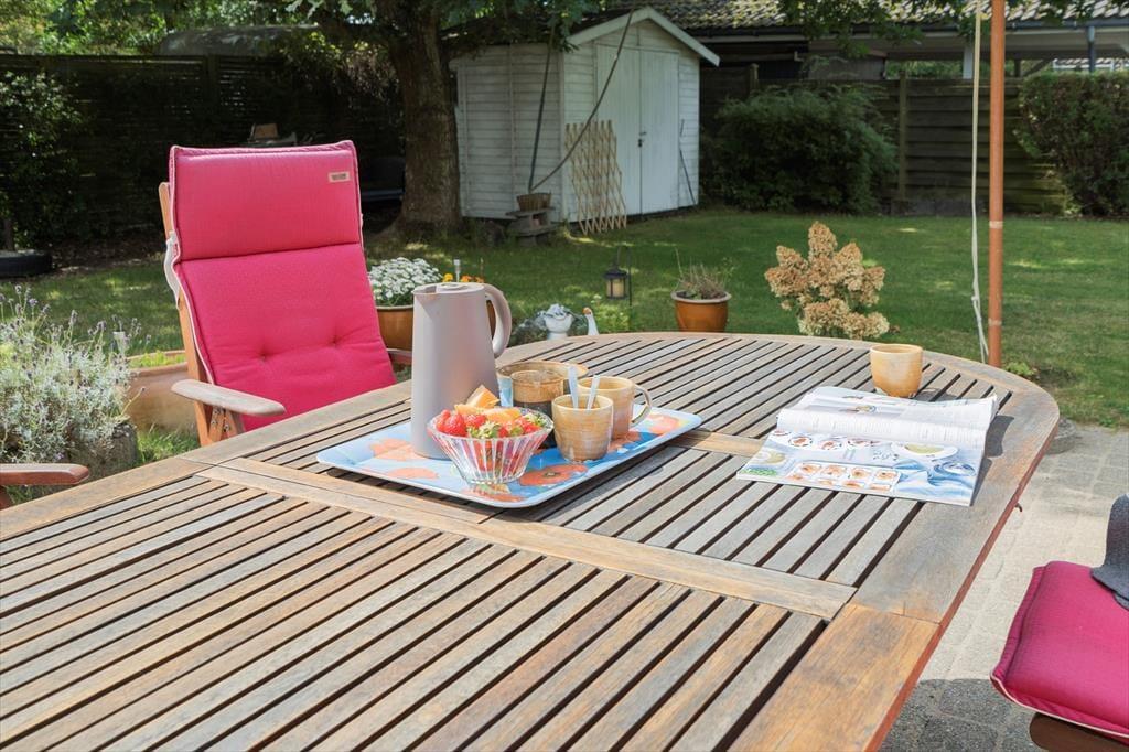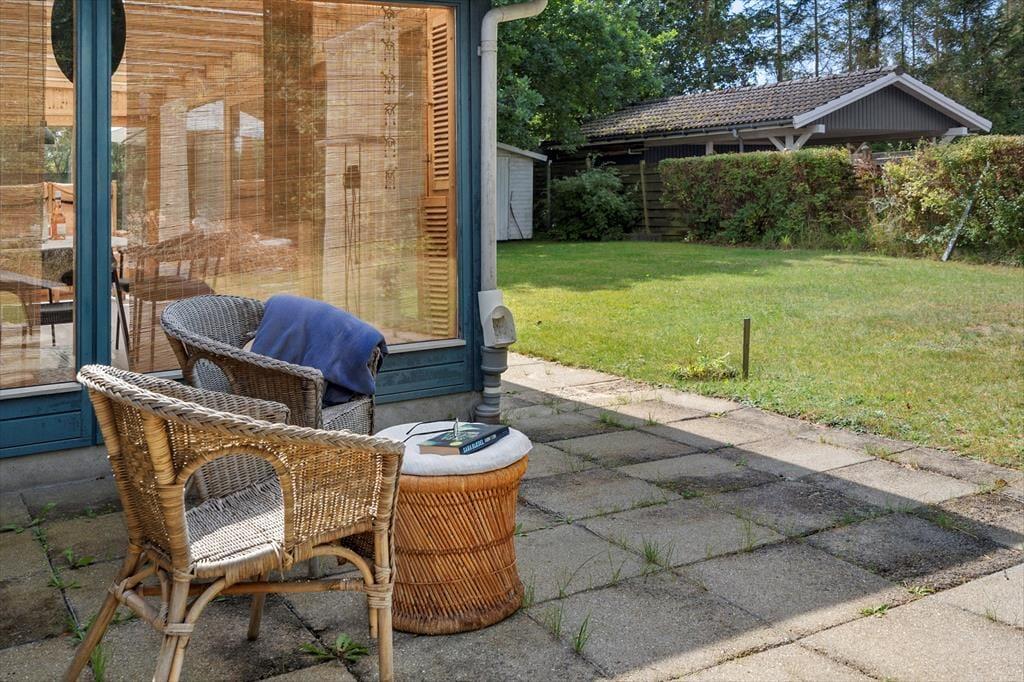 Den 1000 m² store grund, hvor hunden kan løbe rundt, rummer en skøn have, og en hyggelig terrasse, perfekt til afslapning. Her finder du også havemøbler, parasol og en grill, som giver mulighed for dejlige udendørs måltider.