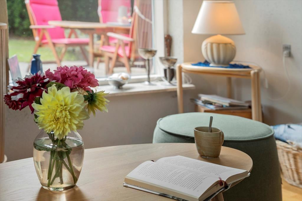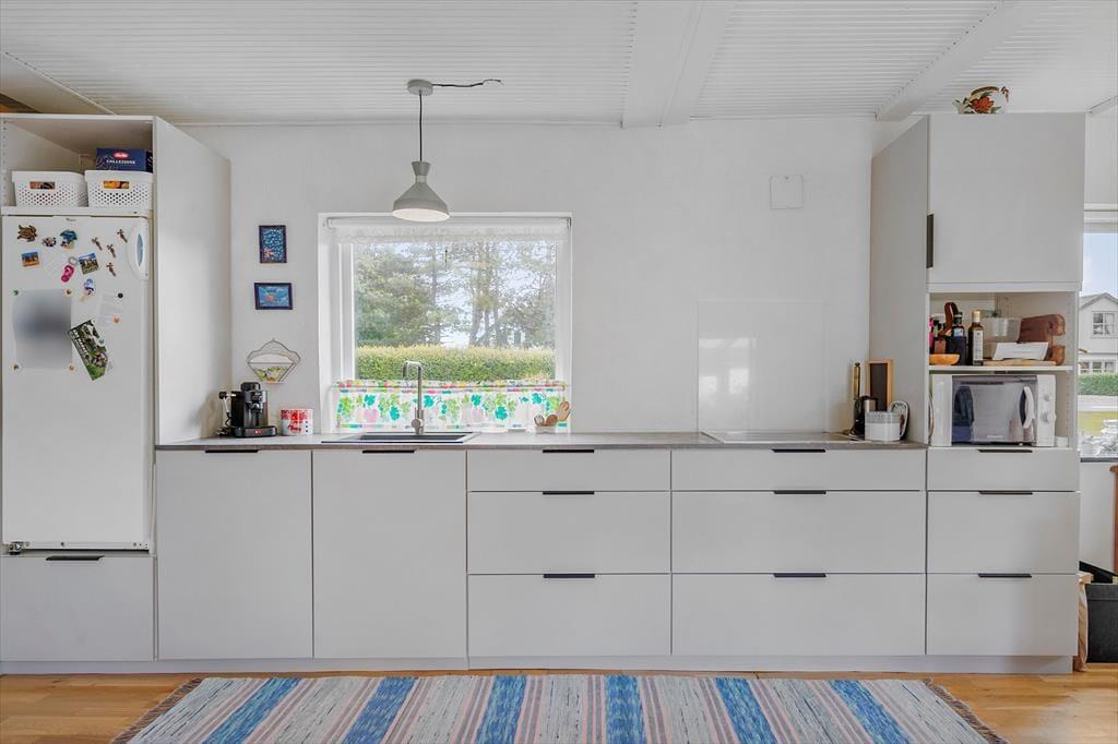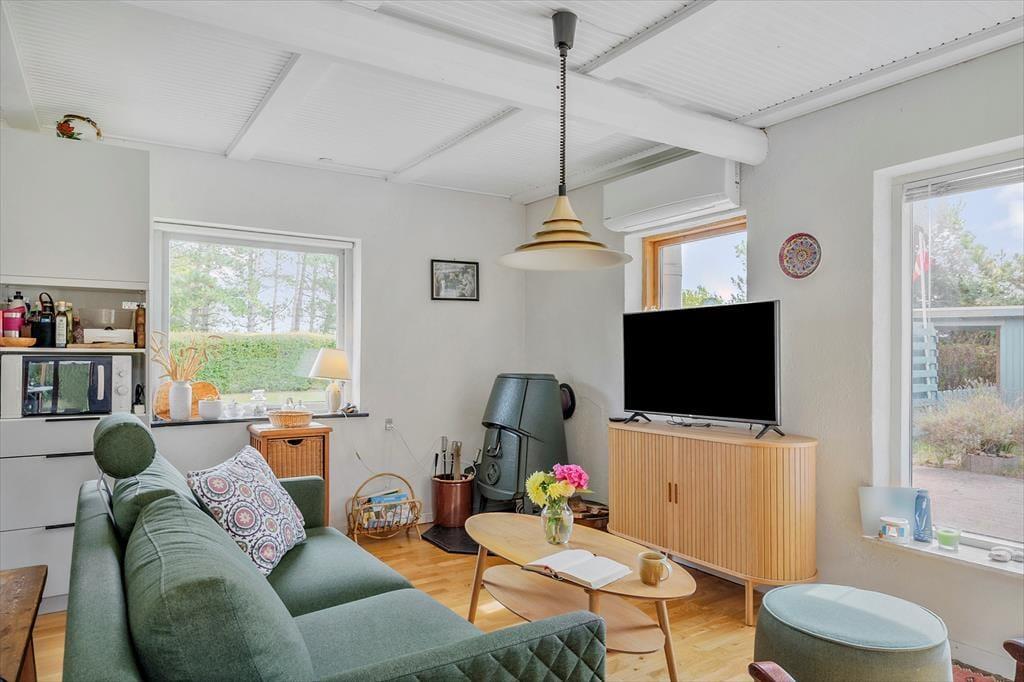 Feriehuset byder på en indbydende kombination af køkken og opholdsstue, der skaber en hyggelig atmosfære. Det lyse, moderne køkken fra 2021 er veludstyret med kogeplader, mikroovn, opvaskemaskine og køleskab og fryser, hvilket gør madlavning til en leg. I den tilstødende opholdsstue kan du slappe af med direkte adgang til terrassen, en charmerende spiseplads samt komfortable sofaer og lænestole. Her finder du også et TV med Norlys TV-pakke, der tilbyder både danske, svenske og norske kanaler, samt en Chromecast, så du kan streame dine yndlingsprogrammer (kræver eget abonnement). Udestuen som forlænger sommeraftenerne er et ekstra plus, og er udstyret med bord og stole. Badeværelset er udstyret med klinkegulv, bruseniche og vaskemaskine. Soveværelset byder på en dobbeltseng og en enkeltseng, som let kan trækkes ud til en dobbeltseng. Huset opvarmes effektivt med varmepumpe, brændeovn og elvarme, hvilket sikrer komfort året rundt.