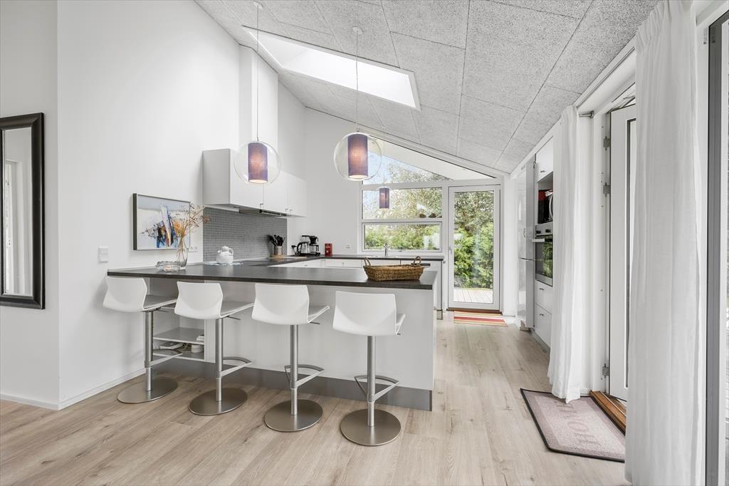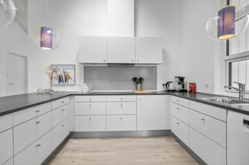 Velkommen indenfor: Træd ind i den lyse entre med fin skabsplads, videre til værelserne og den dejlige opholds- og spisestue med en hyggelig atmosfære i det åbne køkken. I det moderne køkken, finder du alt, hvad du behøver til madlavning og spisning. Huset har desuden 3 gode soveværelser og to badeværelser, så der er der god plads og luft til hele familien. To soveværelser har hver en komfortabel dobbeltseng, mens det sidste har køjeseng og en enkeltseng, helt perfekt til børnene. De to badeværelser er hver udstyret med en bruseniche, toilet og håndvask. Vaskemaskine og opvaskemaskine er med til at gøre opholdet mere bekvemt - og ferien bliver kun mere behagelig med muligheden gulvvarme på badeværelset, så du altid kan nyde varme og komfort - selv på de køligste dage.